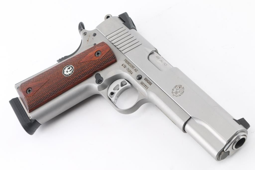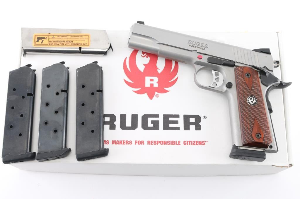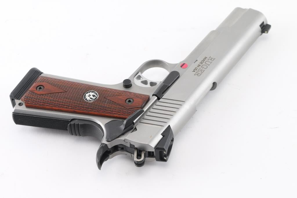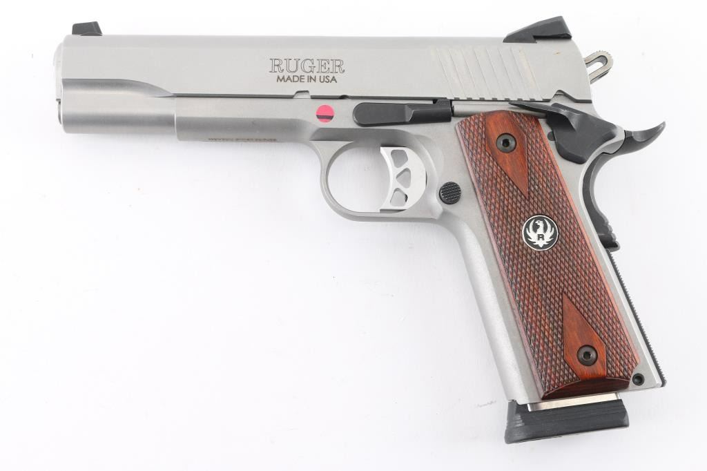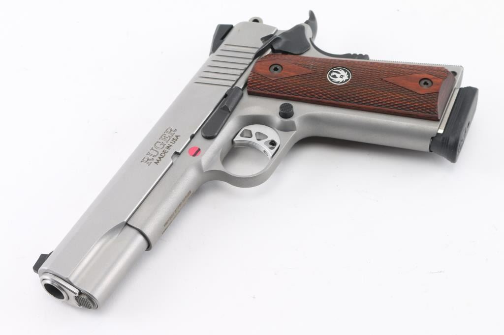 This is a modern 1911 from Ruger chambered in .45 ACP. It is stainless construction with a matte finish and a 5" barrel. The bore is excellent/bright. It has checkered hardwood grips and black grip screws with silver Ruger medallions. The gun has a skeletonized hammer and adjustable trigger, serrated hammer spur, oversized beavertail grip safety, knurled mainspring housing, .0rear slide serrations and drift adjustable Novak 3 dot sights. Overall excellent condition. It comes with five magazines, soft case, owners manual, lock, take down tool and original box. Condition NRA Excellent Modern Firearm