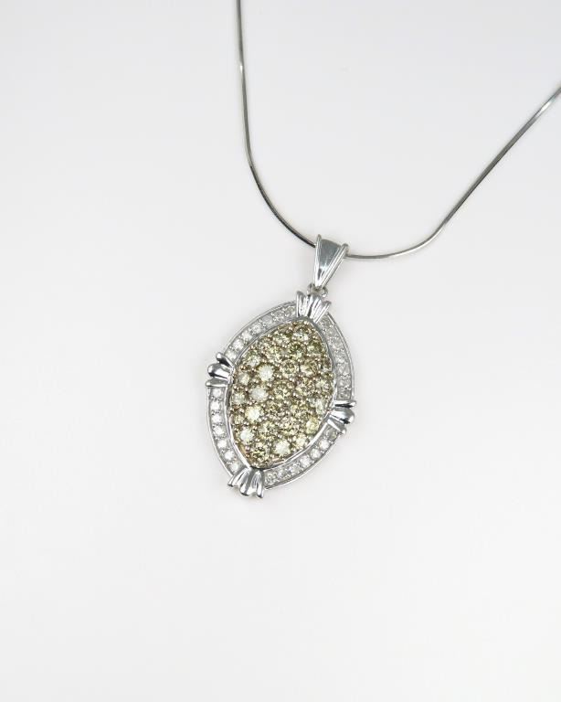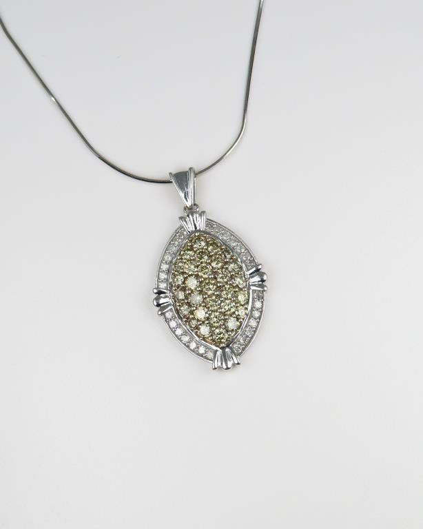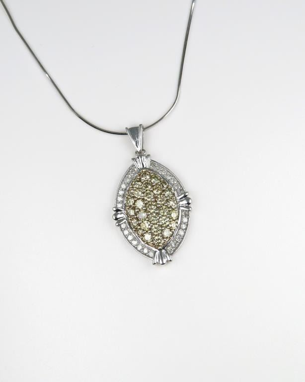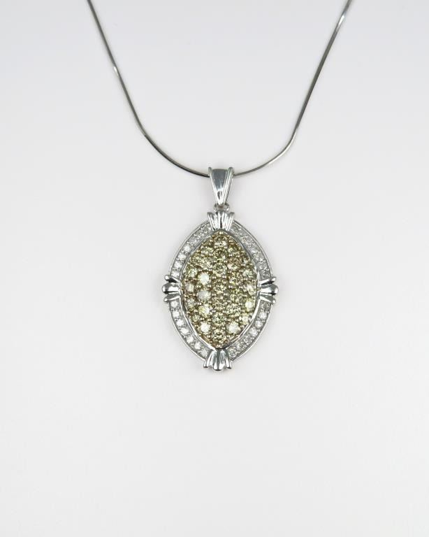 featuring 58 round cut White and Champagne Diamonds weighing an approx. combined total of 1.50 carats set in 10 karat white gold setting with a 14 karat white gold chain.