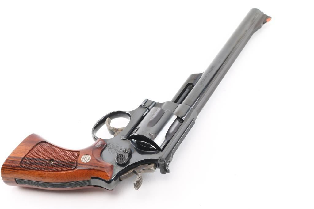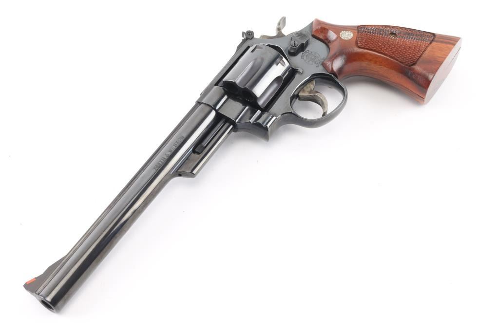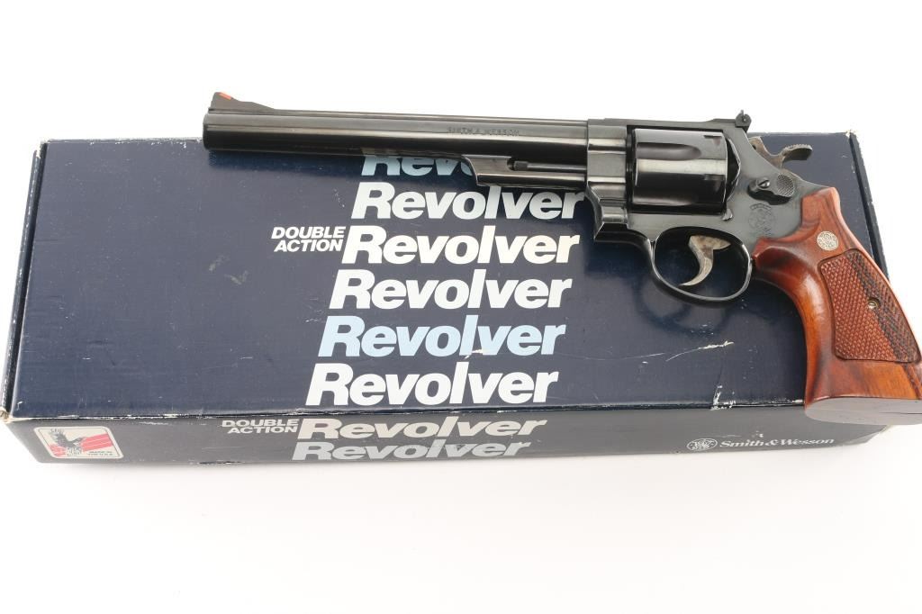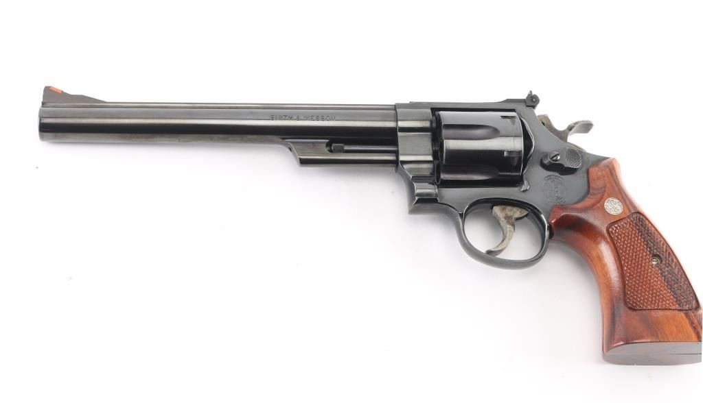 SN: BER1886 #36 of 500 January edition of the "Twelve Revolvers" - A limited edition Ellett Brothers exclusive where a new revolver was released each month for the year of 1990 with an action scene & title inspired by early S&W advertisers. 'The .44 Magnum' Large frame double-action revolver chambered in .44 Magnum, manufactured circa 1990. Features a blued finish, 8 3/8" barrel with partially serrated wide sighting rib, raised ramp front sight with red insert, adjusted micrometer click rear sight with white outline, shrouded ejector rod, fluted six-shot cylinder, serrated .400" target trigger, .500" target hammer, three screw square butt N target frame and two-piece checkered Goncalo Alves target grips with silver S&W medallions. Includes the original factory one-piece blued cardboard box with tool, documents, parchment paper, cleaning tools and matching label. The revolver exhibits nearly all of it's original finish showing a light drag line on the cylinder with no other observed wear. Action is smooth with tight lock-up, the bore is pristine and the wood grips are extra fine. Condition is near NRA Perfect in box. ***Modern Firearm****