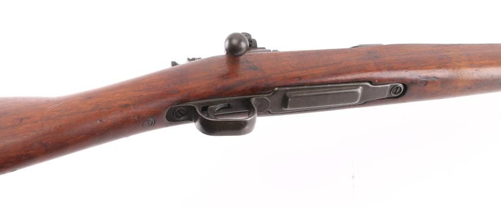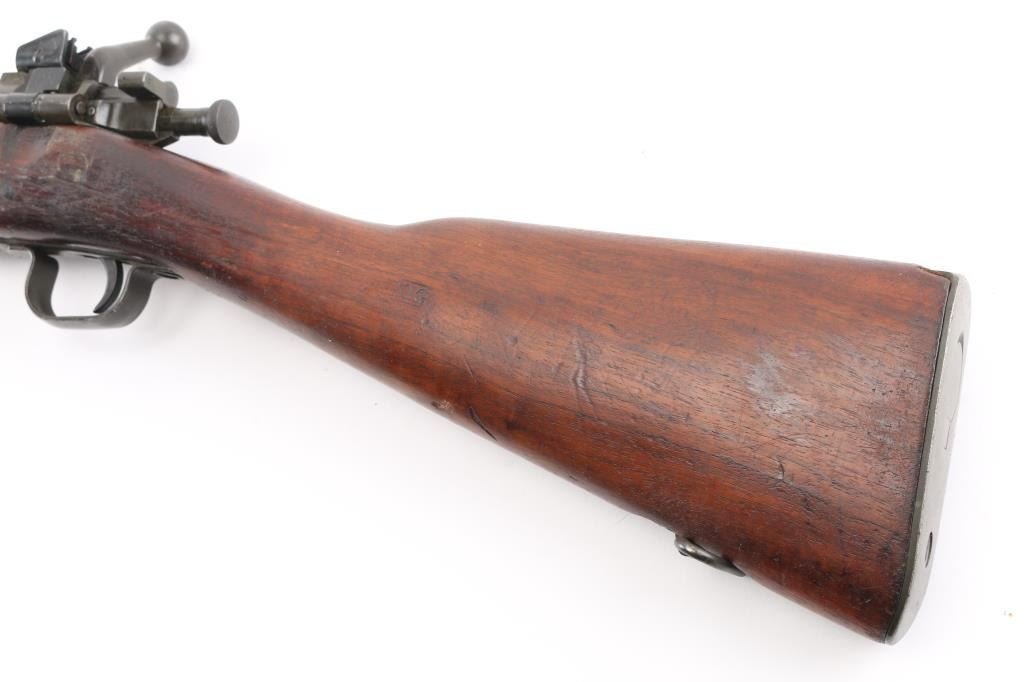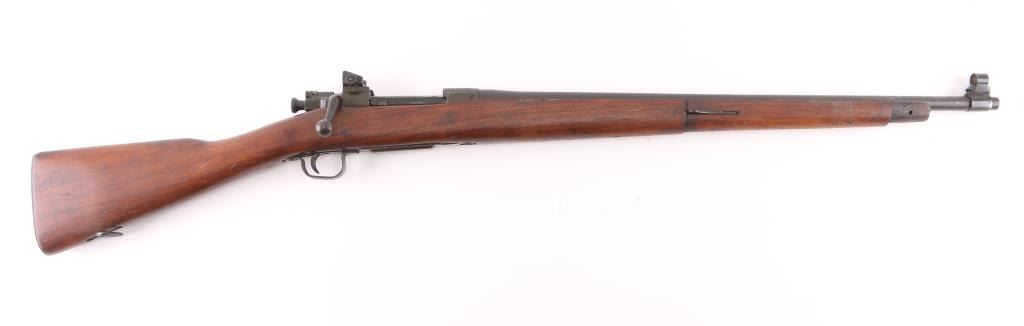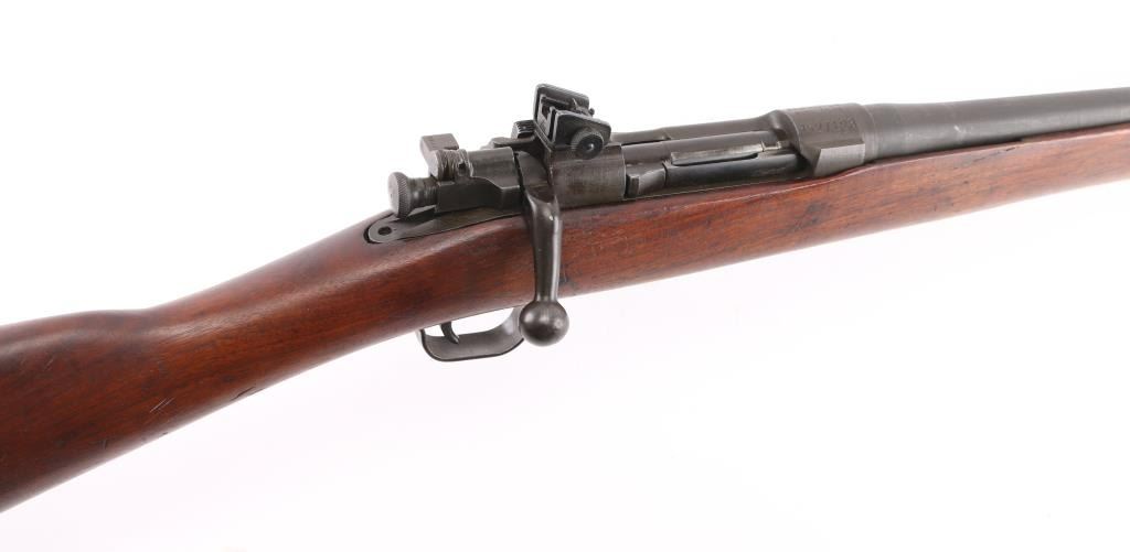 US military bolt action rifle manufactured during WWII, this 1903A3 has a "5-44" dated barrel. Features parkerized finish, 24" barrel, blade front sight with sheet metal protector, receiver mounted adjustable peep rear sight, bent bolt handle, manual safety, magazine cut off, stamped metal trigger guard, missing handguard & bands, walnut straight stock, butt trap with hinged lid. Bore is very good condition, 2 groove. Retains 85% finish with handling marks, different parts show slightly different tones of parkerizing, a bit green colored on receiver. Stock is very good, retains many markings, including "RIA" over "FK" in box. Condition is NRA Very Good (missing some parts) *** C&R Firearm ***