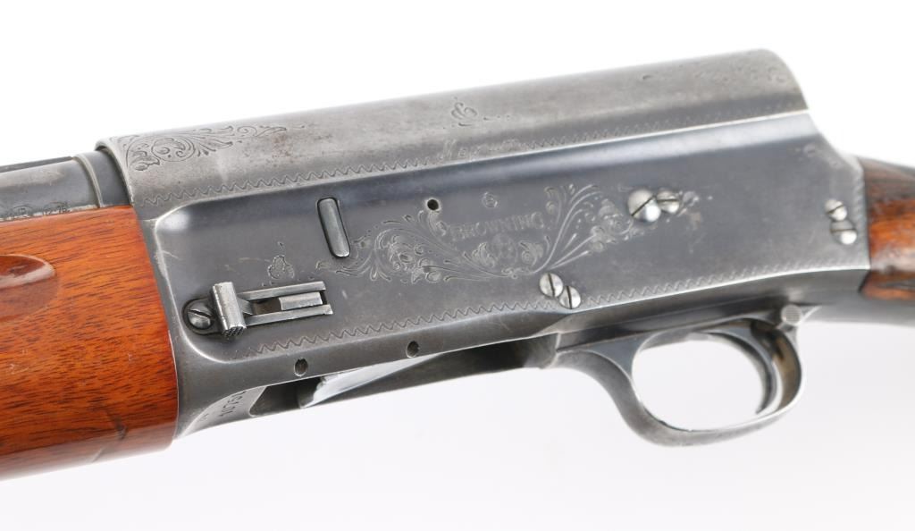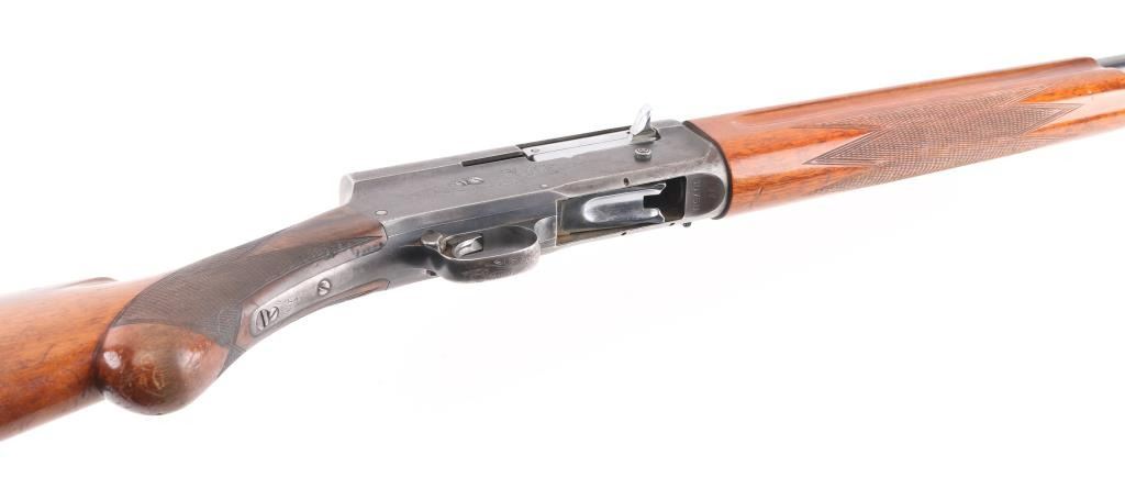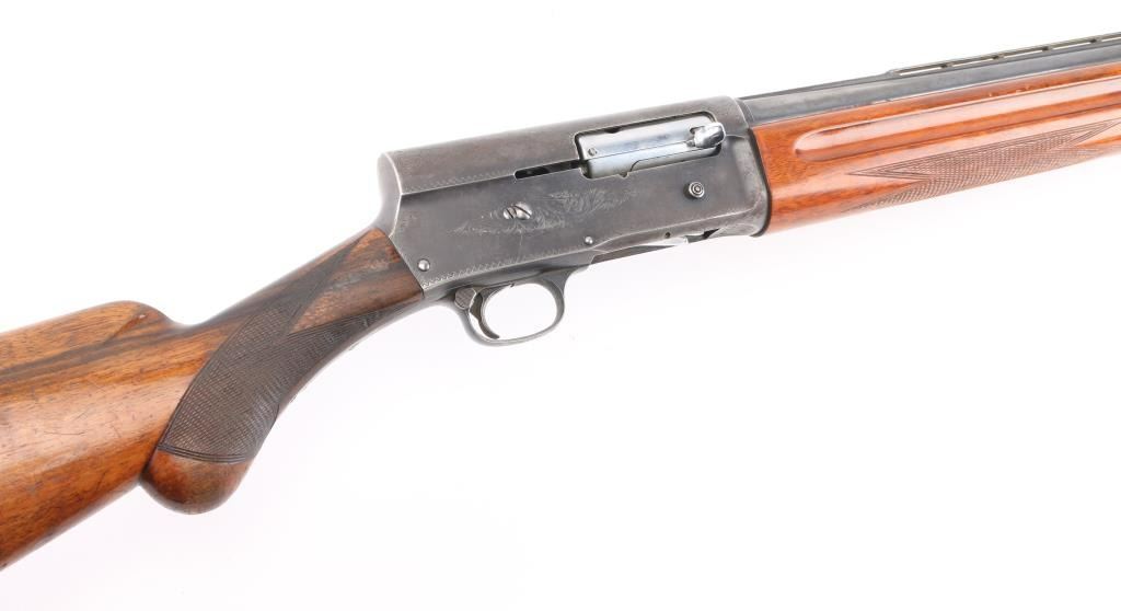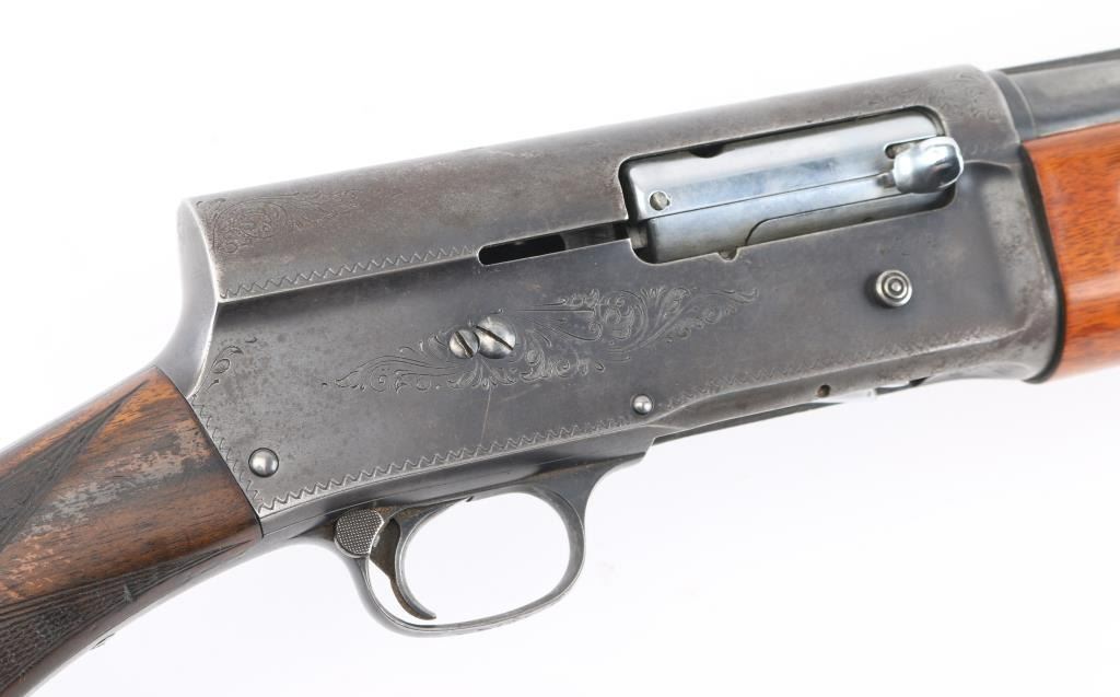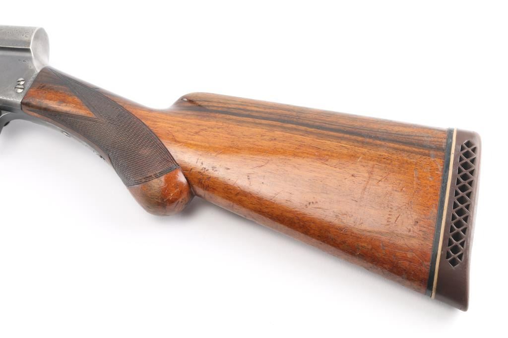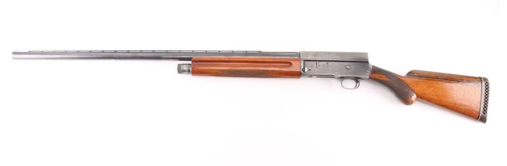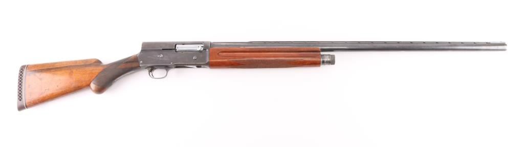 Vintage Belgium made semi-automatic shotgun, imported by Browning, dated 1959. Features blued finish, 31.5" ventilated rib barrel, steel bead front sight, pushbutton safety at rear of trigger guard, magazine cut off, checkered walnut forend and pistol grip shoulder stock w/ ventilated rubber recoil pad. Receiver shows limited scroll engraving, with border patterns. Marked for 3" shells, choke measures Full with a drop in gauge. Bore is very good. Retains 70% finish, with scratches and dings, dent to rib, edge losses & some bare spots. Several small areas with pitting. Wood is good to very good, with scratches, some finish loss, some dents. Condition is NRA Good++ *** C&R Firearm ***
