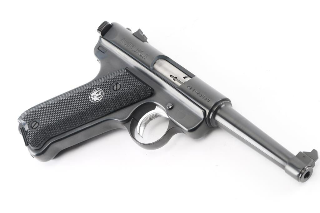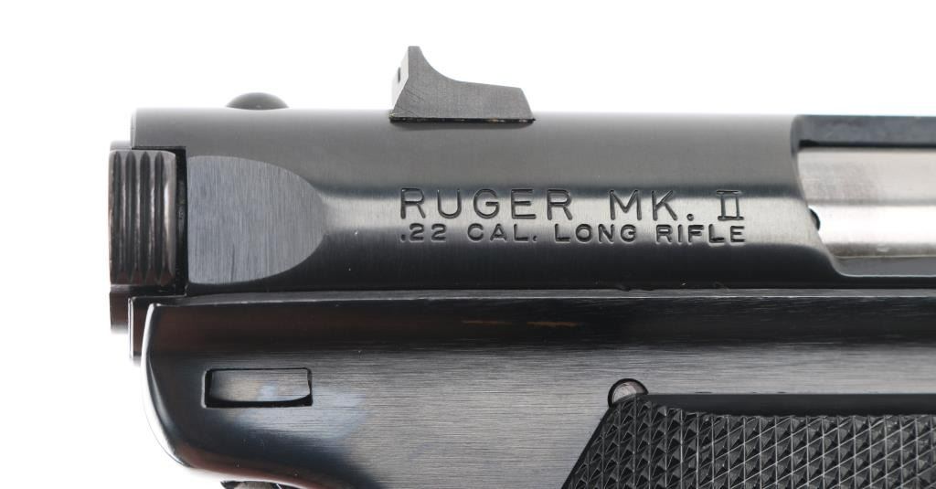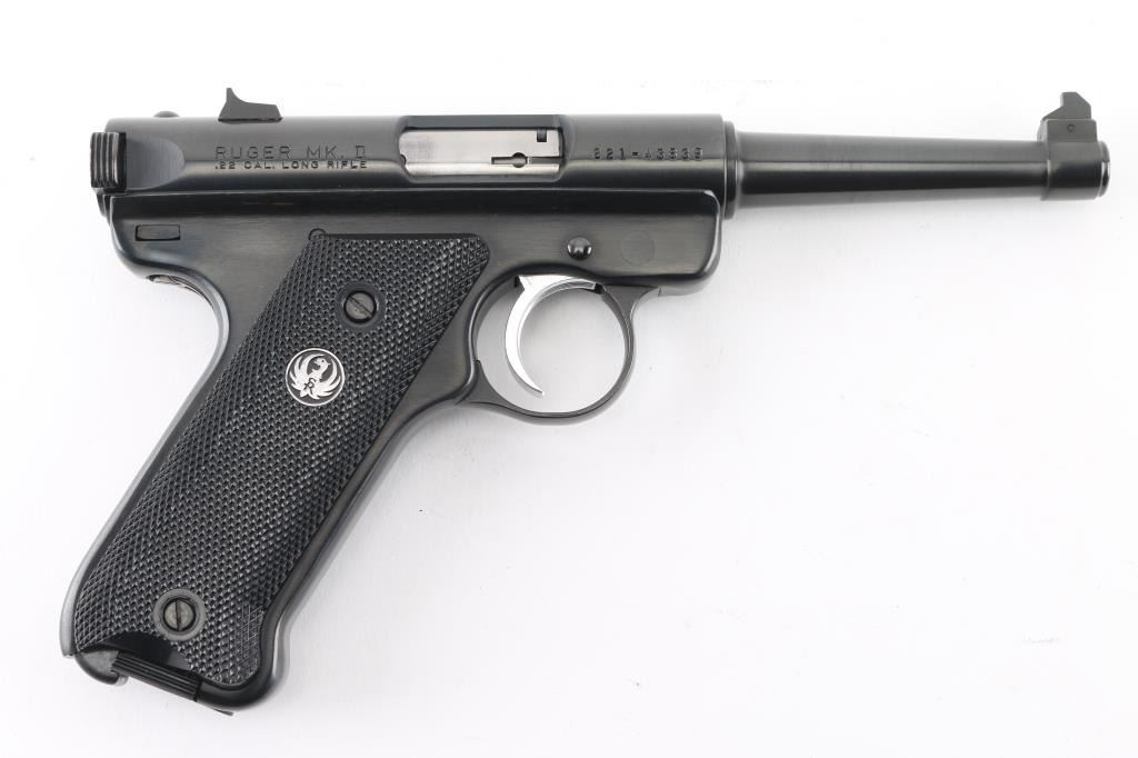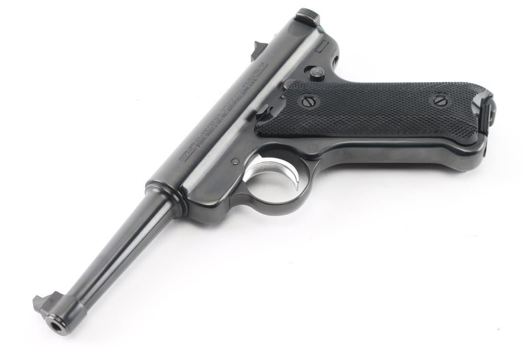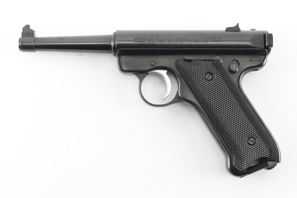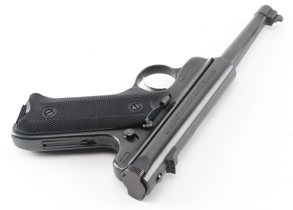 American made semi-auto pistol chambered for .22 LR ammunition, circa 1994. It features a blued stainless barrel and receiver, alloy frame, raised blade front sight, fixed rear sight, serrated trigger, and black, checkered plastic grips with Ruger logo on right side. Comes with one Ruger 10 round factory magazine. Bore looks bright. Metal finish looks great. Grips are fine. Condition is NRA Excellent *Modern Firearm*