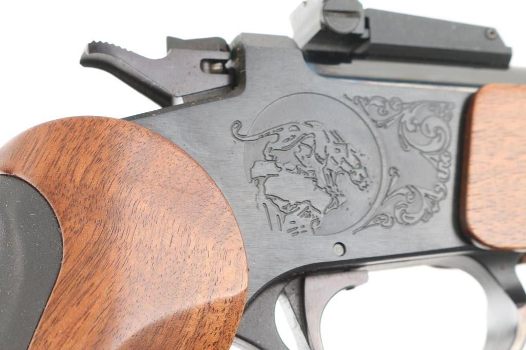 Modular break-action single shot pistol, in a multi-barrel set. Features a blued finish, 14" 22 Long Rifle barrel (14" 357 Remington Maximum barrel is also provided), blade front & adjustable rear sights on both barrels, serrated trigger, engraved cougar scene on the receiver, serrated hammer with rotating selector (centerfire or rimfire, with center position being neither), smooth walnut forend and pistol grip with black rubber insert, spare target style grip provided (checkered, with right hand thumb rest). Bore is like new on both barrels. Retains 98% finish with minor handling marks. Wood is pristine. Includes original factory styrofoam box with cardboard outer sleeve. Condition is NRA Excellent - like new *** Modern Firearm ***