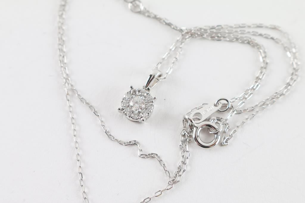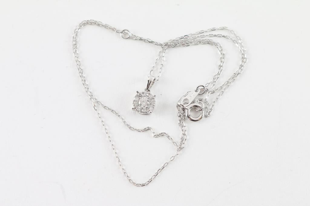 on chain, 3mm center stone nine diamonds, weighing approx 0.40 carats with G-H colors on 18"thin gold chain. Set in 10Kt white gold