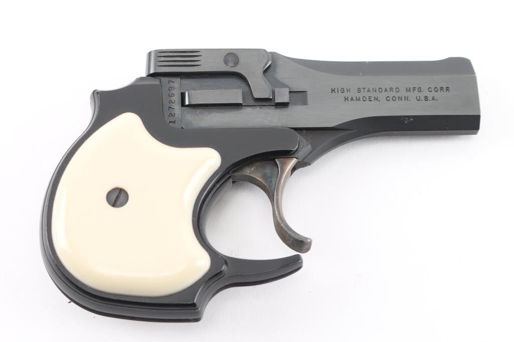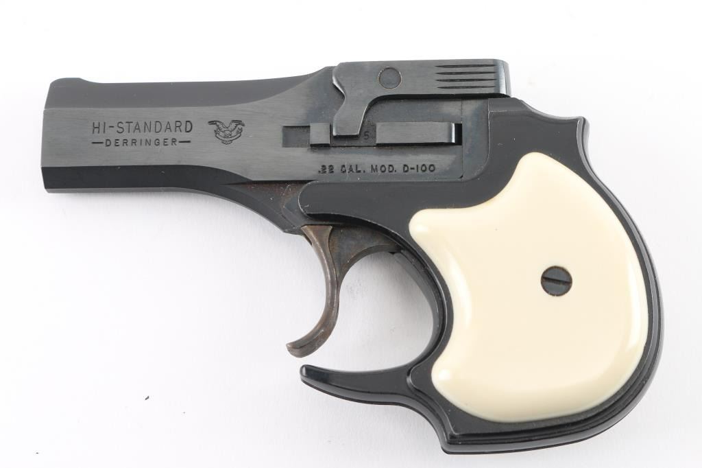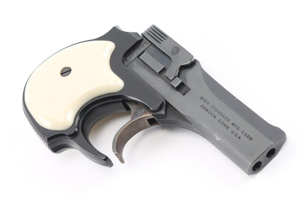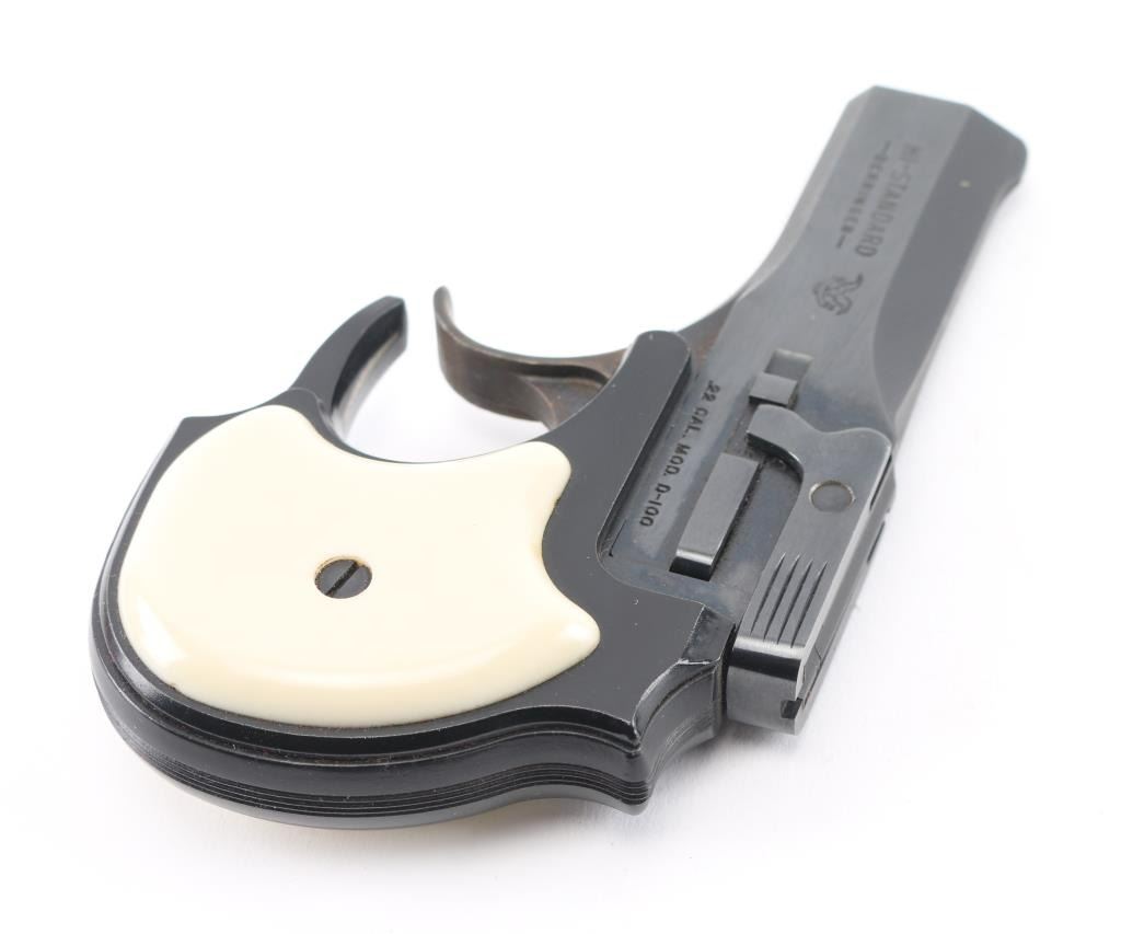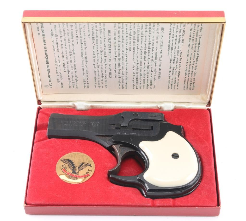 American made over/under double barrel top-break derringer chambered in .22 Long Rifle, manufactured circa 1962-1967. 'First Style' with eagle logo on barrel. Features a blued/black finish, 3.5" barrels, fixed blade front sight, square notched rear sight, smooth case hardened trigger, auto-rotating barrel selector, manual ejector, alloy grip frame with serrated backstrap and two-piece faux ivory polymer grips. Pistol is in like new condition, in factory hinged lid jewelry case type box with fitted velvet lined interior, with manual. Condition is NRA Excellent - like new *** C&R Firearm ***