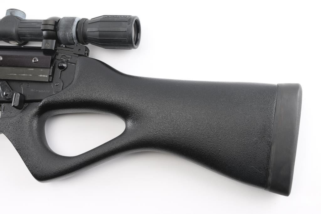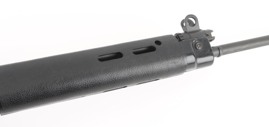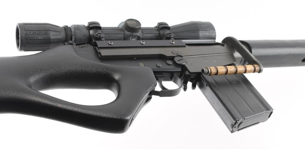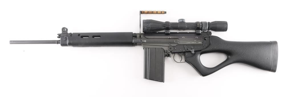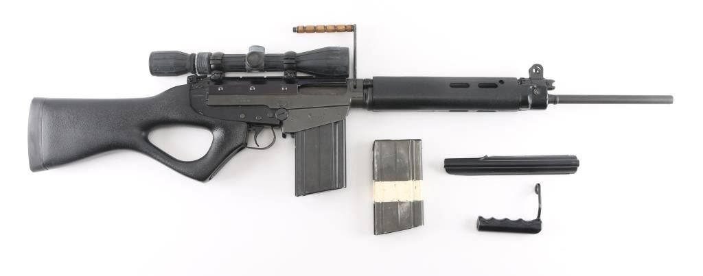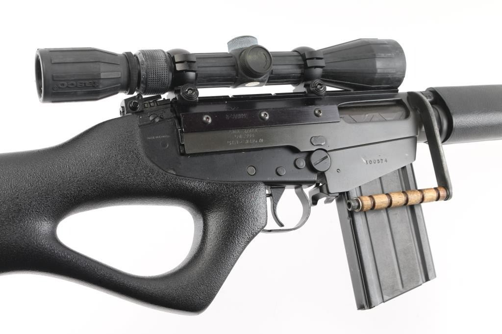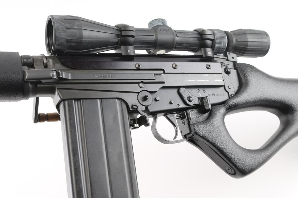 Century Arms produced semiautomatic rifle, built from a metric FAL type receiver and an inch pattern parts kit. No observed markings on receiver other than CAI St Alb Vt. Features 20.5" barrel, adjustable gas settings, protected blade front sight, folding rear peep sight, B-Square replacement dust cover with Weaver top rail, grooved wood carry handle, pebble grain black polymer handguards, pebble grain black thumbhole stock with solid rubber butt pad, manual safety. Barrel has been shortened, plain muzzle, with portion of original key cut visible. Bore is good condition, a bit dark in the grooves and with light frosting throughout, strong rifling. Metal surfaces retain 90% parkerized refinish, black on most surplus parts, medium gray on receiver. Stock is very good. Attached Tasco 3-9x rubber armored scope has clear view, the duplex reticle is canted 45 degrees, the outside turrets are aligned properly, indicates internal damage to the scope. Includes a polymer gripped L1A1 carry handle, two metric magazines (one fair to good with paint, one very good), L1A1 tabbed dust cover. Condition is NRA Very Good (assembled from parts) *** Modern Firearm ***