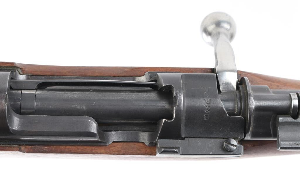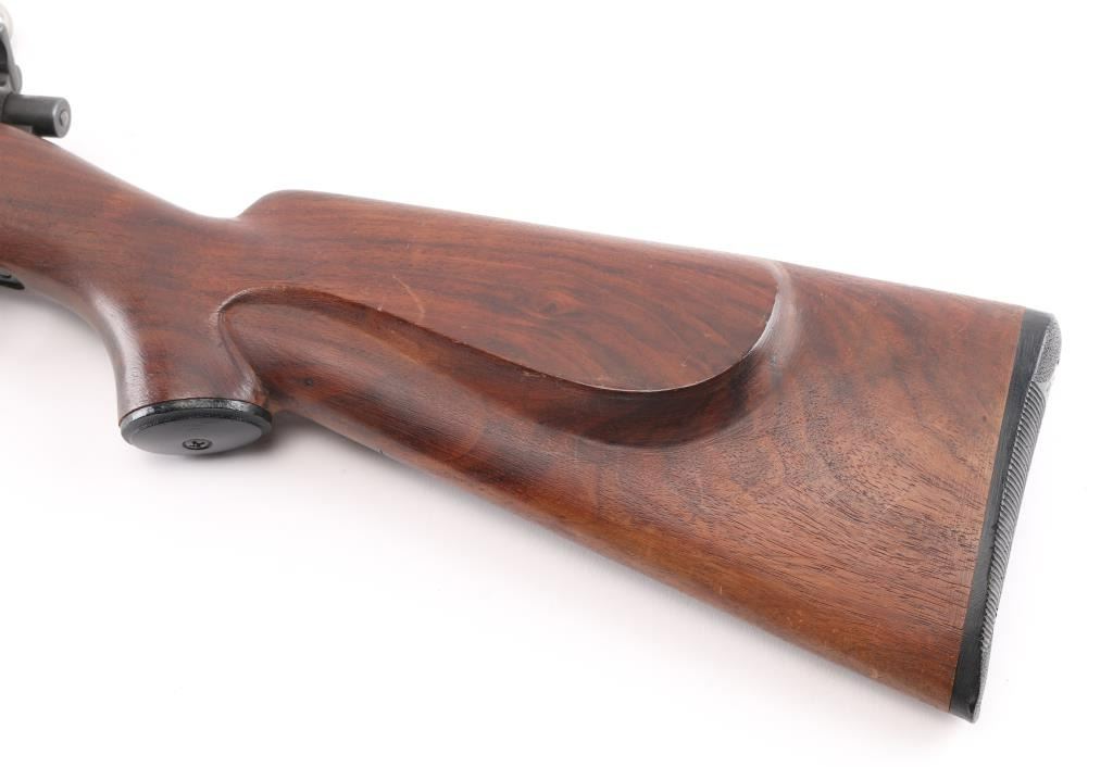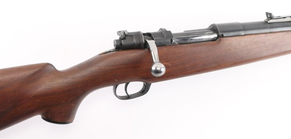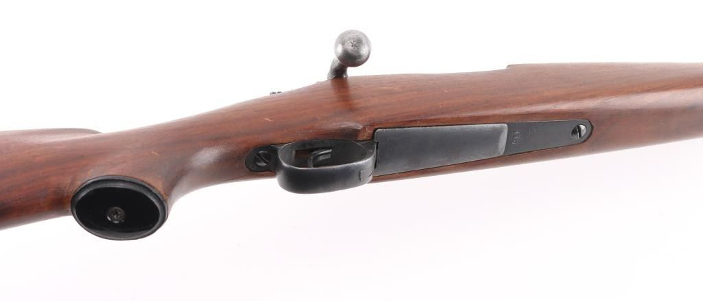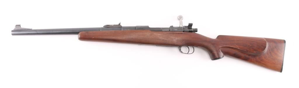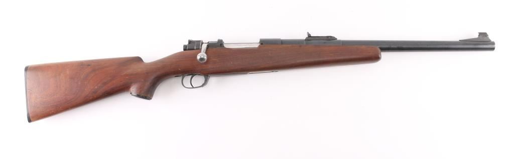 Custom sporter built on a Siamese Mauser action. Featured blued finish, custom 18.5" heavy barrel, blade front & adjustable rear sights, turned down bolt handle, three position flag safety on cocking piece, Fajen walnut stock with right hand cheekpiece, serrated plastic butt plate, black plastic grip cap. Bore is very good condition. Retains 95% finish with handling marks. Stock is very good condition, minor scratches, shows small gaps around action & barrel. Not caliber marked, chambering must be verified by a gunsmith. Condition is NRA Very Good (as modified) *** C&R Firearm ***