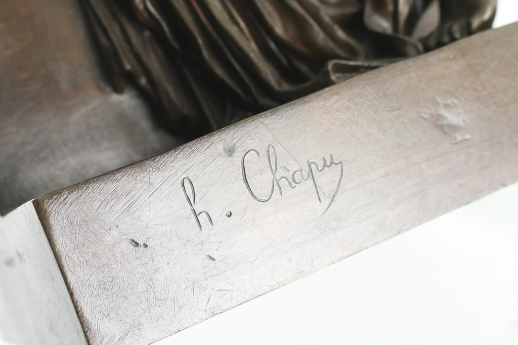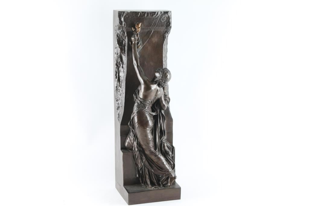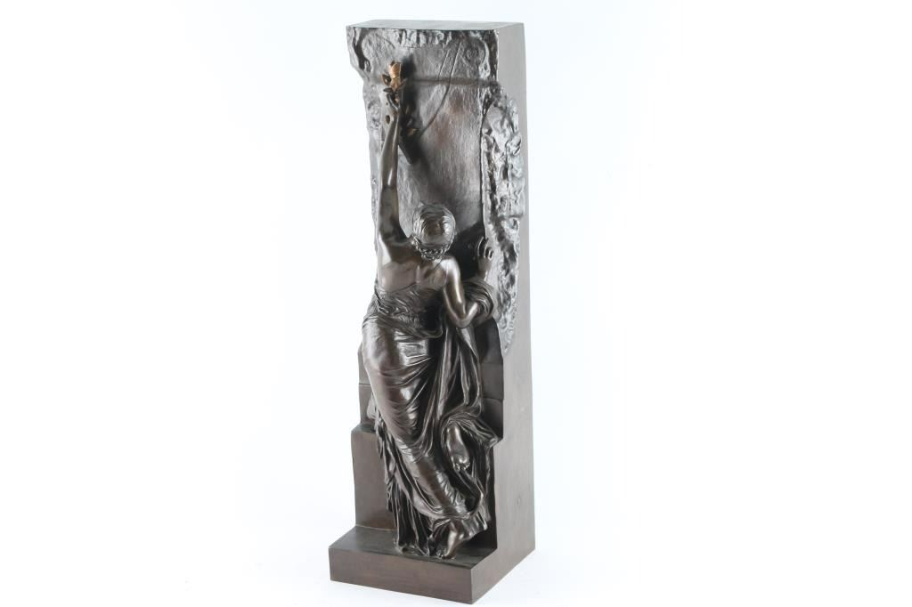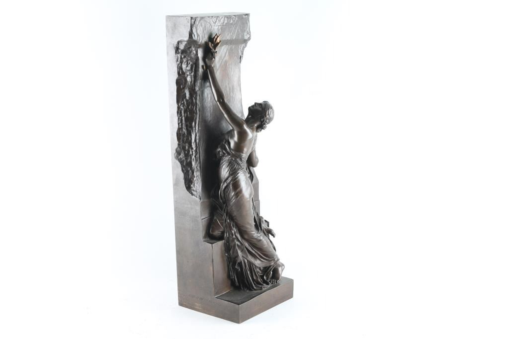 marked "F Barbedienne Fonduer Paris with French hall mark as well. Signed P. Chapu. Depicting lady climbing a wall. Measures 23"x7".