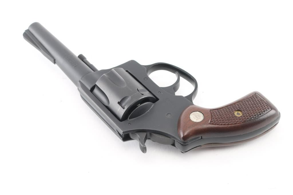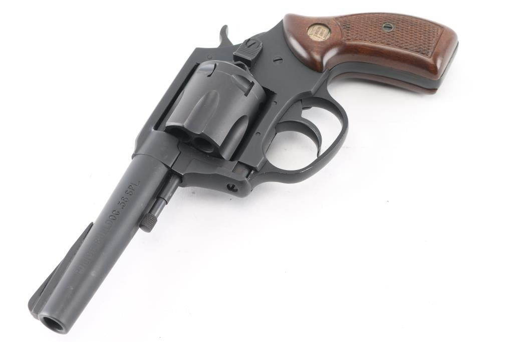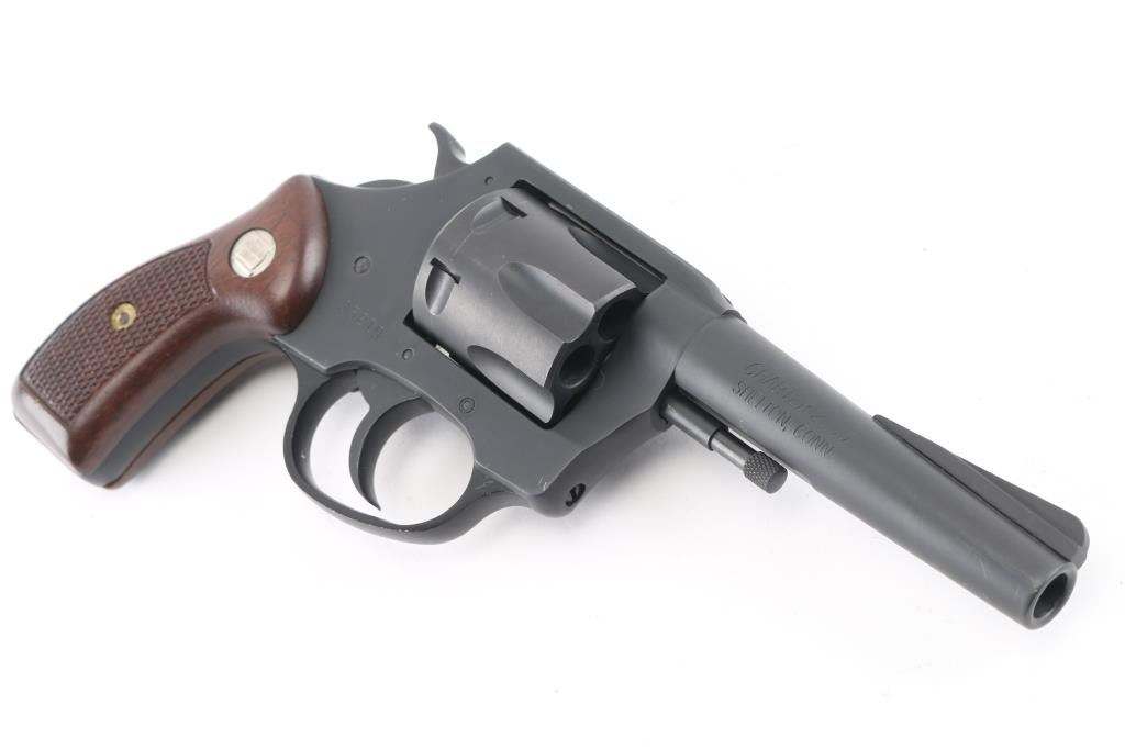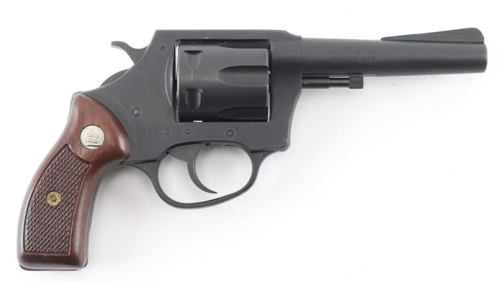 From Charter 2000, formerly Charter Arms, this is a 6 shot DA/SA revolver chambered for .38 Spl ammunition. It features a matte blued (looks black) finish 4" barrel, non-shrouded ejector rod, fluted cylinder, raised ramp front sight, notch rear sight, smooth trigger, serrated hammer spur and semi-checkered wood grips with Charter Arms medalions. Bore and cylinders look good, a little dusty. Metal finish looks very good. Wood grips are fine. Condition is NRA Very Good *Modern Firearm*