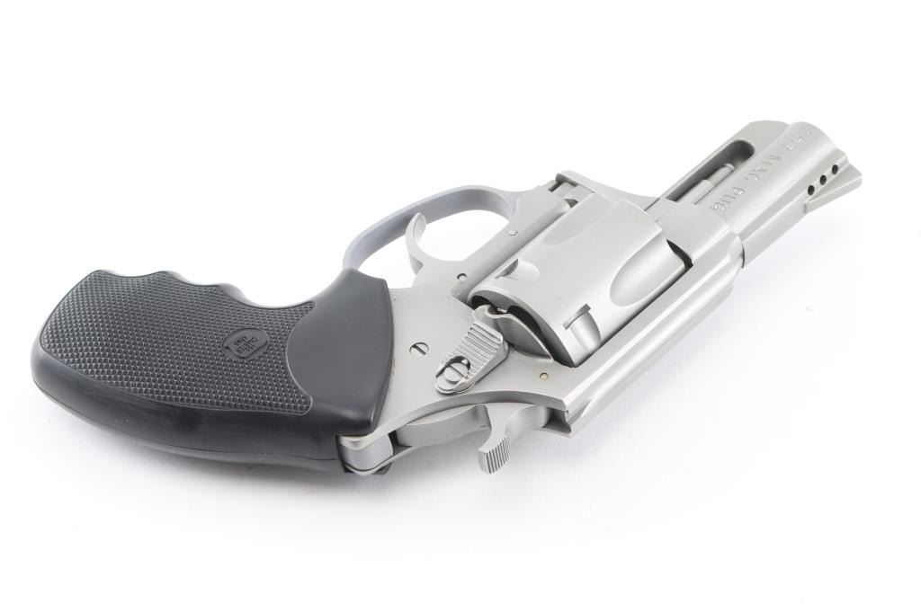 American made 5 shot revolver chambered for .357 Magnum ammunition. It has a stainless steel frame with a matte stainless finish, 2.2" ported barrel, fluted cylinder, full under lug, smooth trigger, serrated hammer spur, and black rubber finger groove "checkered" grips. Bore and cylinders look good, dusty. Metal finish looks great, there is a drag line on the cylinder. Grips look fine. Condition is NRA Very Good. *Modern Firearm*