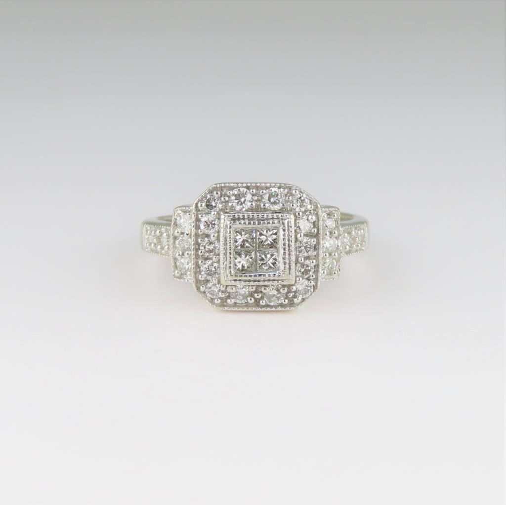 featuring 24 round and Princess cut Diamonds weighing approx. 0.80 carats with F-G colors and VS clarity set in a 14 karat white gold setting.