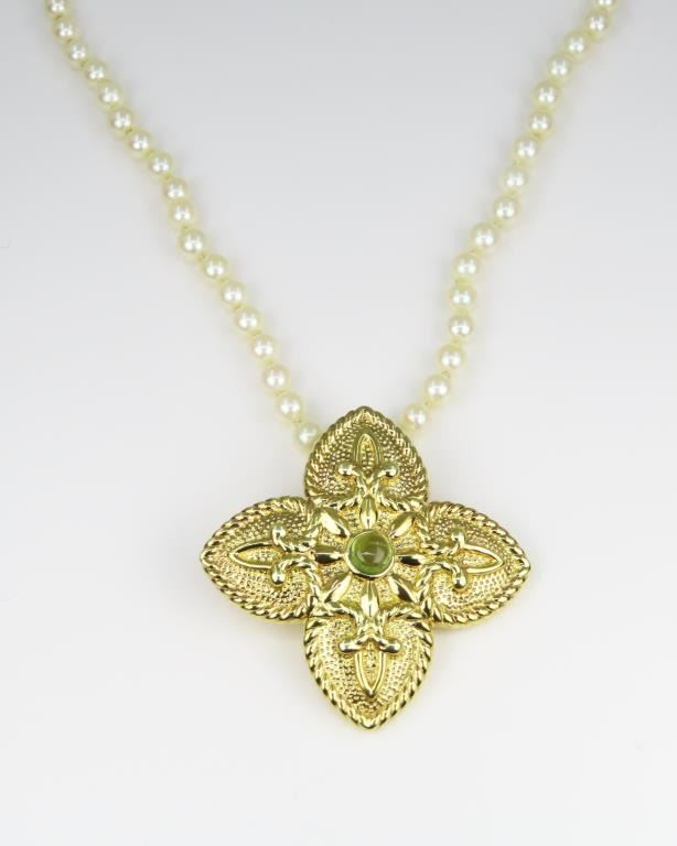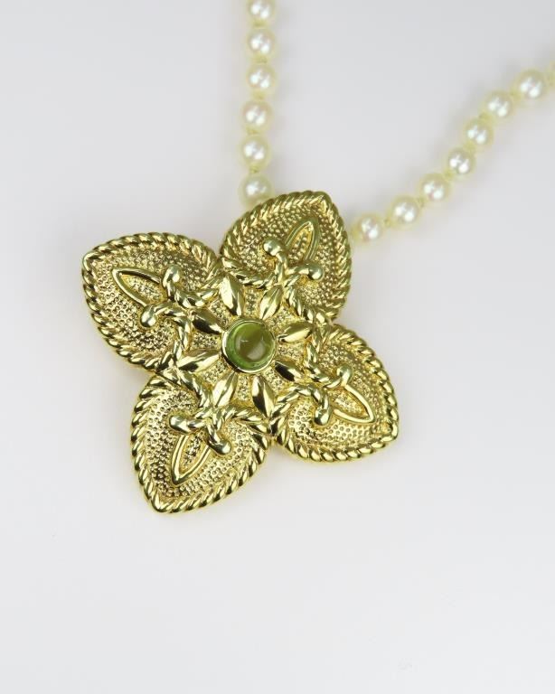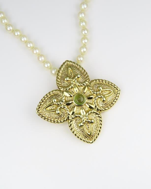 and Pearl Necklace featuring a Fleur De Lis design pendant set with a round cabochon Peridot measuring almost 2” inches in diameter crafted in 14 karat yellow gold with Pearl strand measuring 16” in length.