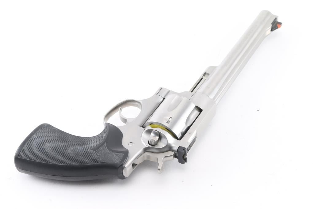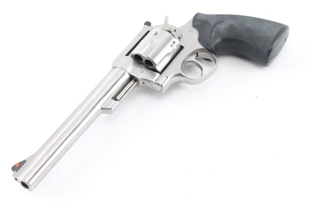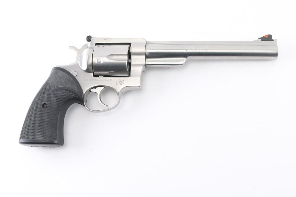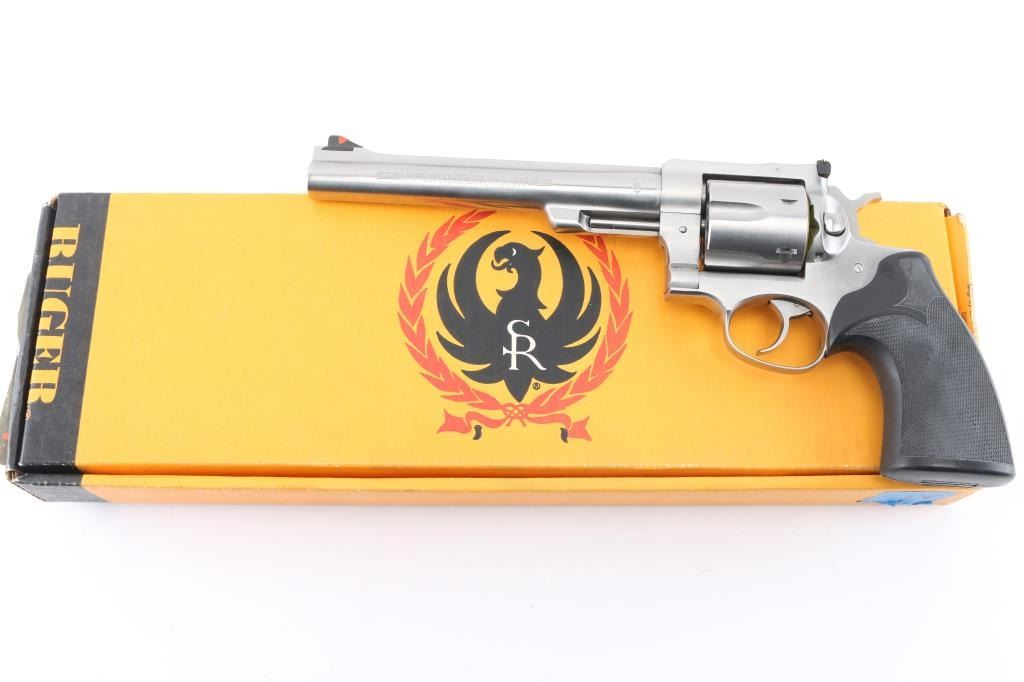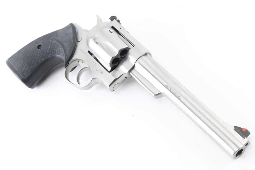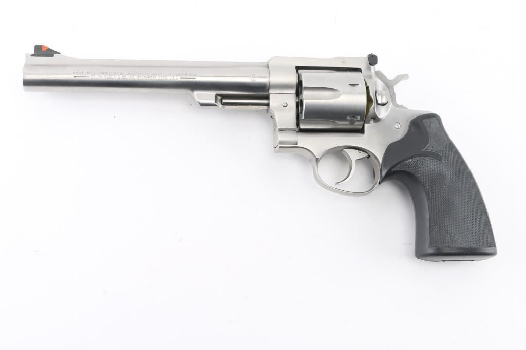 Double/single action revolver chambered for 44 Magnum. Features stainless steel construction, 7.5" barrel, adjustable sights with orange ramp front and white outline rear, fluted 6 shot cylinder, checkered black rubber Pachmayr grips. Bore is excellent. Metal finish is excellent condition with a few small shiny spots from handling. Grips are excellent. Action operates smoothly and locks up tight. Includes yellow cardboard Ruger box with manual. Condition is NRA Excellent *** Modern Firearm ***