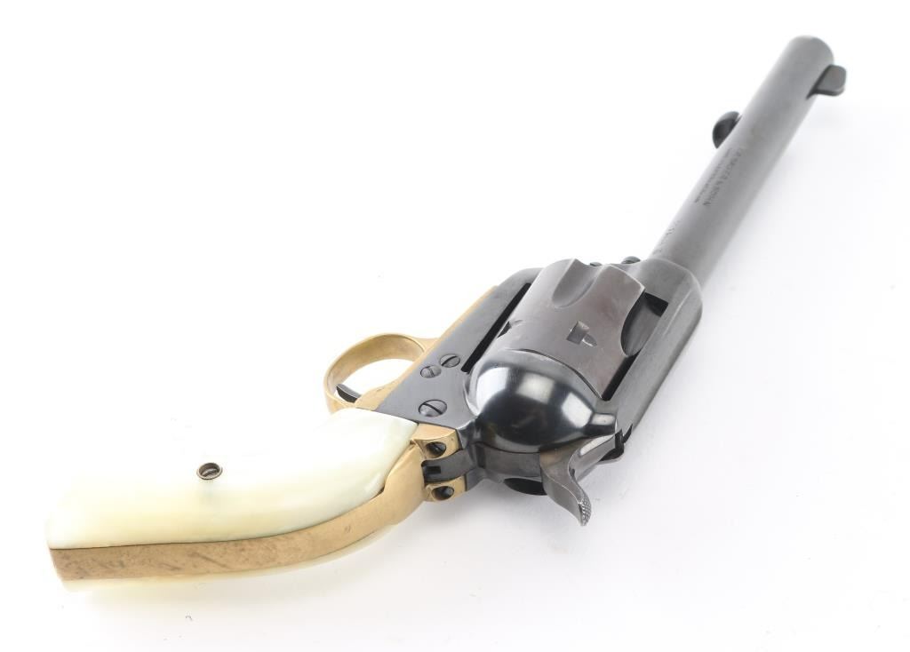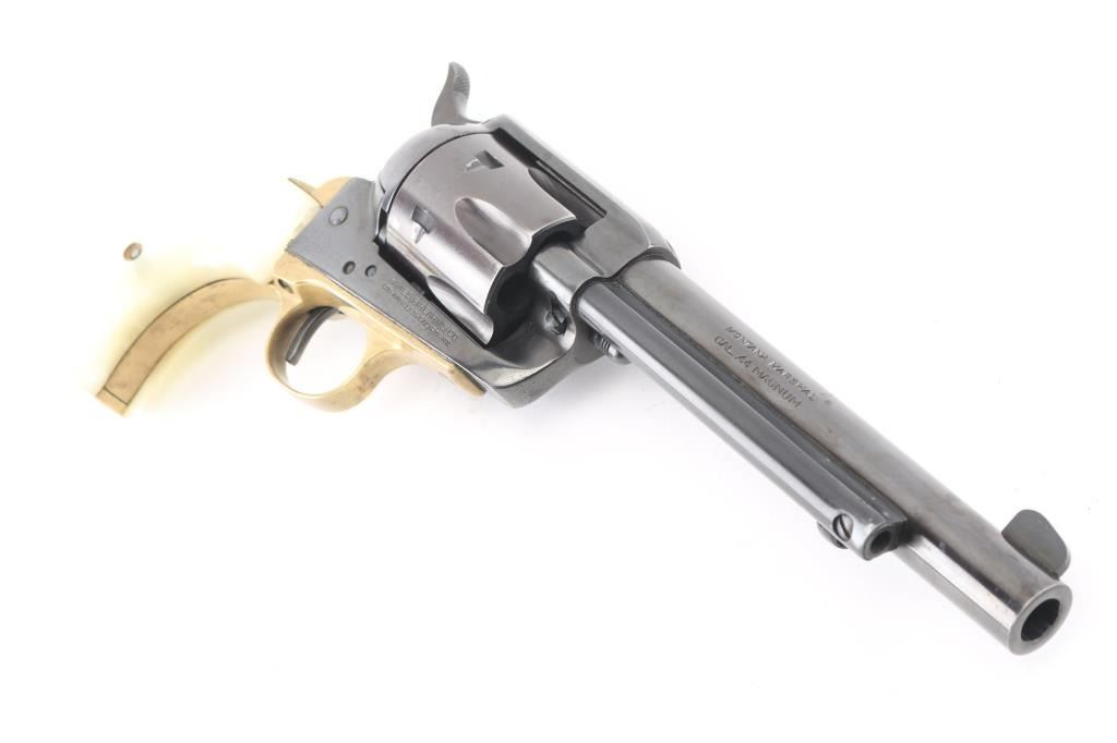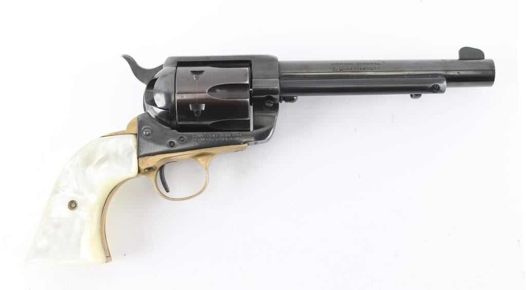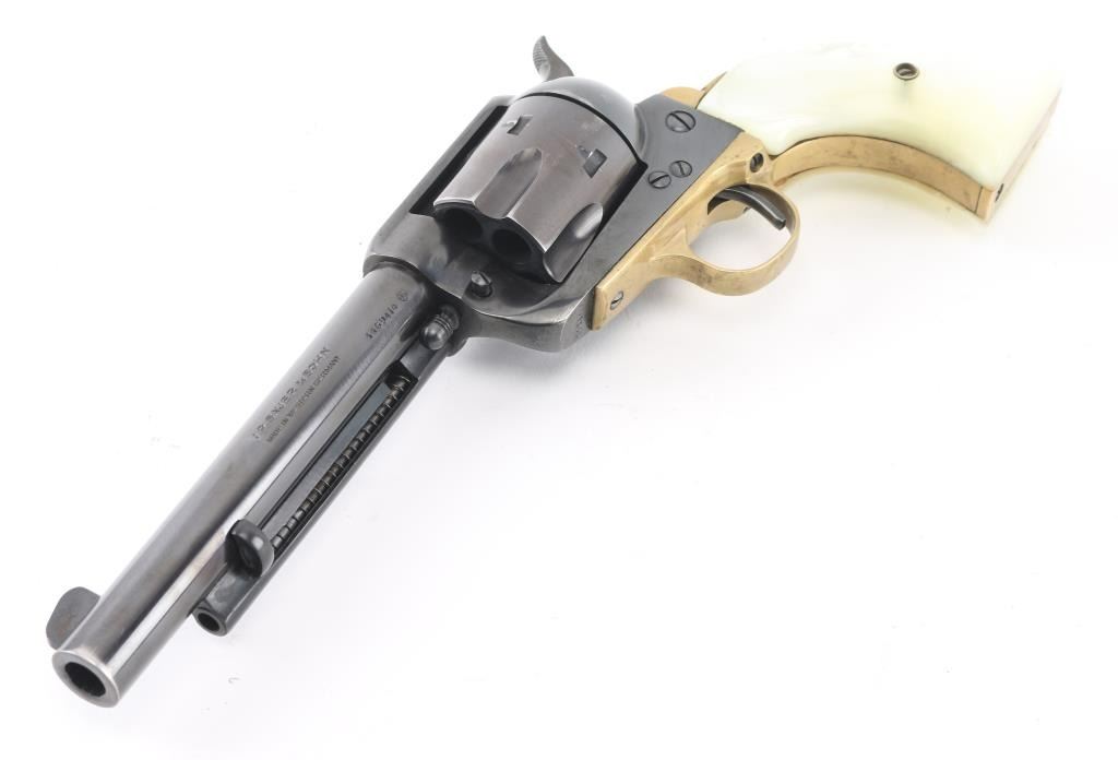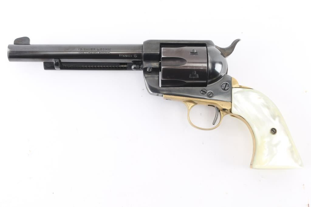 SN: 11694/4 "Made in West Germany", imported by Hawes, Los Angeles CA. Western styled single action revolver chambered for 44 Magnum, appears very similar to Colt 1873 SAA. Features blued finish, faux pearl grips, 6" barrel, fluted 6 shot cylinder, fixed sights, brass triggerguard & backstrap. Bore is very good condition. Retains 85% finish, with edge losses, handling wear. Grips are excellent, no cracks or chips. Action is smooth with tight lock-up. Barrel numbered to frame. Loading gate spring a bit weak. Condition is NRA Very Good ++ *** Modern Firearm ***