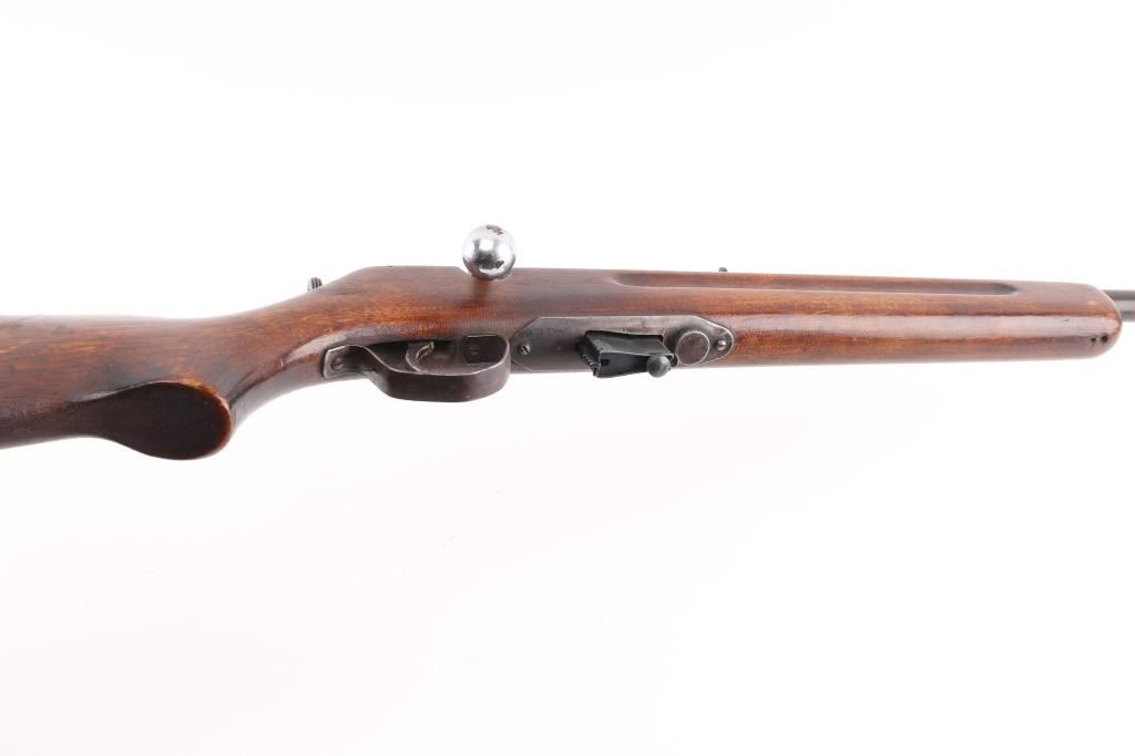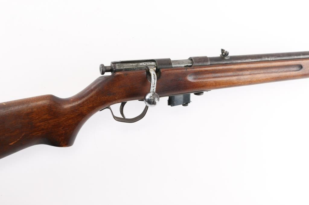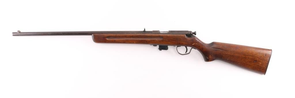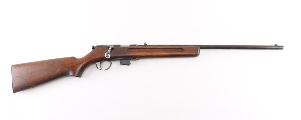 Vintage , single-shot, bolt action rimfire rifle. Fed from a 10-rd box magazine, included. Made by Mossberg 1935-37. Features a 22' round barrel with post/bead front and flip, adjustable u-notch sight with white diamond, cocking knob on bolt, one piece wood stock with grasping grooves, steel buttplate. Bore is very good/bright, action works fine, wood is sound with minor scratches/dings, finish has turned a gray/brown patina. A good starter rifle. NRA Condition-Good. C&R Firearm.
