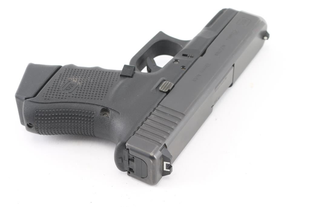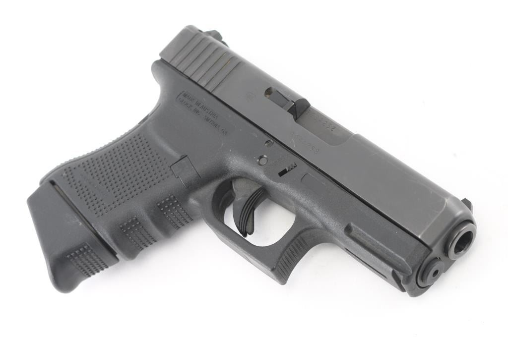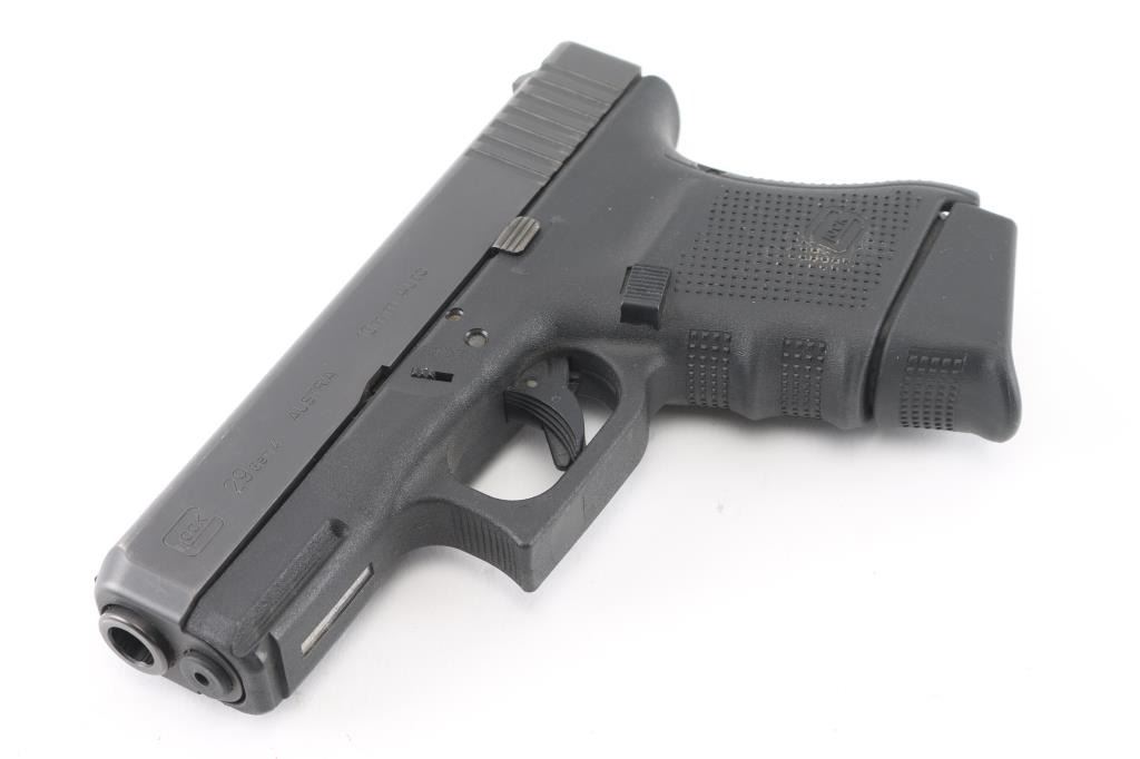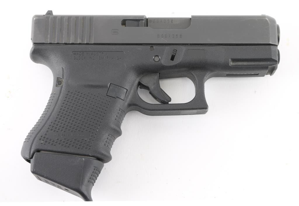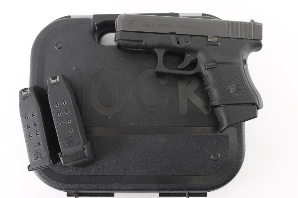 'Gen4' Austrian made sub-compact safe-action semi-automatic pistol chambered in 10mm Auto. Features a black finished slide with melt treatment on the front face, 3.78" barrel, fixed front sight with white dot, dovetailed notch rear sight with white outline, trigger safety, push button magazine release, factory 10 round magazine with finger rest floorplate by Pearce Grip and durable black polymer frame with integral accessory rail & textured finger groove grip. Bore is very good. Retains 95% finish with handling marks, edge wear on slide. Polymer is near excellent with few scratches. Includes the original factory hard case with documents, mag loader and two spare magazines (one with pinky rest floorplate). Condition is near NRA Excellent *** Modern Firearm ***