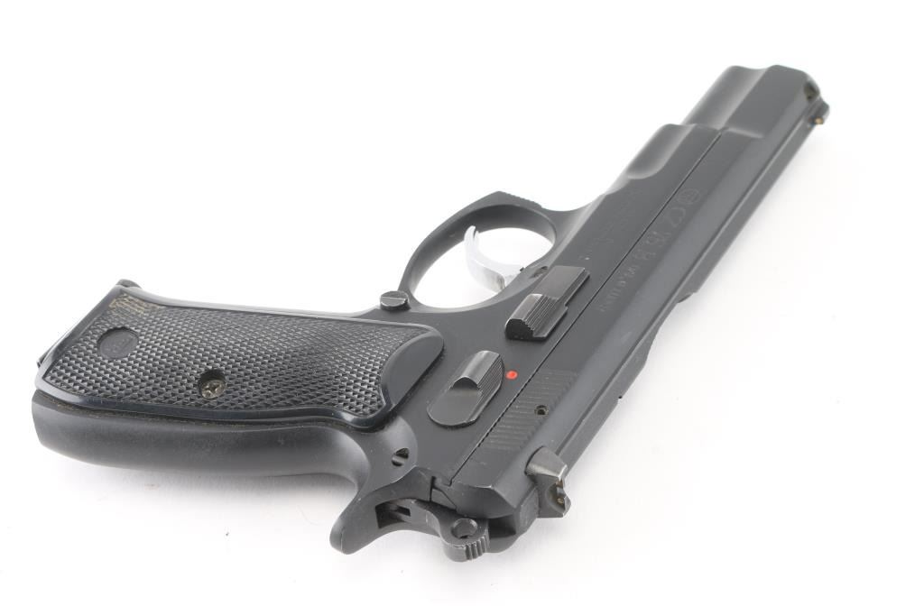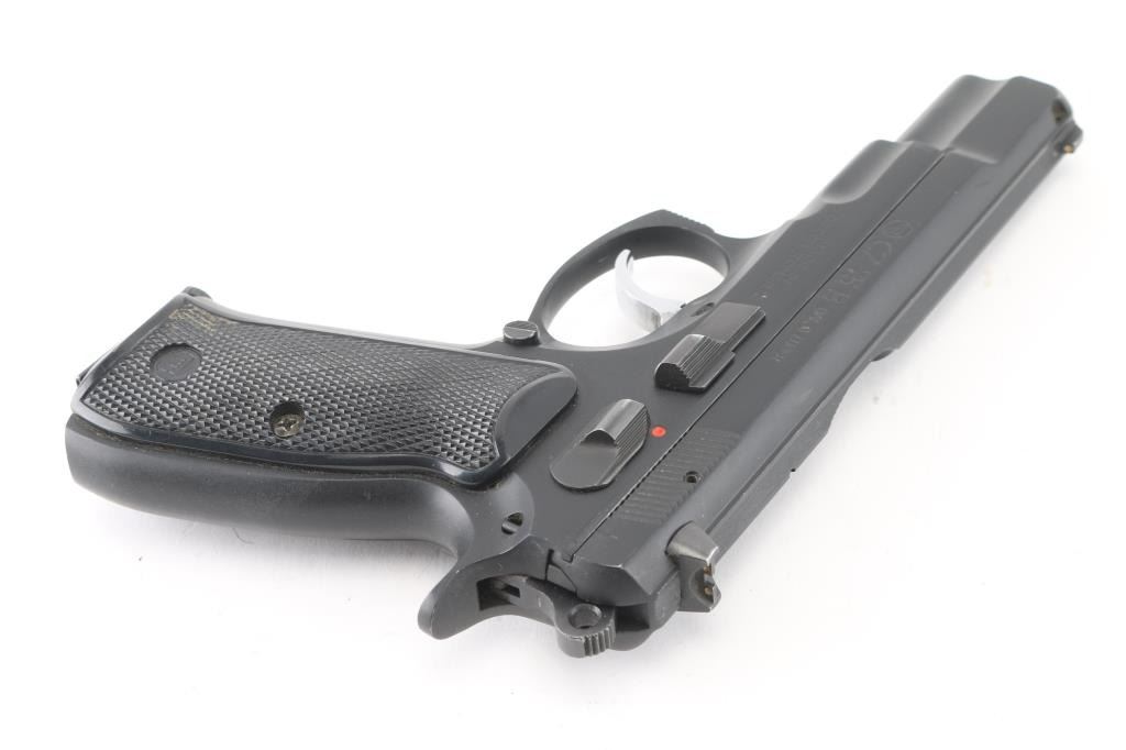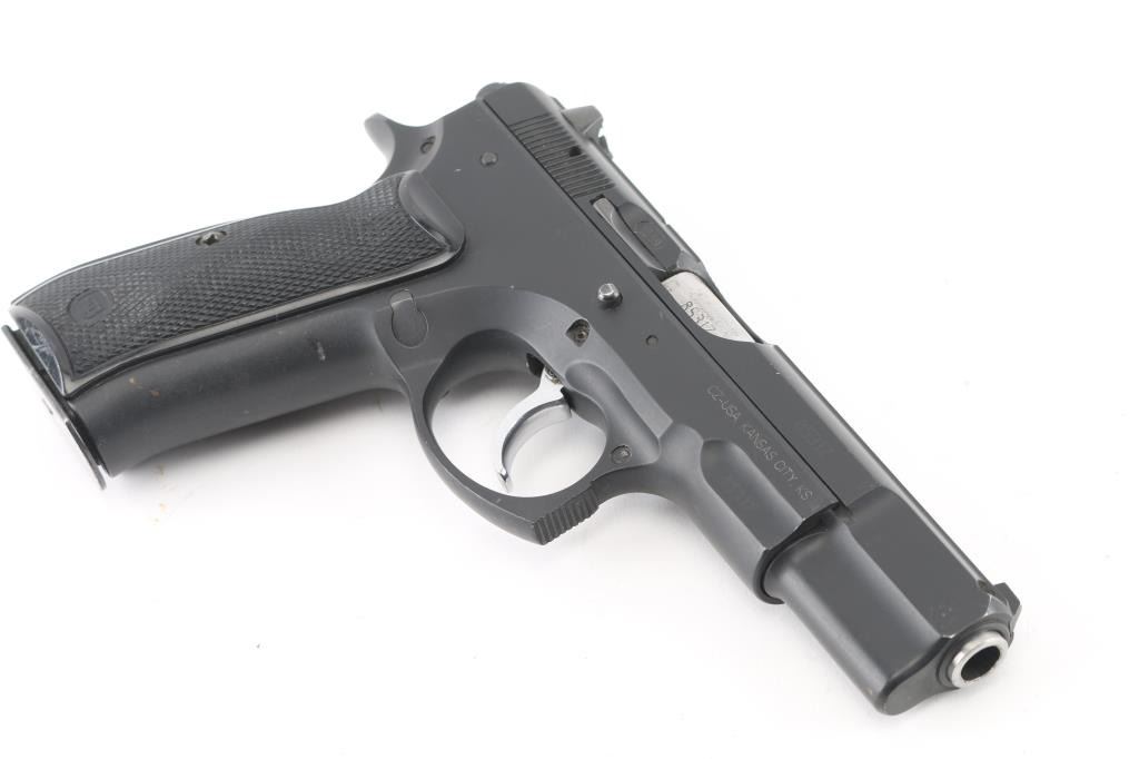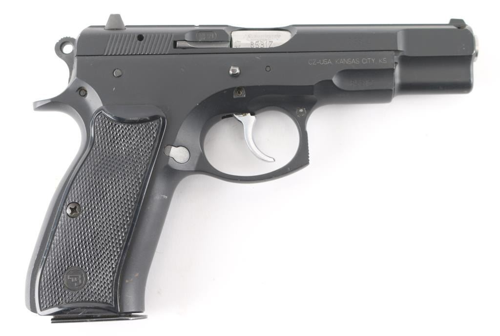 Czech made DA/SA semi-automatic pistol chambered in 9x19mm. Imported by CZ-USA of Kansas City, K.S. with import marks on the right side of the frame. Features a matte black Polycoat finish, 4.5" barrel, three-dot sights with drift adjustable rear sight, smooth silver look trigger, serrated round hammer spur, frame mounted safety, steel frame, push button magazine release, two-piece checkered black rubber grips with CZ insignias. Bore is very good. Retains 95% finish, with minor handling marks. Grips show some dirt, overall very good condition. One magazine (appears 15 rd capacity). Numbers match on frame, slide, barrel. Condition is NRA Excellent *** Modern Firearm ***