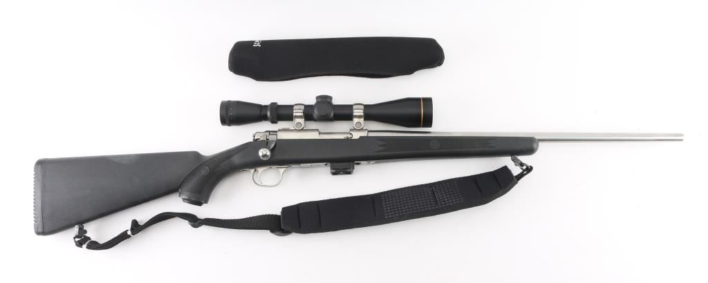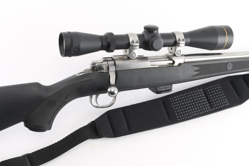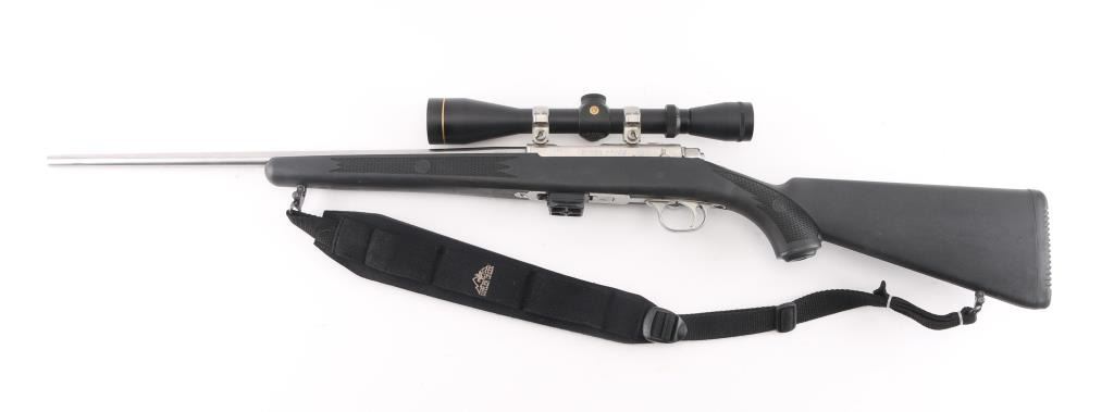 American made bolt action rifle chambered in .22LR circa 2013. This 'All-Weather' rimfire rifle features stainless steel construction, Ruger black polymer stock with checkered panels at forend & curved wrist, no cheekpiece, serrated rubber buttplate, sling studs, 20" barrel, no sights, scalloped dovetails on receiver for scope mounting, manual safety. Comes with a Leupold VX-2 3-9x scope, duplex reticle, clear view. Bore is very good. Metal shows minor handling marks. Synthetic stock is very good. Includes black nylon sling. Accepts the standard Ruger rotary 10/22 magazine, one is provided. Condition is NRA Excellent *** Modern Firearm ***