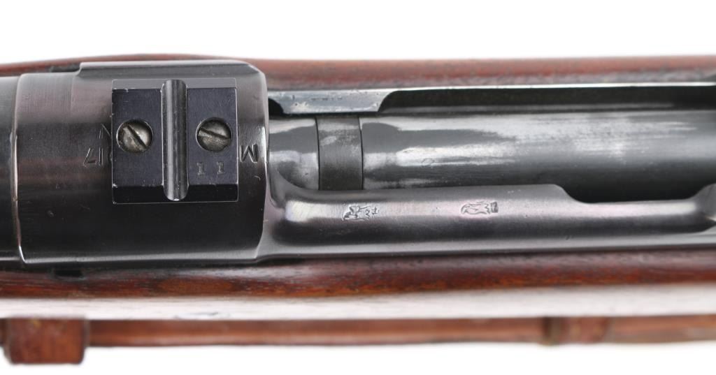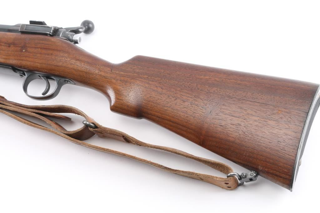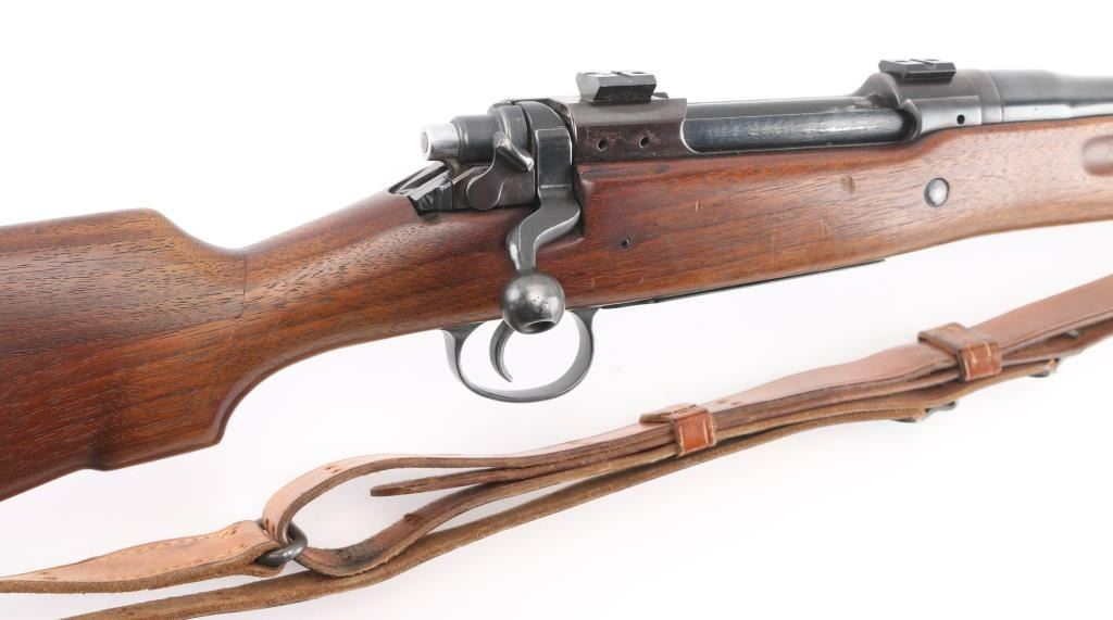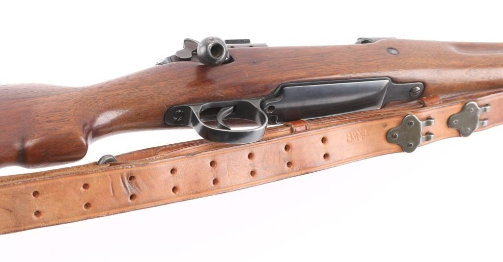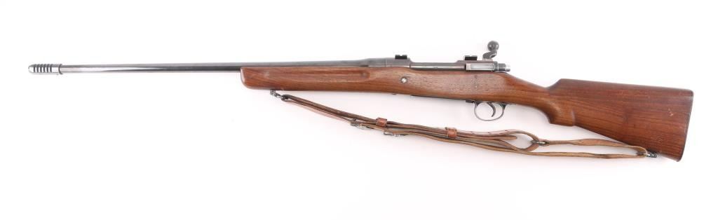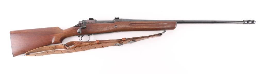 Sporterized US military bolt action rifle. Features blued finish, original wood military stock reworked to sporter configuration, 24.5" barrel, muzzle brake, no iron sights, original rear sight and protective "ears" removed, Weaver bases on top of receiver, manual safety, dog-leg bolt handle, hollow bolt knob. Stepped bottom metal cut & re-welded to flat profile. Stock retains finger grooves on forend (partially eroded & smoothed), spliced in high comb, knurled steel commercial buttplate. Right side of receiver drilled & tapped for receiver sight (no sight present). Bore is very good overall, bright with some light frosting. Retains 90% dark re-blue, some plum color on harder parts, rubbing wear on bolt, handling marks. Wood is very good as modified, refinished, with scratches & scrapes. Includes good condition leather two hook sling (tan M1907 type, marked "BOYT 44").. Condition is NRA Very Good (as modified) *** C&R Firearm ***