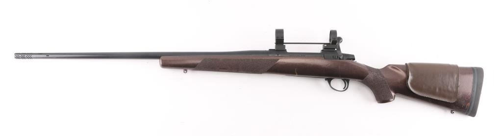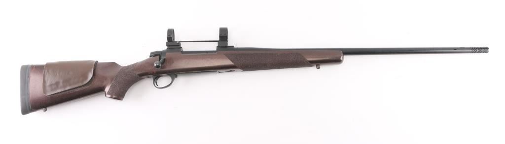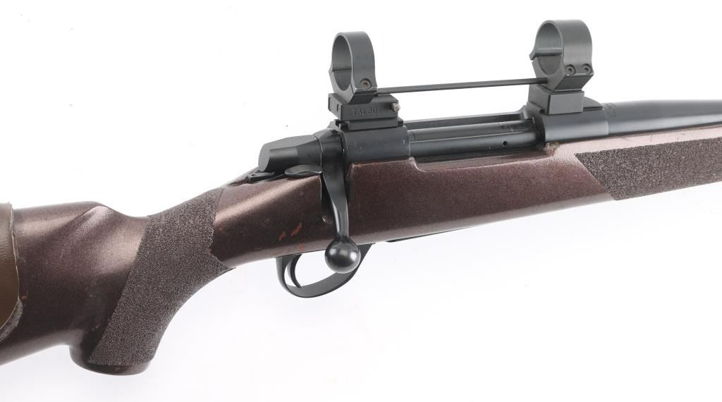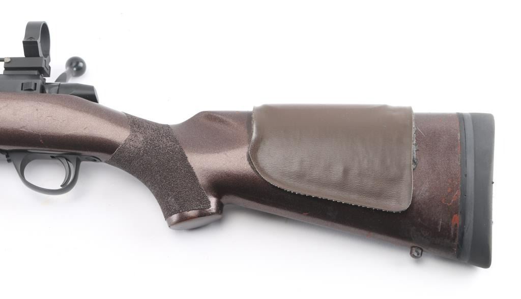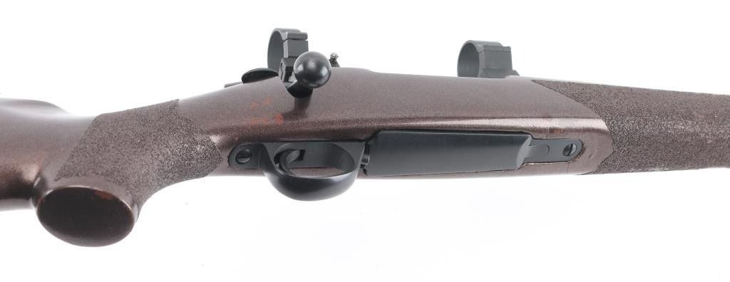 Finnish bolt action rifle, no importer info observed, circa 1978-81. Features blued finish, painted wood stock, solid rubber recoil pad, glued-on foam cheek piece, textured grip tape panels at forend & curved wrist, sling studs, 26" barrel with integral muzzle brake, no sights, hinged floorplate, manual safety, flat top receiver with dovetails, empty scope rings. Bore is bright, very good condition. Possibly reblued, retains 85% re-finish with handling marks, scratches. Stock is very good condition, painted a semi-metallic dark copper color. Condition is NRA Very Good++ (as modified) *** Modern Firearm ***
