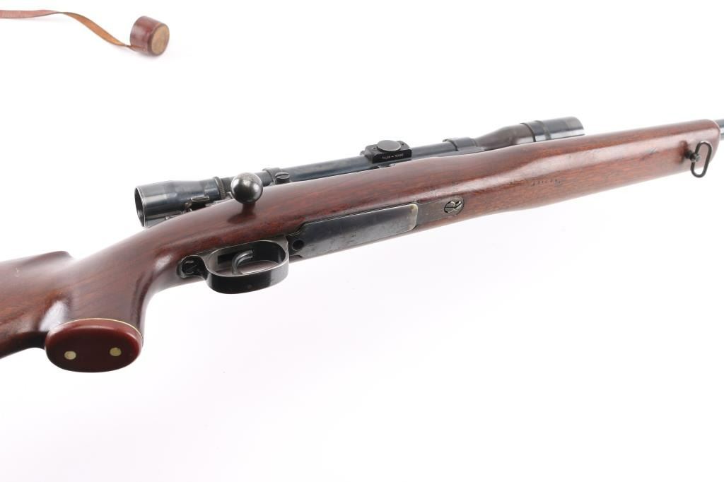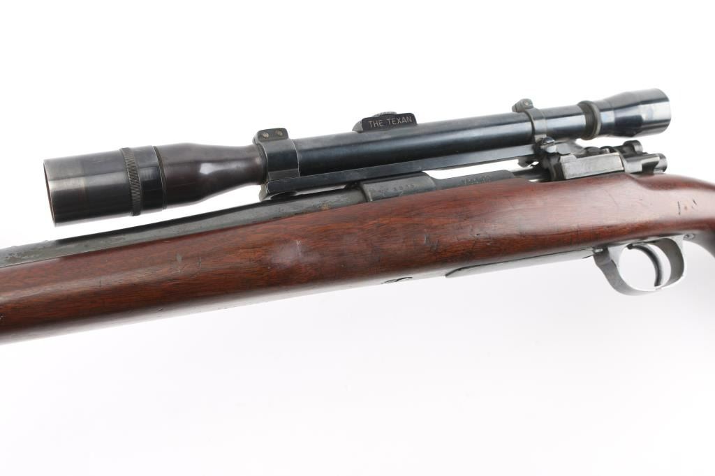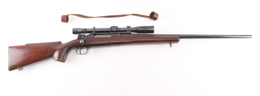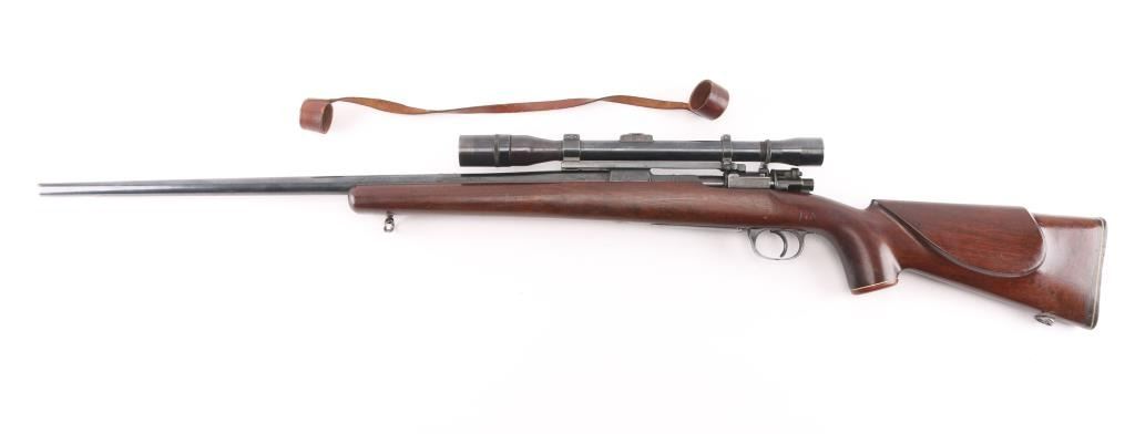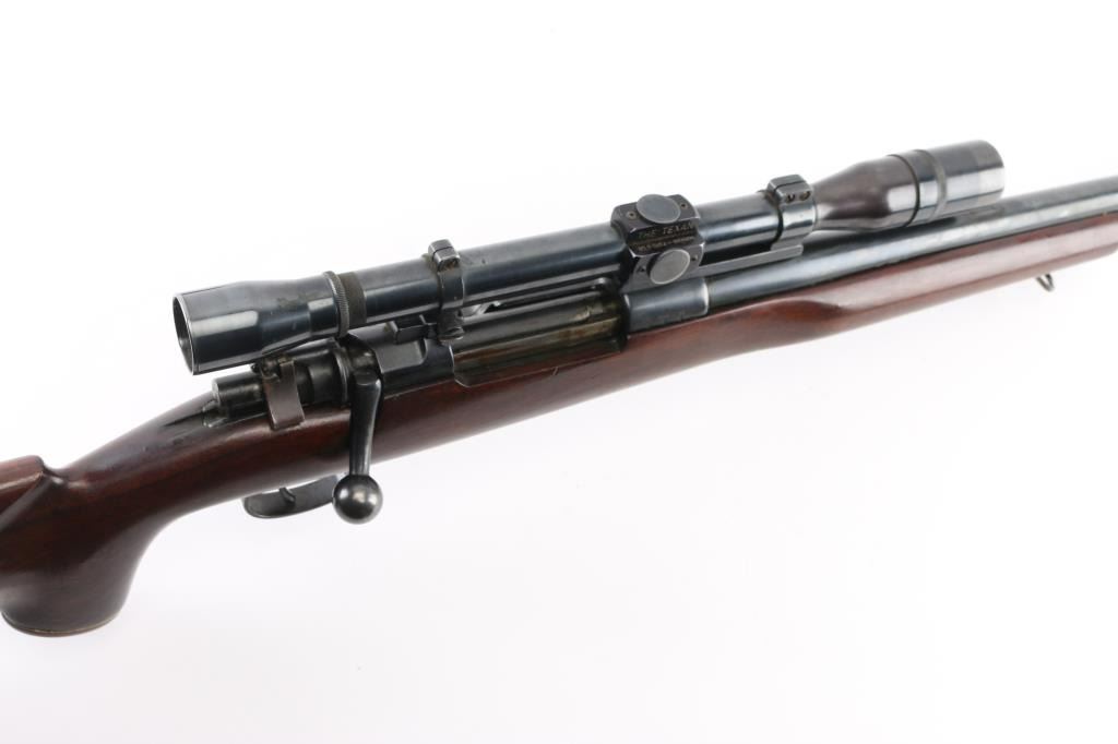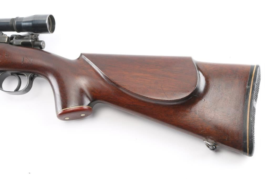 Bolt action rifle chambered for .22 Swift marked on right of chamber, built on a rare 1938 code 237 (Berlin-Lubecker) K98k Mauser action. Features blued finish, American Classic style stock, swept bolt handle, two position low swing safety, hinged floorplate, one piece scope mount, vintage Norman-Ford & Co marked 'The Texan' scope with clear optics, fine crosshairs,leather lens covers, 25" tapered barrel signed 'Peter Marciano" Stock has glossy finish, pistol grip with contrasting cap with white spacers, left side (right handed) cheek piece, sling swivel studs, plastic buttplate, 13.5" length of pull. Bore is very good/bright. Bluing is 85% with some edge wear/rubs, there is some dried cosmoline on the rear barrel, receiver, and the extractor.. Highly figured walnut stock is in excellent condition with some scuffing/scratches. A really nice job. German marking are still on the receiver with matching numbers on the receiver, floorplate, and triggerguard Condition is NRA Good to Very Good. C&R Firearm.