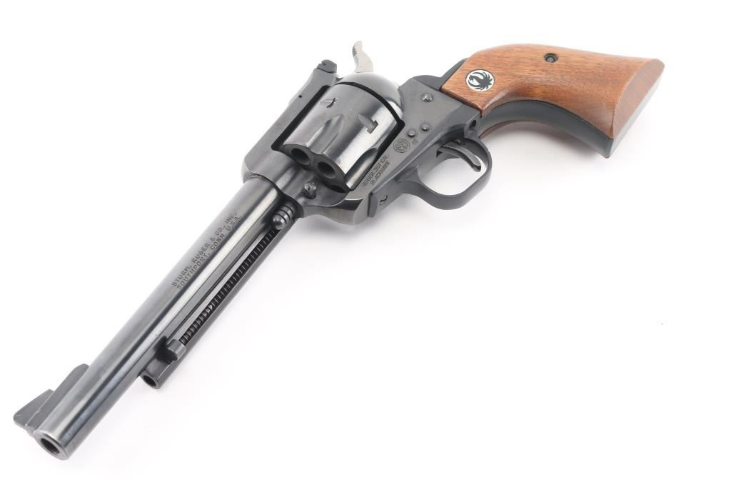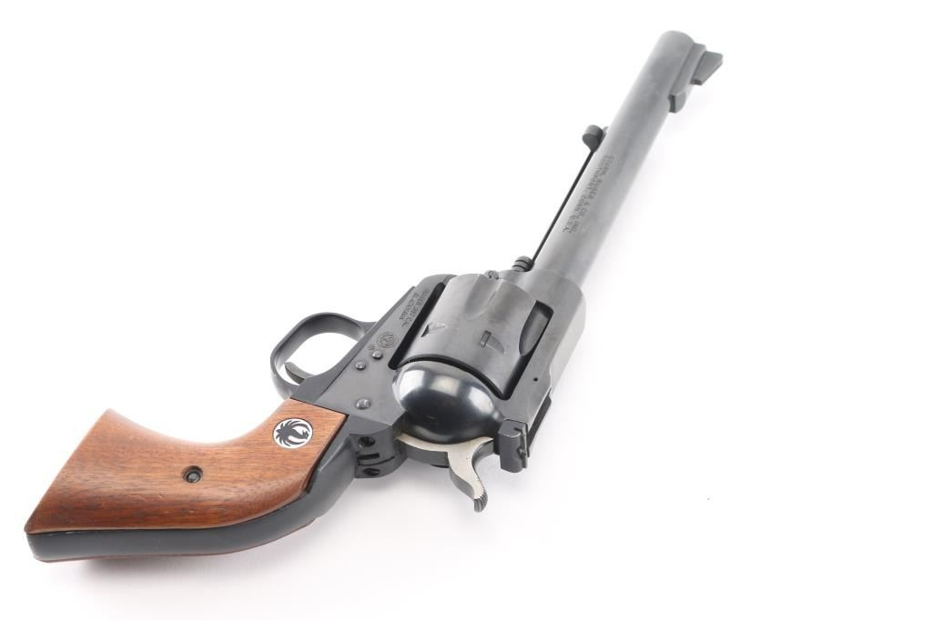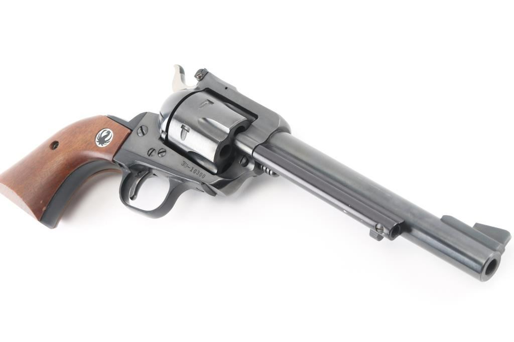 'Three Screw - Old Model' Single action revolver manufactured circa 1969. Features blued finish, smooth wood grips with Ruger medallions, adjustable sights, 6.5" barrel, round trigger guard, 6 shot fluted cylinder. Bore and cylinder charge holes are in excellent condition. Retains 98% finish with minor handling marks. Includes yellow cardboard Ruger box, manual, spare Pachmayr grip Condition is NRA Excellent *** C&R Firearm ***