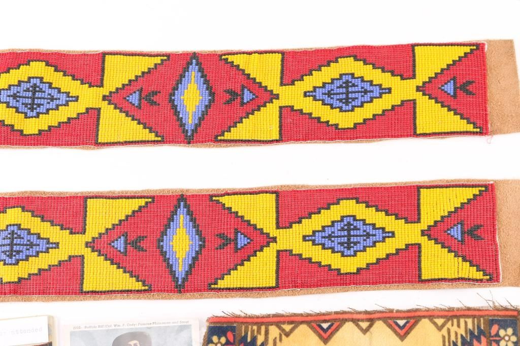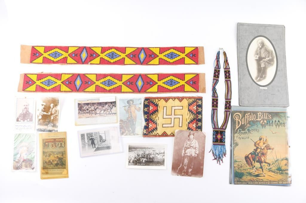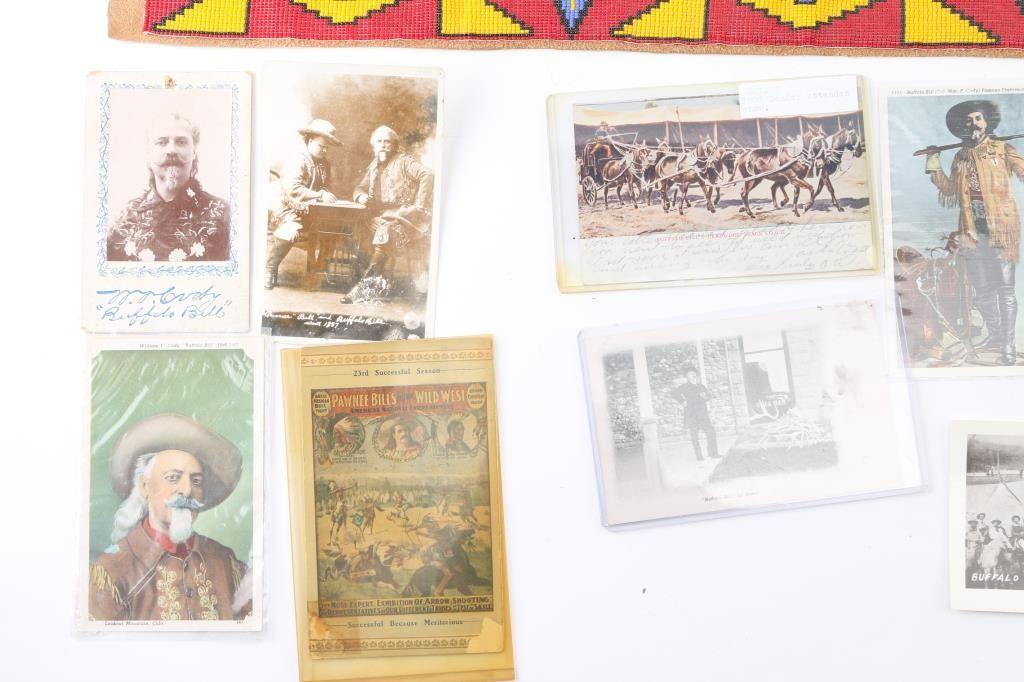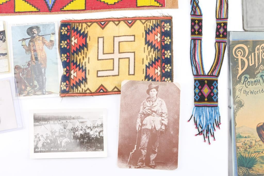 Beautiful loom beaded necklace with floral design, small good luck symbol on cloth, cabinet cards, picture of Buffalo Bill, western postcards, two beaded belt strips on leather no buckle.