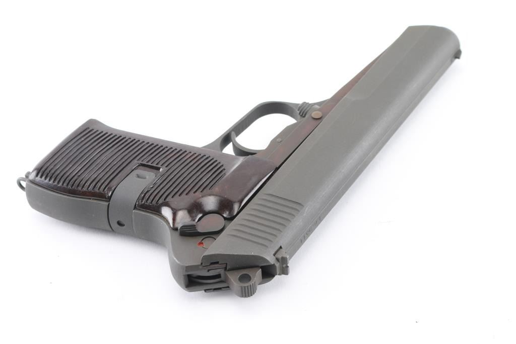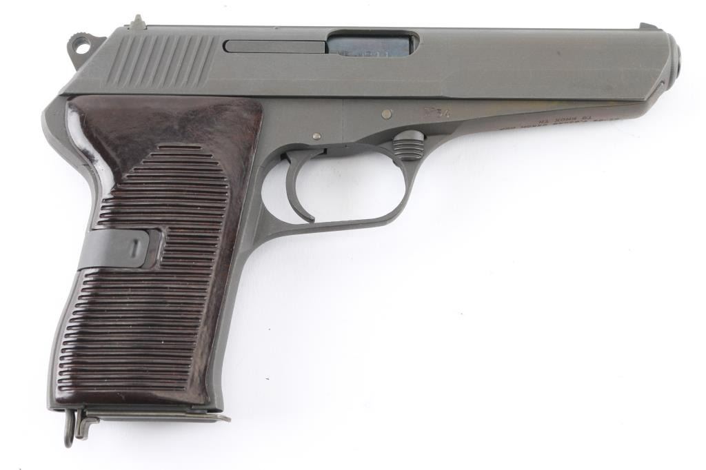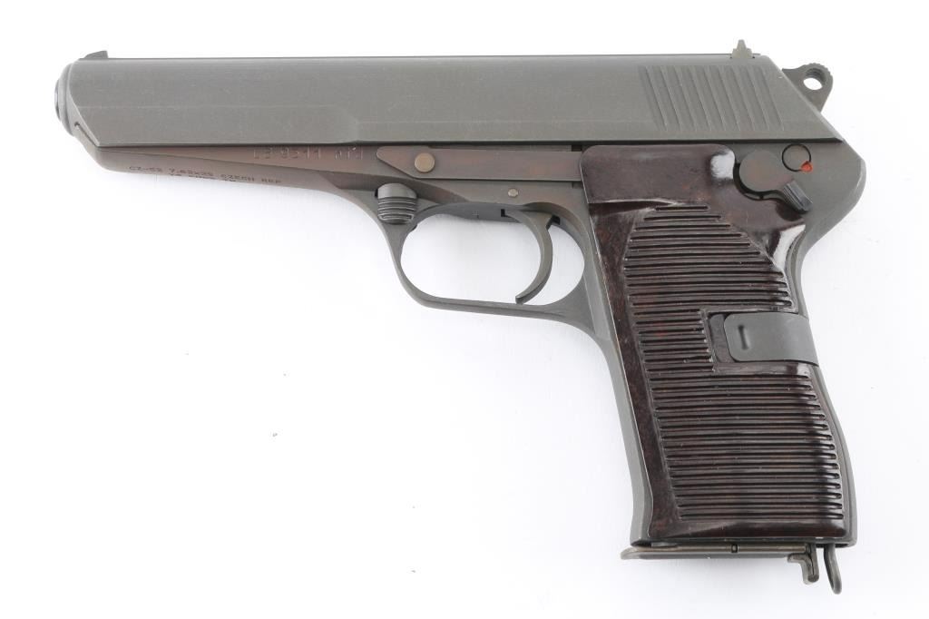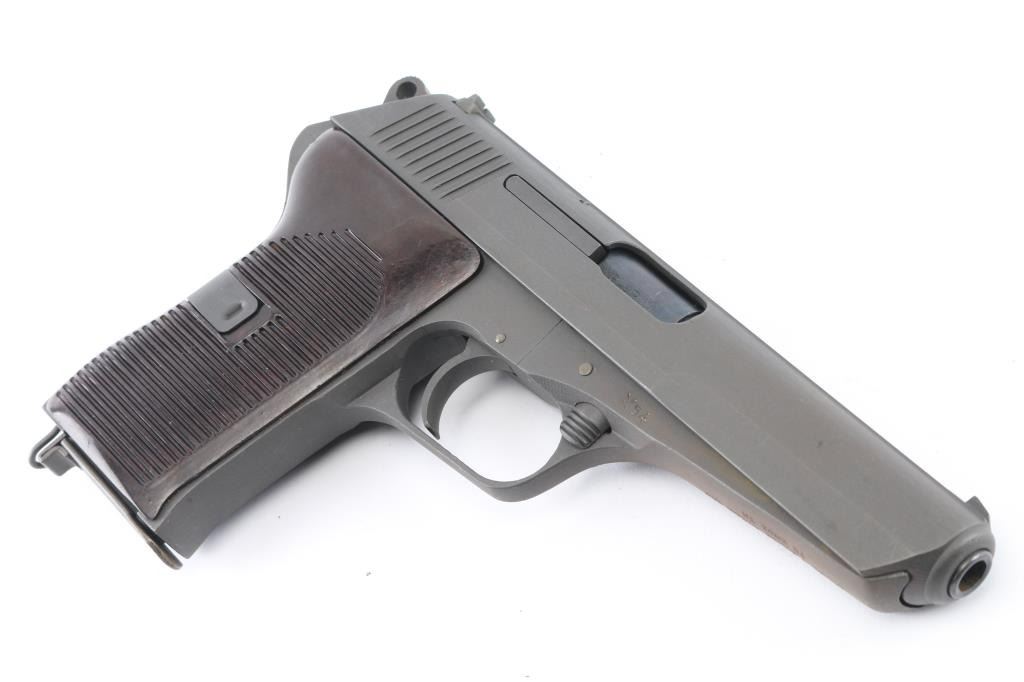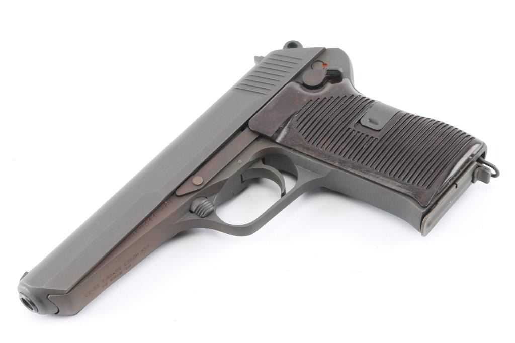 Czechoslovakian military semiautomatic pistol chambered for the 7.62x25mm Tokarev cartridge, imported by TG Knoxville, TN. Manufacture date about 1954. Features fixed sights, approx. 4.5 inch barrel, frame mounted manual decocker/safety, single action trigger, lanyard ring at butt. Bore looks good but dirty. Metal parts have a gray parkerizing that is a slightly different shade than the the frame in some areas. Grips appear to be bakelite, brown in color, and are in very good condition. Observable numbers match. Comes with one magazine. Condition is NRA Very Good *C&R Firearm*
