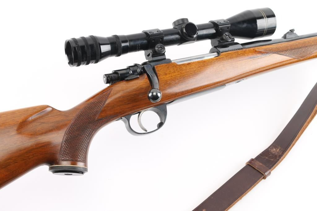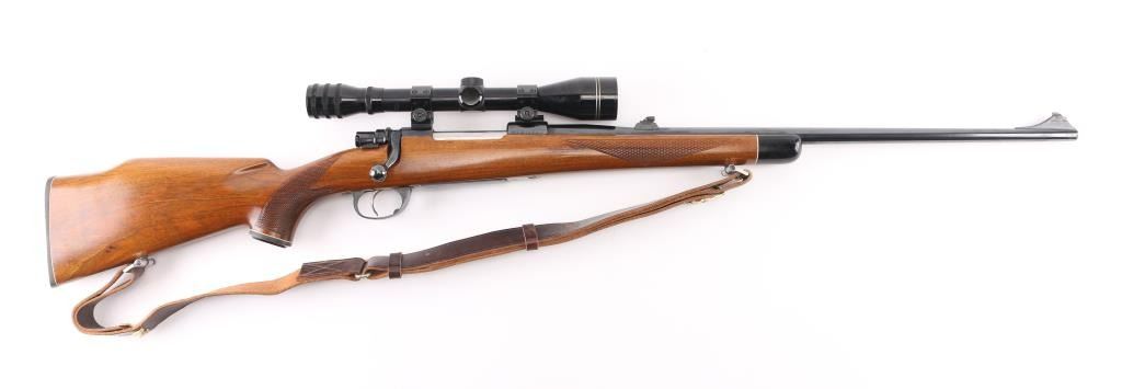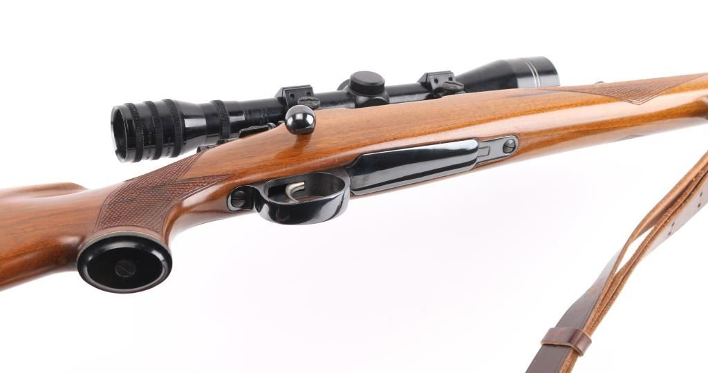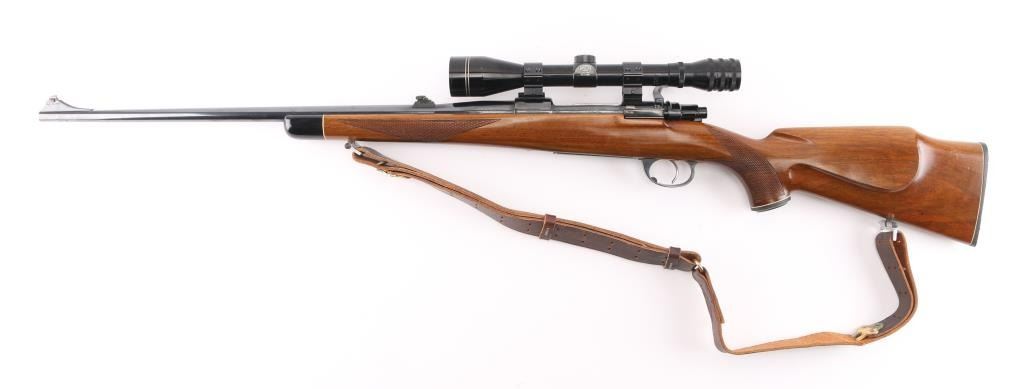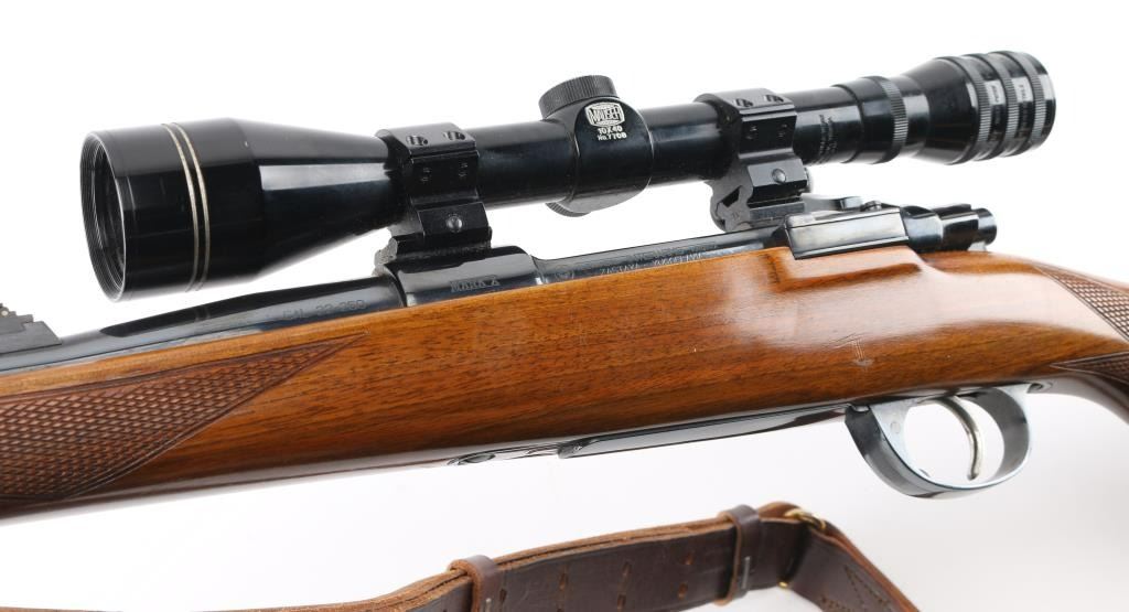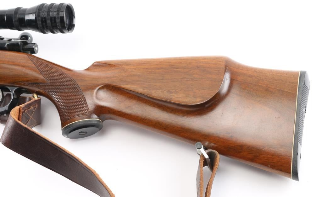 Bolt action rifle manufactured in Yugoslavia using a "CZ" marked receiver, imported by Interarms. Features blued finish, polished bare metal bolt body & extractor, walnut stock, curved semi-pistol grip, right handed cheekpiece, black plastic grip cap, factory serrated plastic butt plate, 24" barrel, raised blade front & folding rear sights, two piece Weaver scope bases and rings on receiver, sling studs (with detachable swivels installed), flat bottom bolt knob with checkering on flat, sliding manual safety on right side of upper tang, hinged floorplate. Rear sight is missing the adjustable plate (and screws) that provides a rear sighting notch. Bore is very good condition. Retains 90% finish, with handling marks & edge losses, several small patches of patina near muzzle. Stock is very good condition with few small dents & creases. Mounts a very good condition Mauser 10x40mm scope with fine crosshair, clear view. Includes good condition leather sling, box (20 rounds) of Norma ammo. Condition is NRA Very Good++ *** Modern Firearm ***