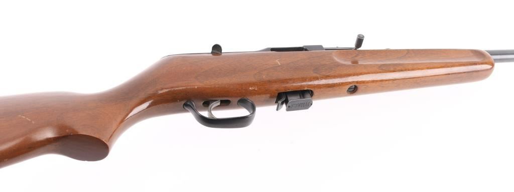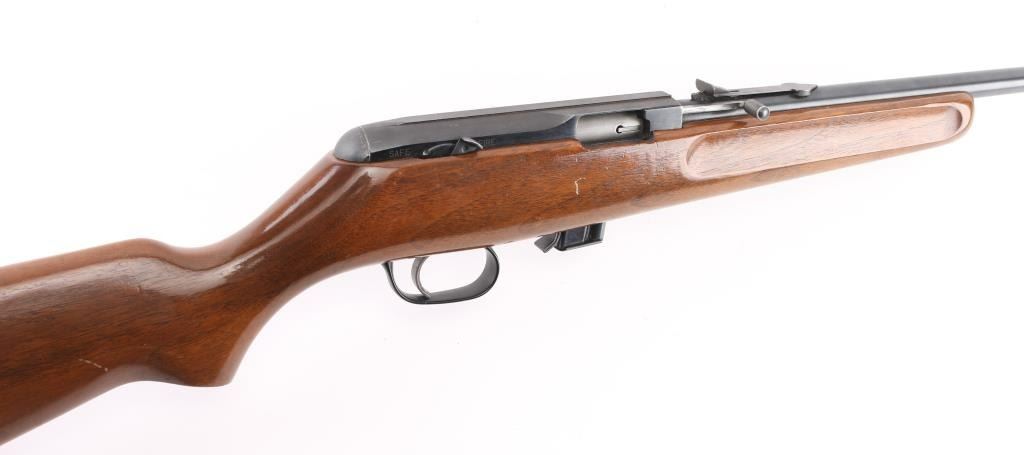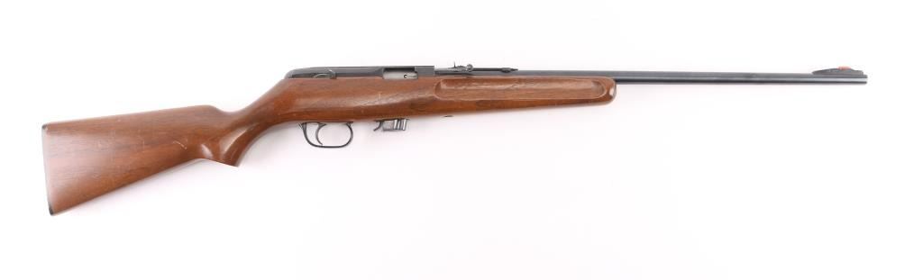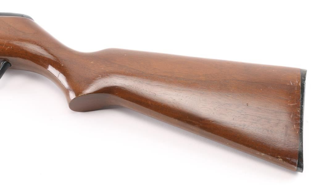 Semiautomatic rimfire rifle manufactured circa 1958-1964. Features blued finish, smooth wood stock, 22" barrel, raised blade (orange fiber optic) front sight, sporting rear sight, detachable magazine appears to hold approx 7 rounds, manual safety, non reciprocating charging handle, manual bolt hold open. Stock has wide shallow grasping grooves on sides of forend, black plastic trigger guard, serrated black plastic butt plate. Bore is very good, a bit dirty. Retains 90% finish with handling marks. Stock is very good with scratches and small dents. Condition is NRA Very Good++ *** C&R Firearm ***