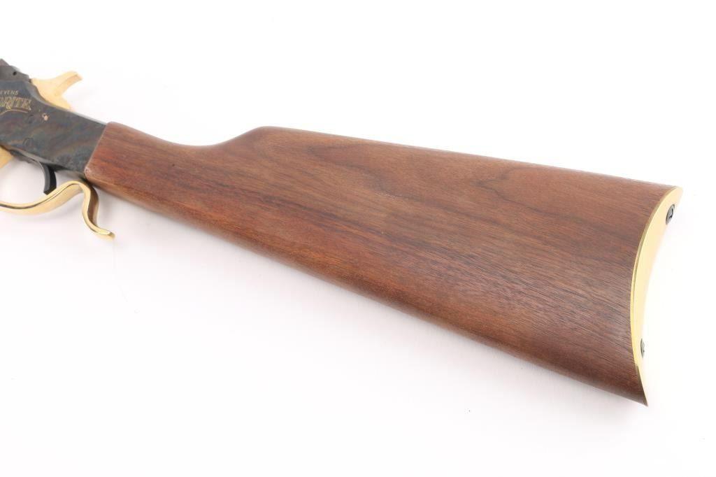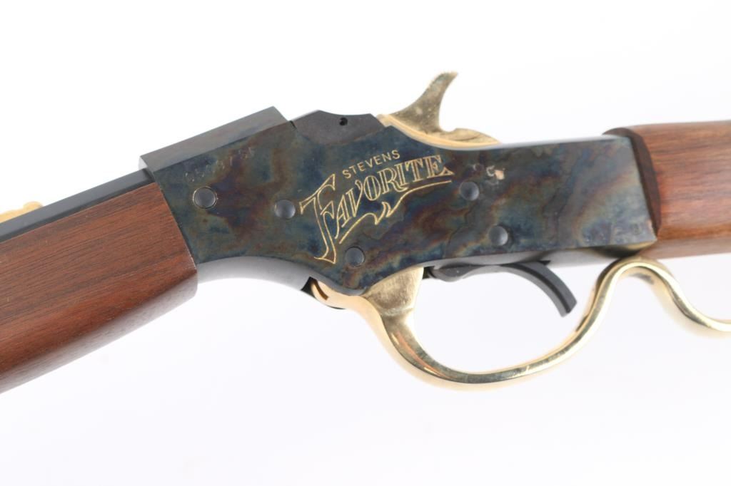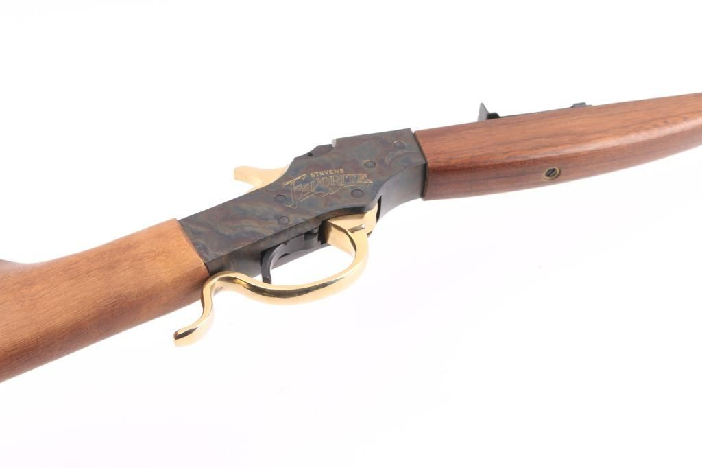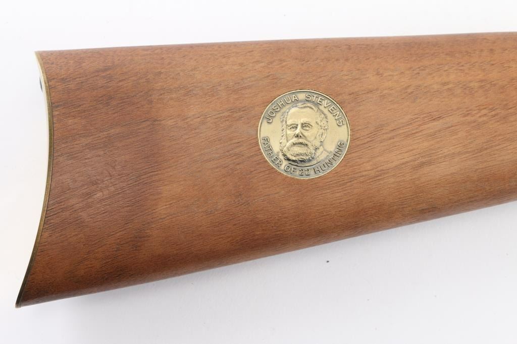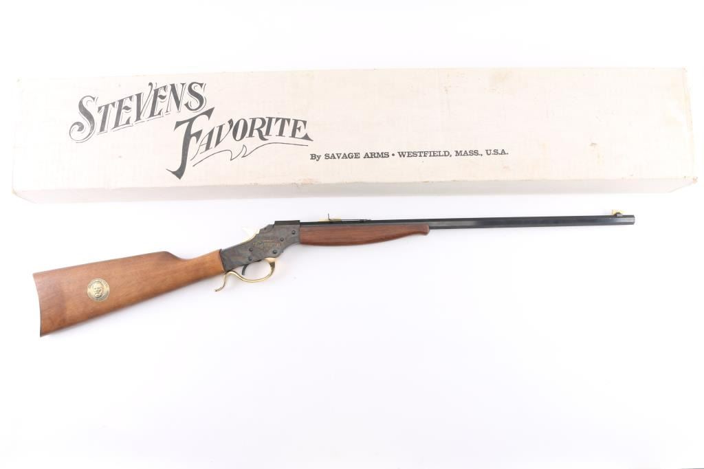 Stevens Favorite' Commemorative falling block single shot sporting rifle celebration the "Father of 22 Hunting", Joshua Stevens. Number 9,452 of only 20,000 produced circa 1971. Features a blued 22" octagonal barrel, dovetailed front sight with brass blade, elevation adjustable rear, case hardened receiver engraved "STEVENS FAVORITE" on both sides, smooth trigger with beveled edges, brass plated hammer, buttplate & finger lever, smooth wood forend and straight grip shoulder stock & inlayed commemorative coin in the right side of the butt. Rifle exhibits all of the metal finish. Action is sound, the bore is excellent and the wood stocks are fine. NRA Condition-Perfect in Box. C&R Firearm.