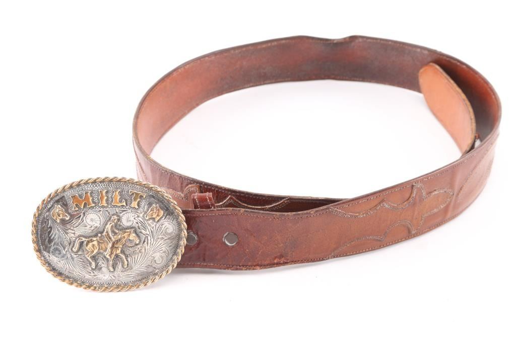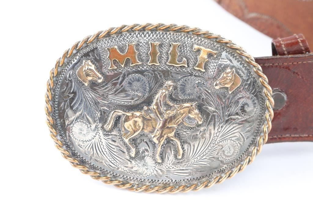 depicts a 3 legged horse and has the "Milt" name on it. All sterling measures 41" from end to end on brown belt