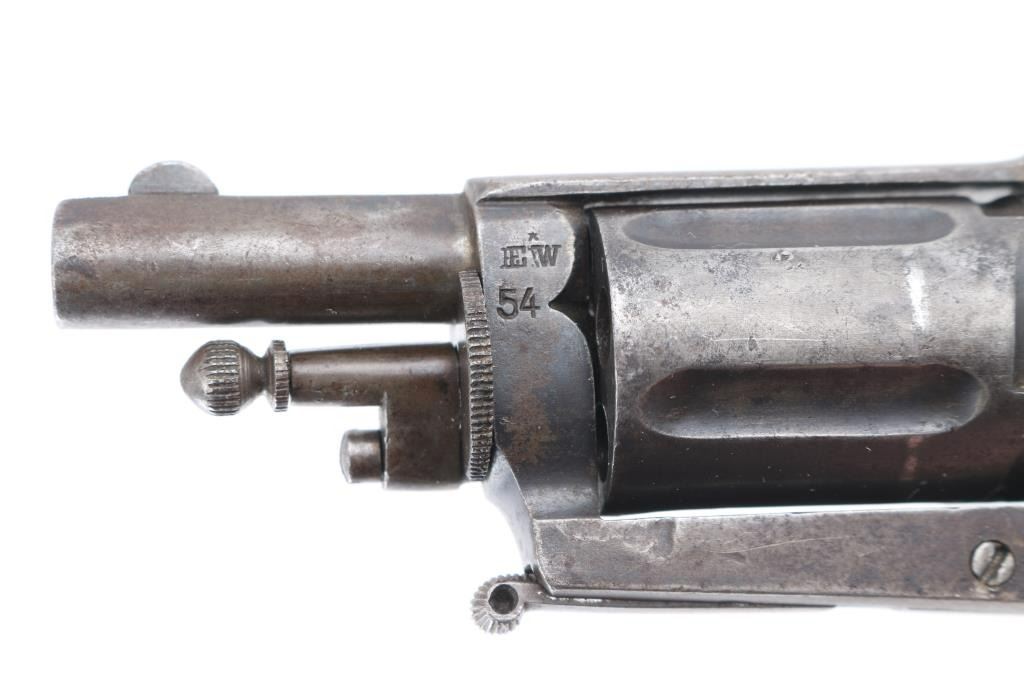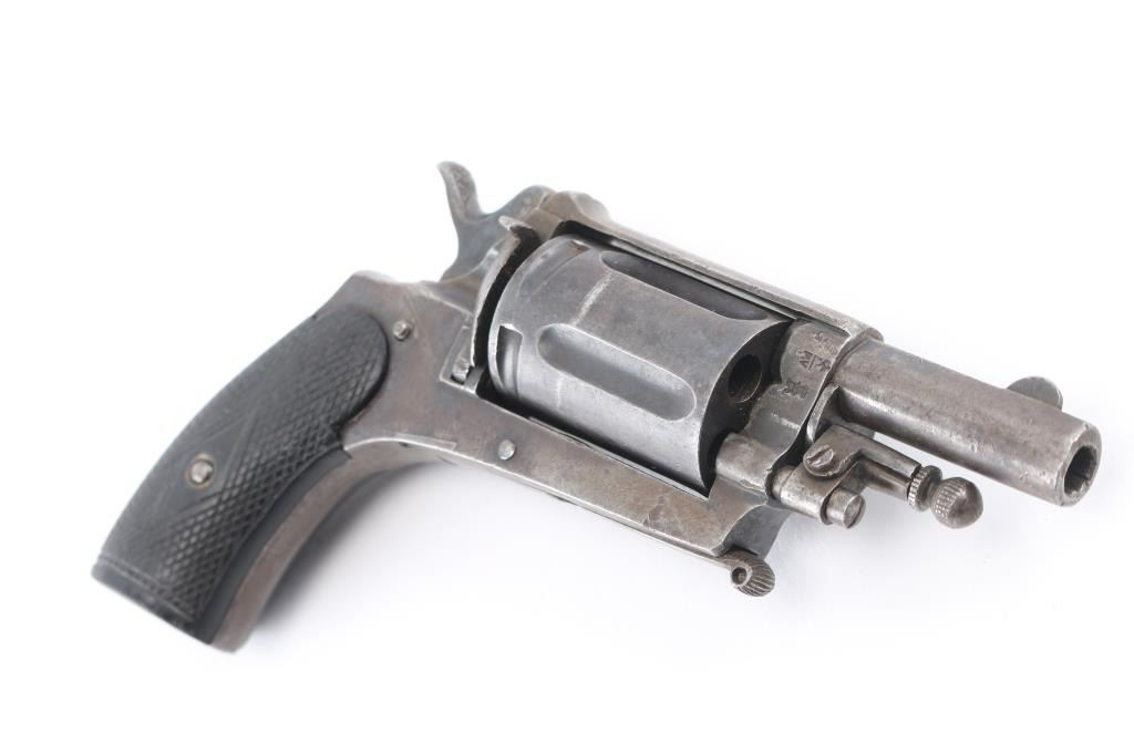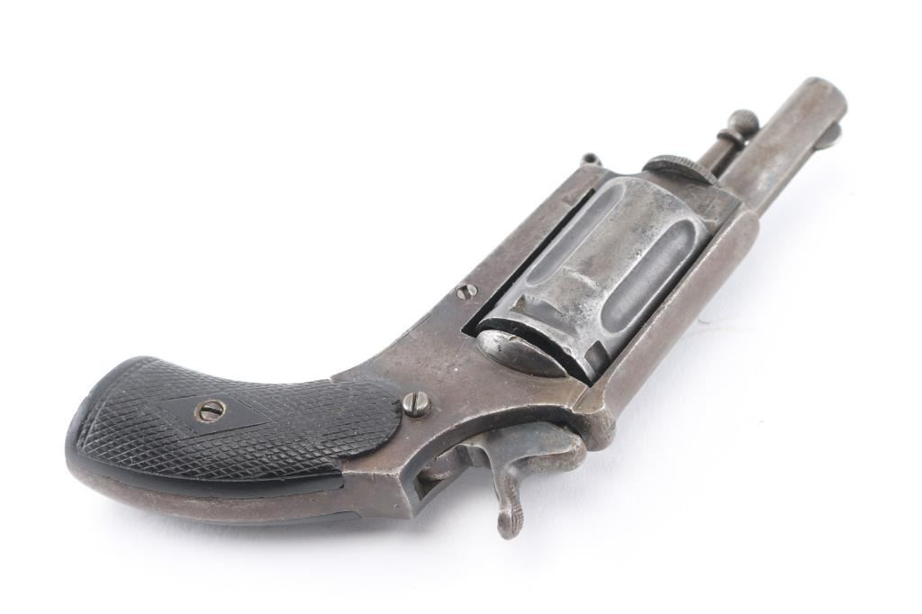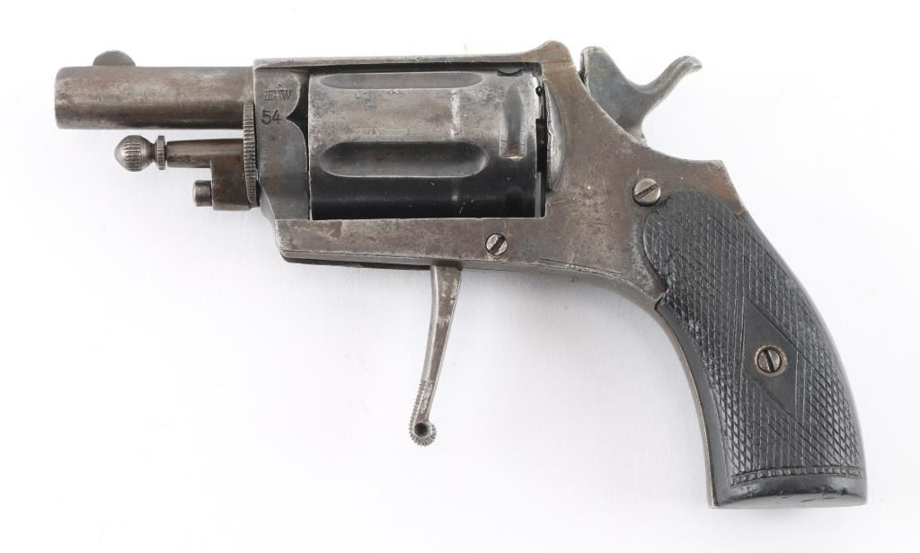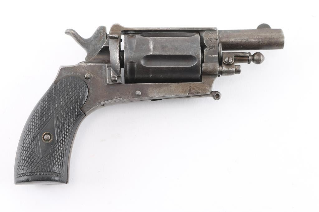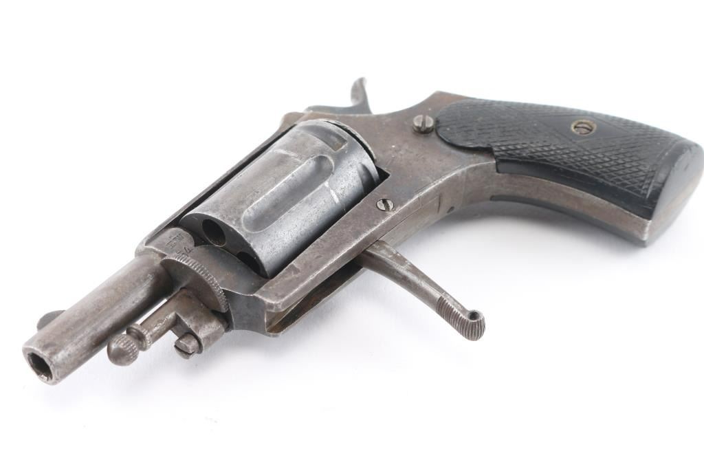 Small, compact 5-shot revolver with folding trigger designed for cyclists (Velocipede is French for bicycle) for defense against dogs. 5 1/4" overall with 1 1/2" barrel. Double-action. Swing out ejector rod. Liege proof on cylinder, "R" under crown proof on barrel, meaning rifled barrel , 1894. Trigger drops when cocked. Bore and cylinders are very good, need cleaning. Checkered hard rubber grips are very good, action is crisp/tight, metal finish has turned a gray patina with traces of blue. NRA Condition-Very Good as Antique Firearm