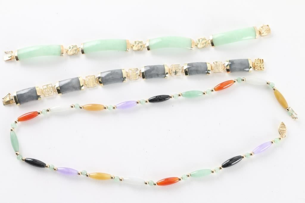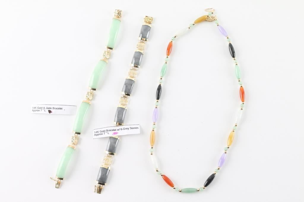All consisting of muti-colored jade set in 14K yellow gold (1) Jade & Gold Bracelet approx 7" (1) Gray Jade Stone & Gold Bracelet (1) Multi colored jade stone necklace with 14KT yellow gold beads 18" long with gold clasp.