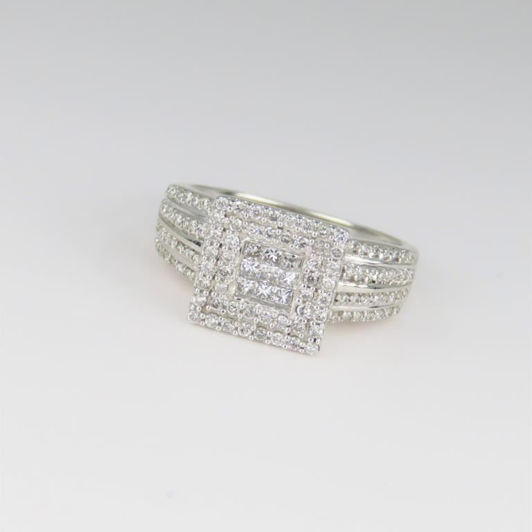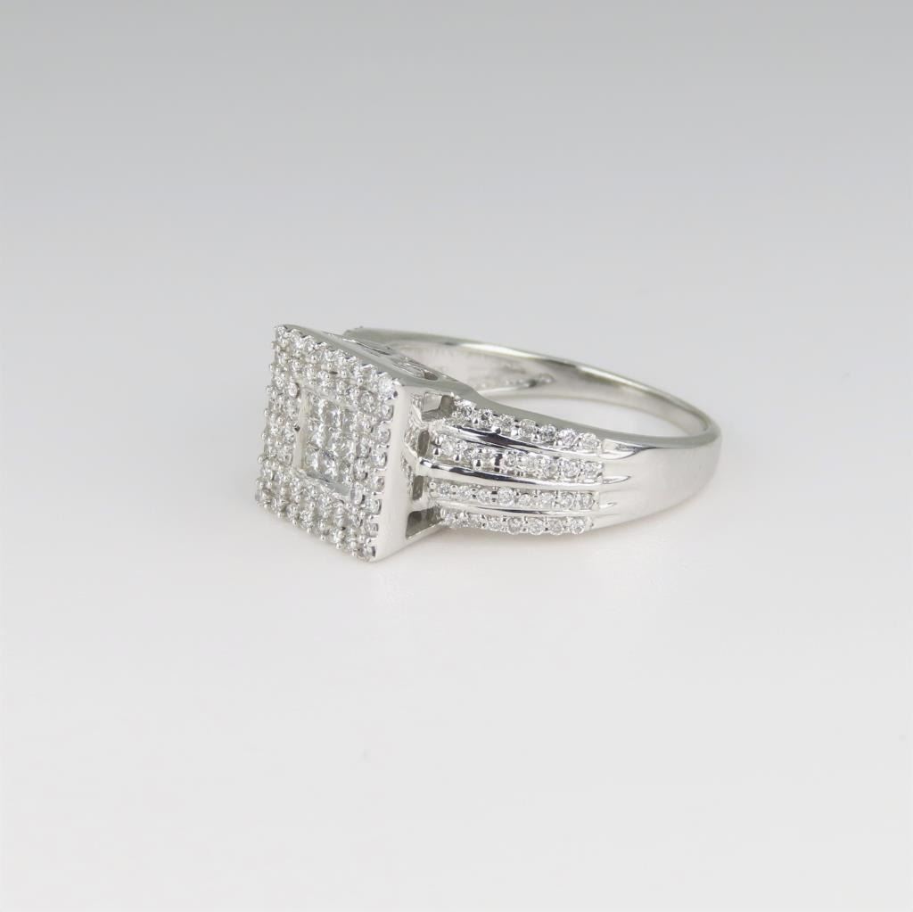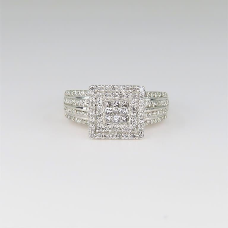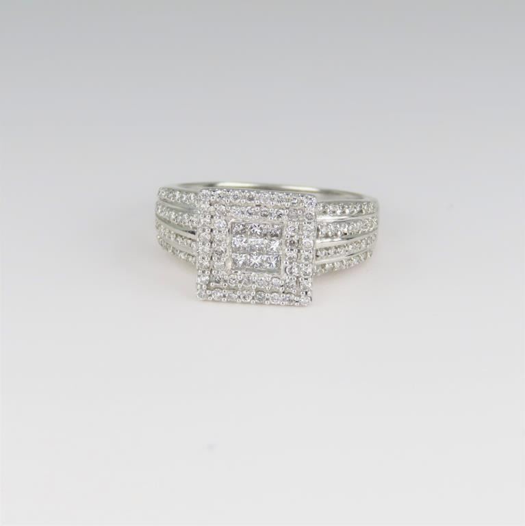 featuring over 120 micro set round and Princess cut Diamonds weighing approx. 1.00 carats total with F-G colors and VS clarity set in a finely detailed 10 karat white gold setting.