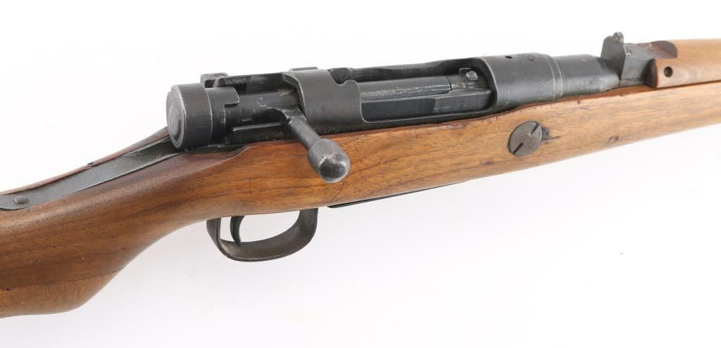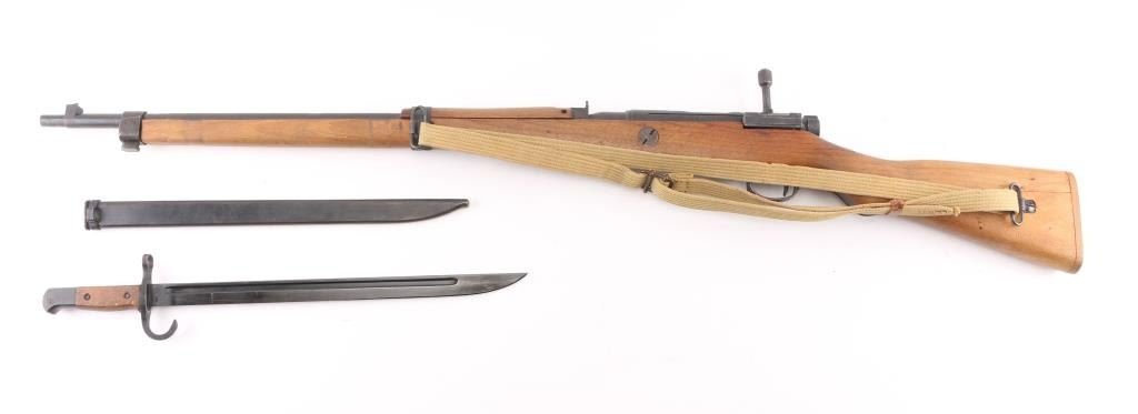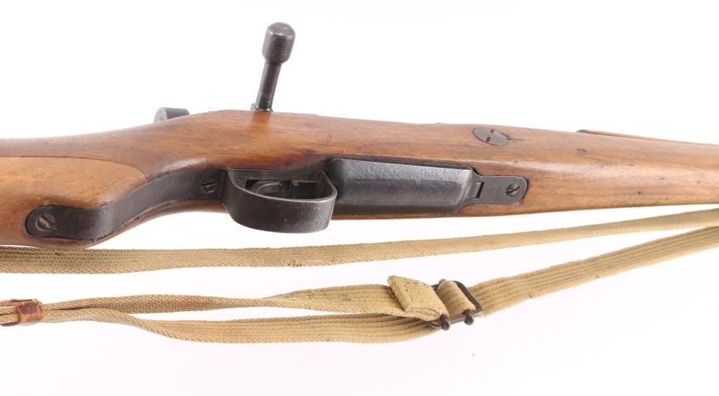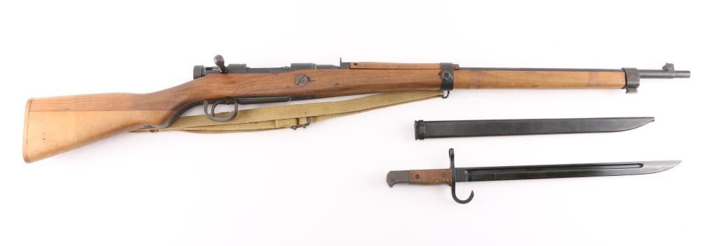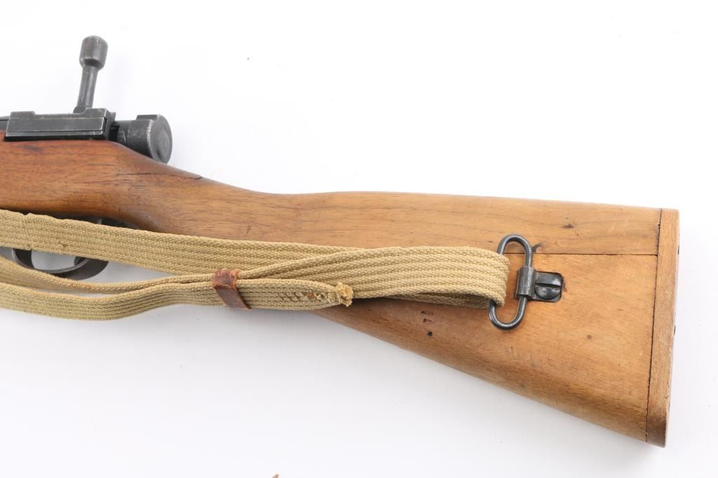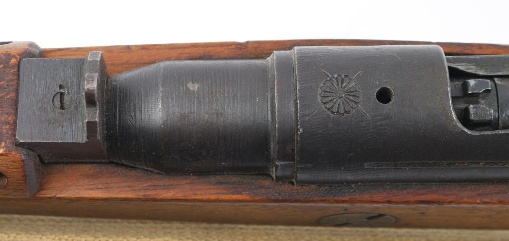 Bolt-Action Rifle. Japanese WW2 Infantry Short rifle 'Series 10' 'Last Ditch' crude/rudimentary rifles built to minimum standards needed to function. Most of these rifles were still in Japan when the war ended and had the mum ground off. This one has a full mum so it is certainly a capture/bring back, quite rare. 25" barrel, front blade, fixed peep rear sights. Serial numbers match on receiver, and bolt. Wooden buttplate. Shortened handguard, etc. No channel for cleaning rod. Bore is dark/rough. Action is smooth. Upper stock is loose. Milled barrel. There is a very faint X on the mum, barely noticeable. A period tan canvas sling with metal buckle, and leather keeper, there are 4 faint Japanese charters stamped on it. Also included is a very good conditioned 15" Arisaka bayonet w/scabbard. National Denki under Kokura supervision arsenal marked. A nice example of a very late Arisaka "Last Ditch". NRA Condition-Good. C&R Firearm.