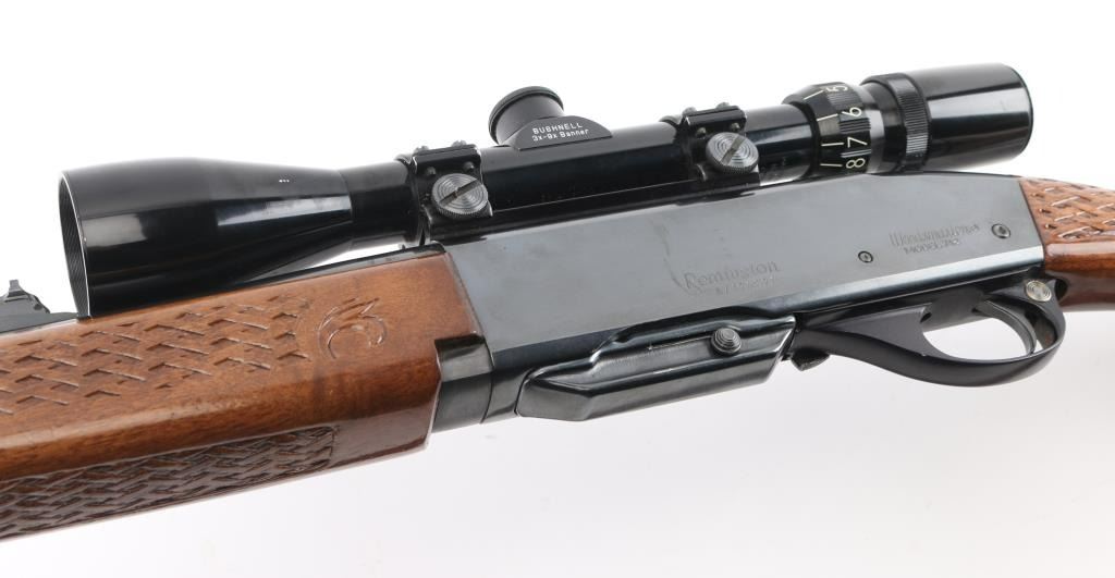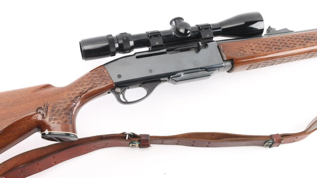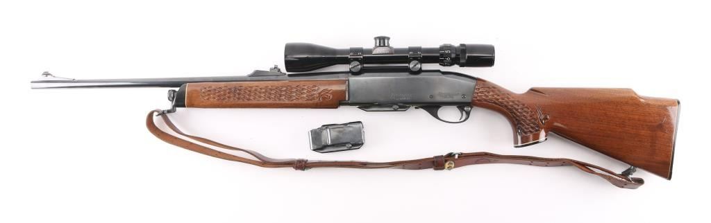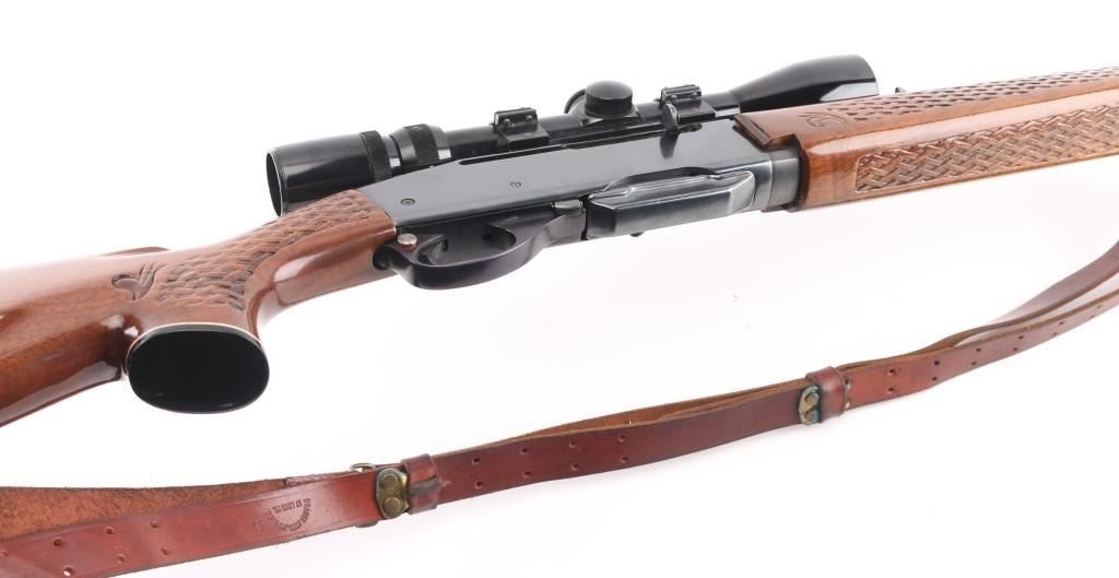 'The Woodsmaster' Semiautomatic rifle manufactured circa 1977. Features 22" tapered barrel, ramp front sight with beaded blade, adjustable rear sight, Weaver type scope mount with rings, with a Bushnell 3x-9x Banner scope, clear optics, manual safety, blued finish, wood stock with impressed checkering at wrist & forend. Right side cheek piece for left handed shooting. Bore is very good/bright condition. Retains 97% blued finish, there is a 1.5' scratch on the left receiver. Wood is very good with few small dents/scuffs. Includes two magazines, and brown leather sling Condition NRA Very Good. Modern Firearm.