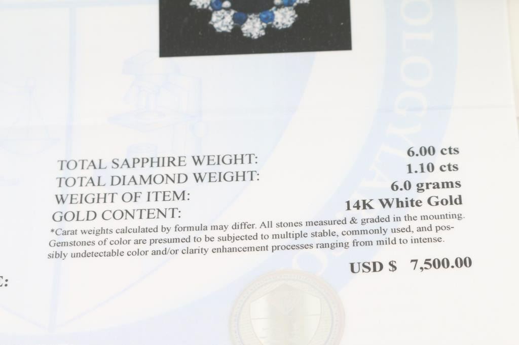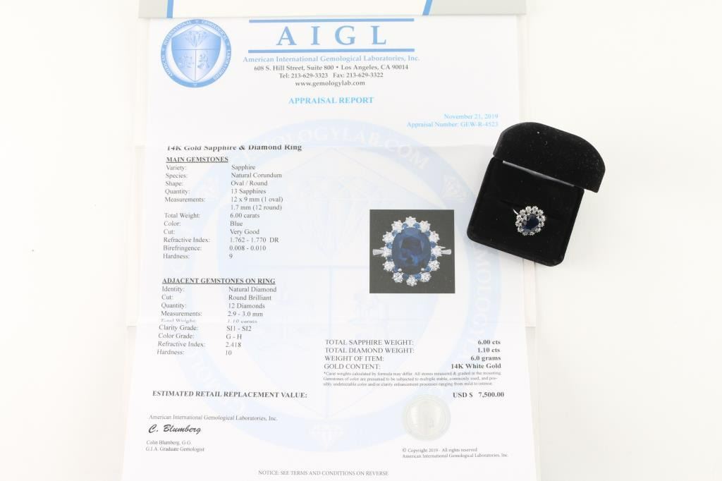 6.00cts Oval Sapphire surrounded by 1.10cts of diamonds G-H color set in 14Kt white gold with a princess Diana style setting. Includes an appraisal report from AIGL stating replacement value is 7500.00