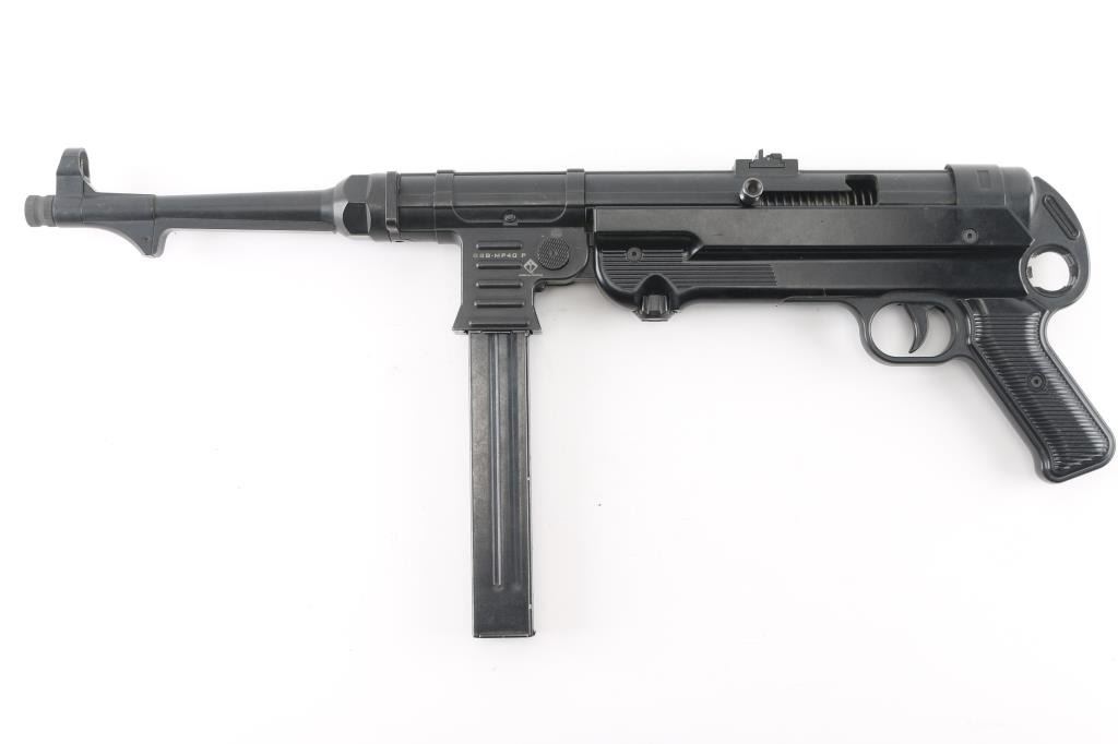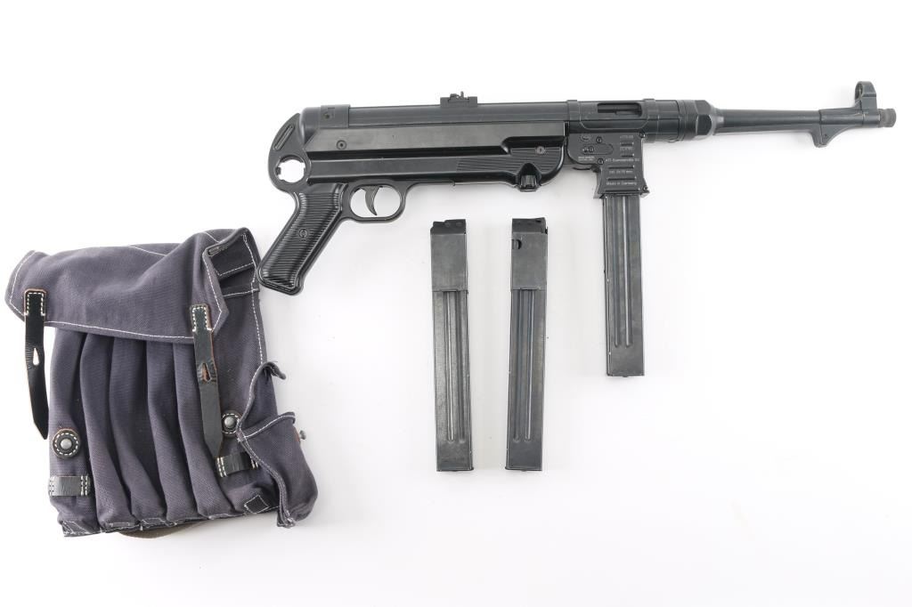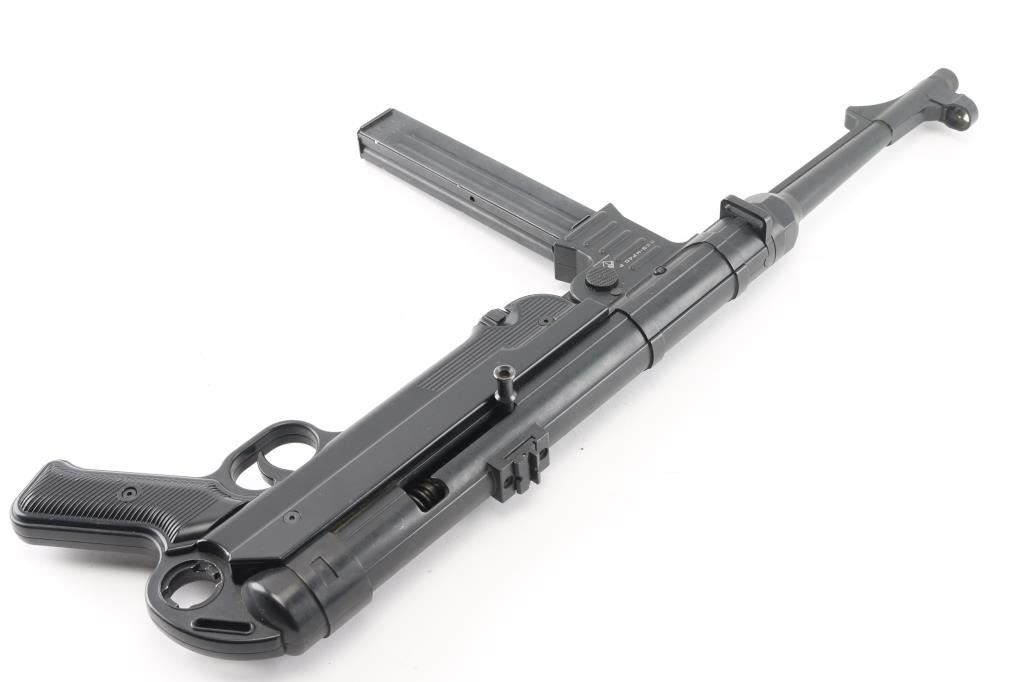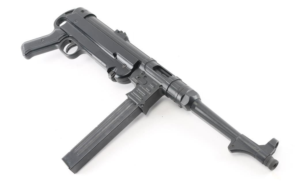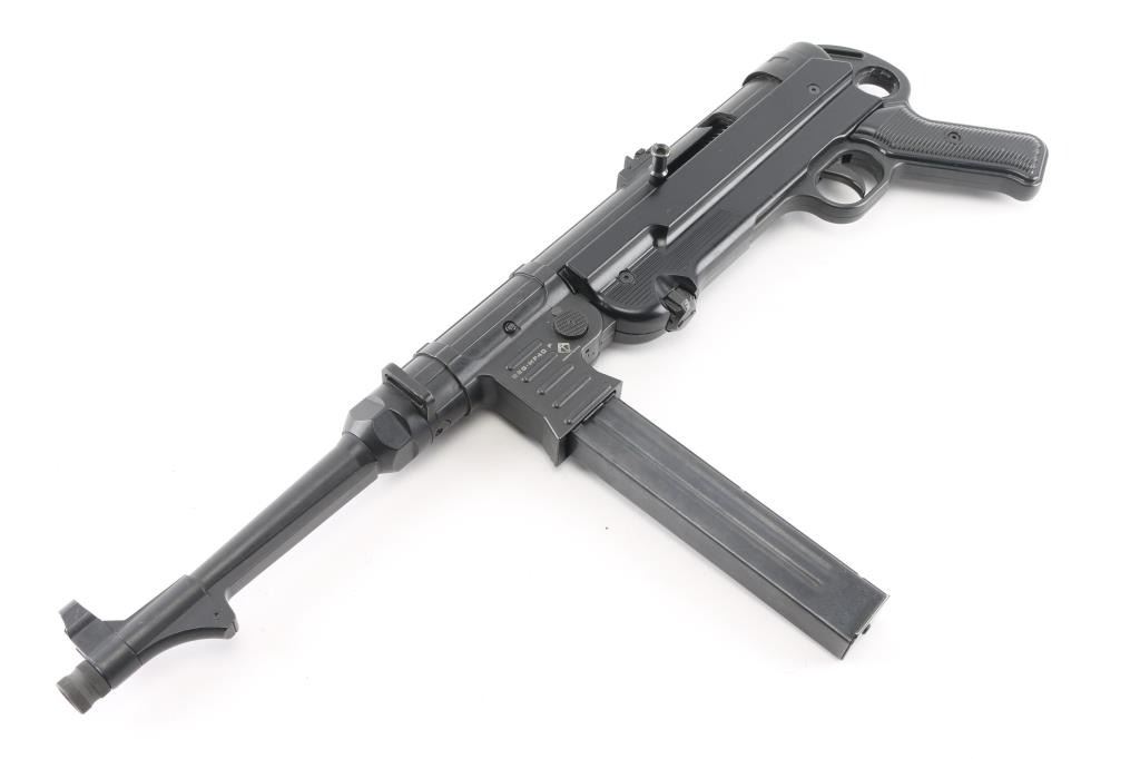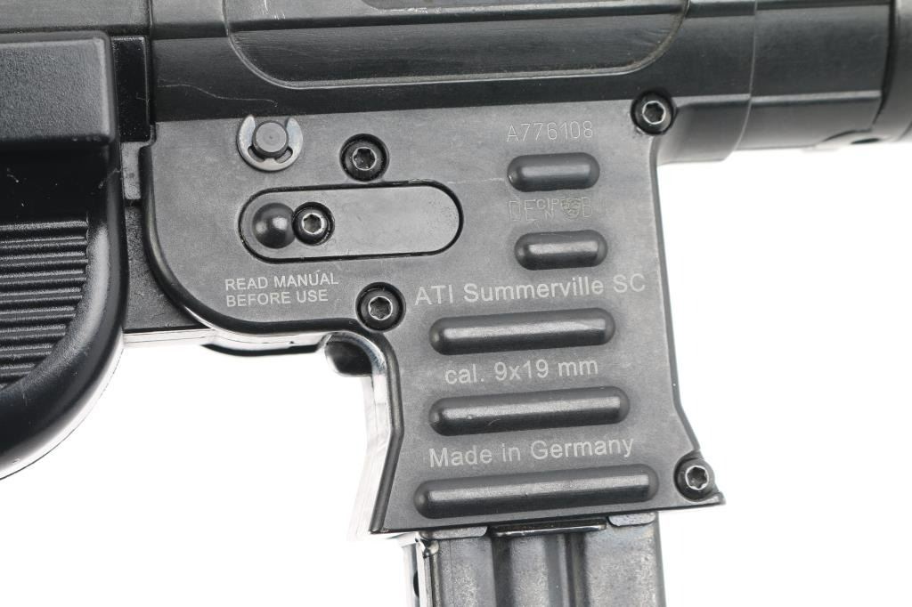 German made semi-automatic pistol imported by ATI. Replica of the classic German WW2 MP 40. Recoil operated, self-loading with blowback action.10' barrel with hooded front, and adjustable rear sights. Bore is pristine, metal finish, and synthetic furniture are excellent. Rotary safety located on the receiver bottom behind the magazine port. One 25 rd steel magazine. Comes in original box with manual, 2 spare magazines6, 6 magazine pouch with strap, mag loader, spare parts and tools, and lock. NRA Condition-Excellent. Modern Firearm.