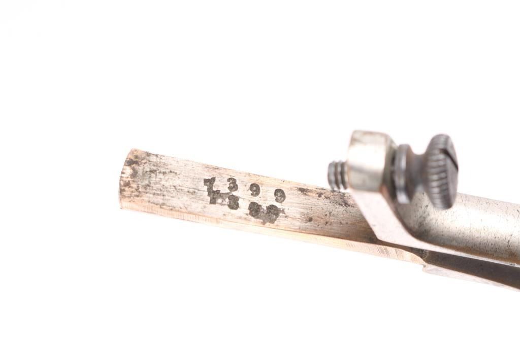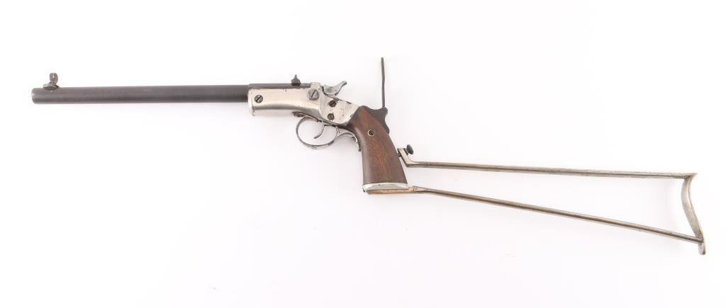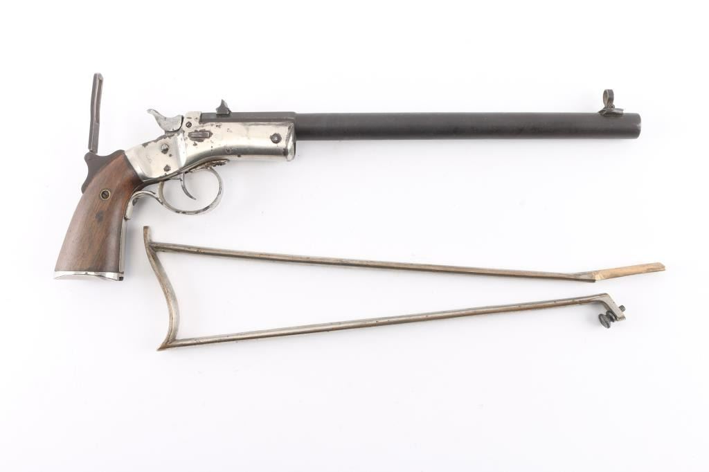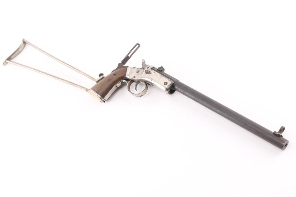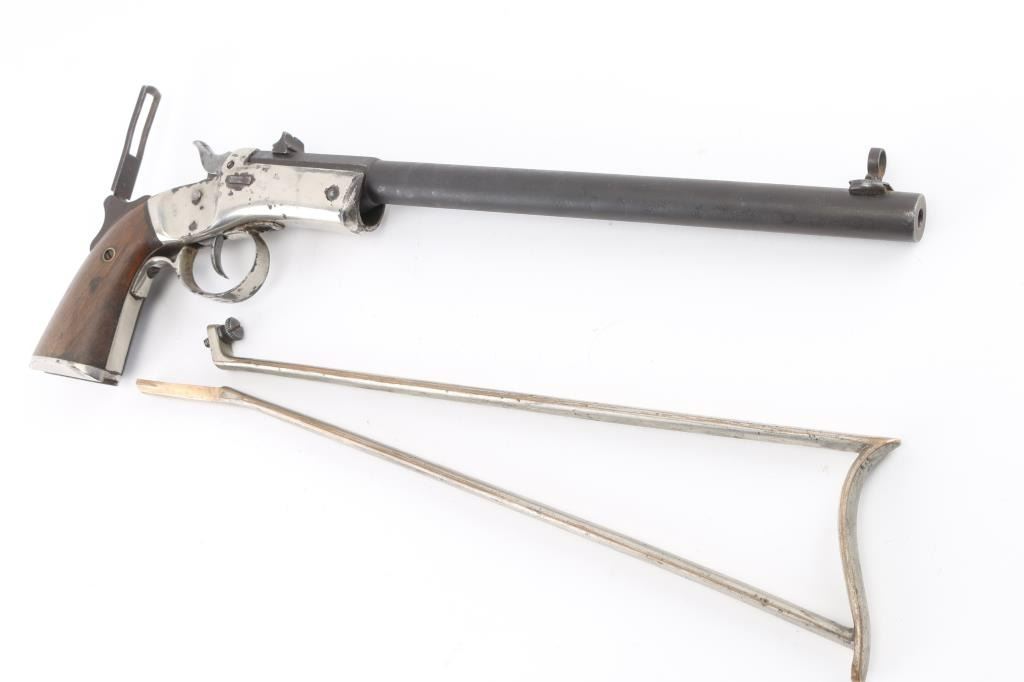 This is the very rare Stevens Vernier New Model pocket rifle made 1896-1915, total quantity estimated about 2500. Blued and nickeled single-shot, top-break pocket rifle with a 10" octagon/round barrel and a Vernier rear sight on backstrap (missing slide). Post front sight with folding globe. With mismatched, but correct butt stock. (#7399) The plating is flaking off leaving ~90% nickel. The bluing has gone to dull blue patina. Bore is shiny with some roughness and good rifling. Action works well. C&R eligible. Condition is good. C&R Firearm