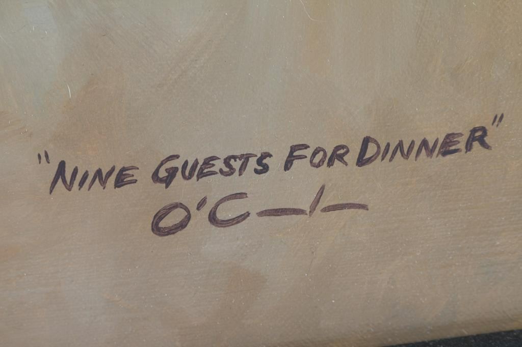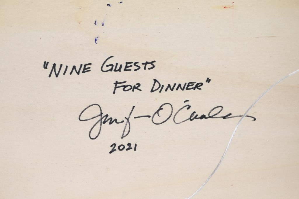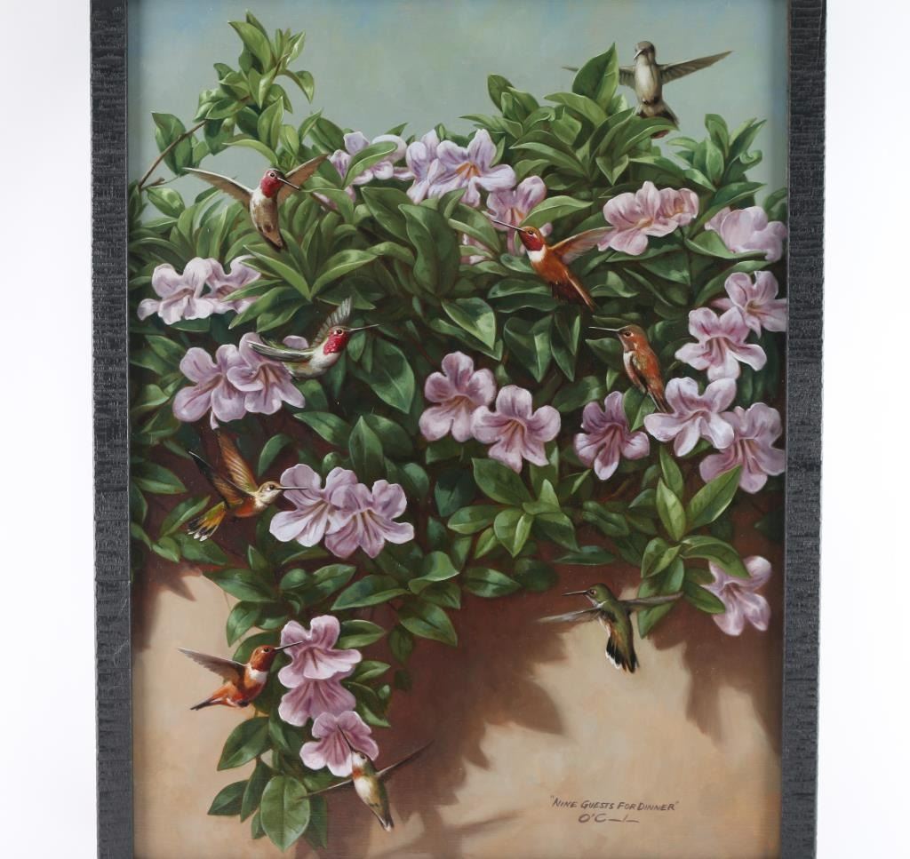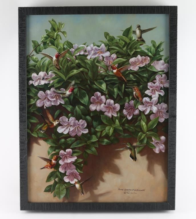 by JENNIFER O'CUALAIN entitled "Nine Guest" depicts hummingbird among flowers. Image size is 23x17" Jennifer O’Cualain is a prolific painter of all things natural. Her popular wildlife paintings touch on the idea of illustrating the simple and honest physical characteristics of many species ranging from field mice to bison.“I strive to make my paintings more like portraits than typical animal art. The feel of fur under your hand is a relatively universal goal, but I want my viewer to get a sense of the individual animal.”