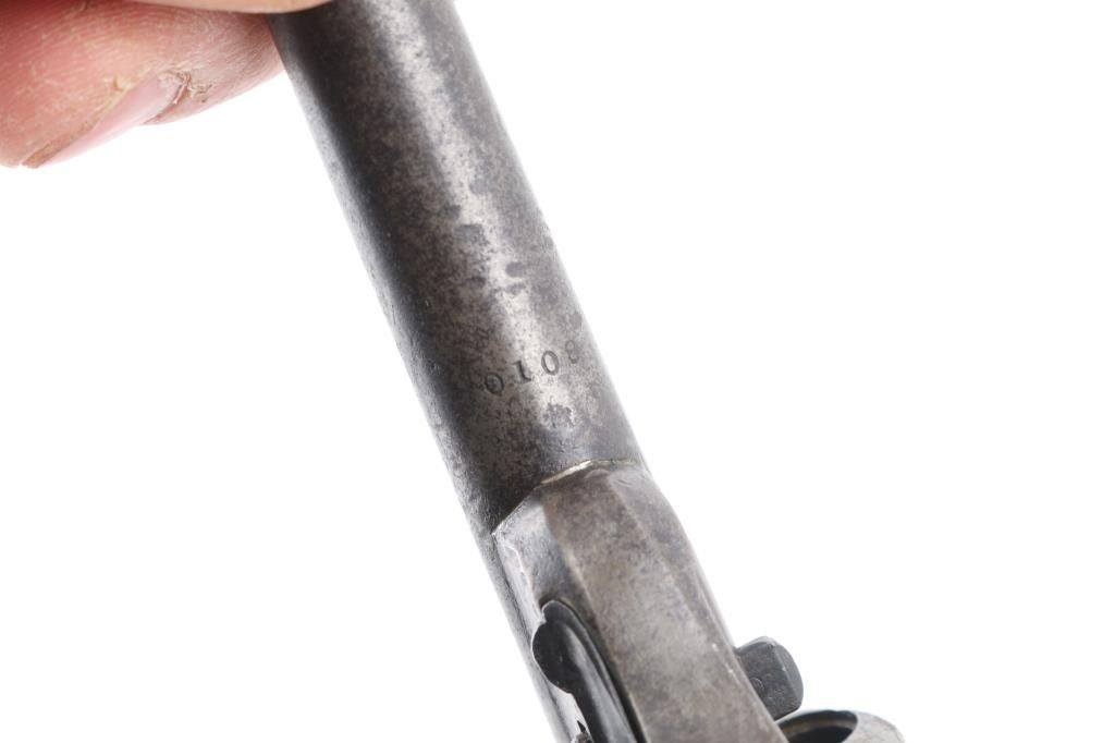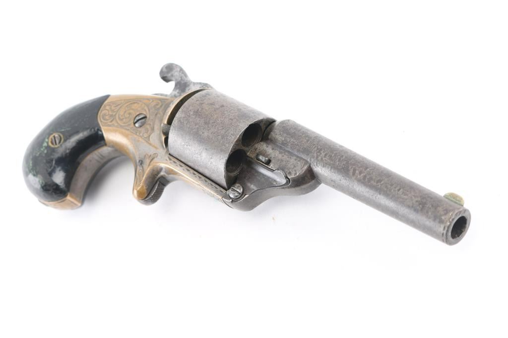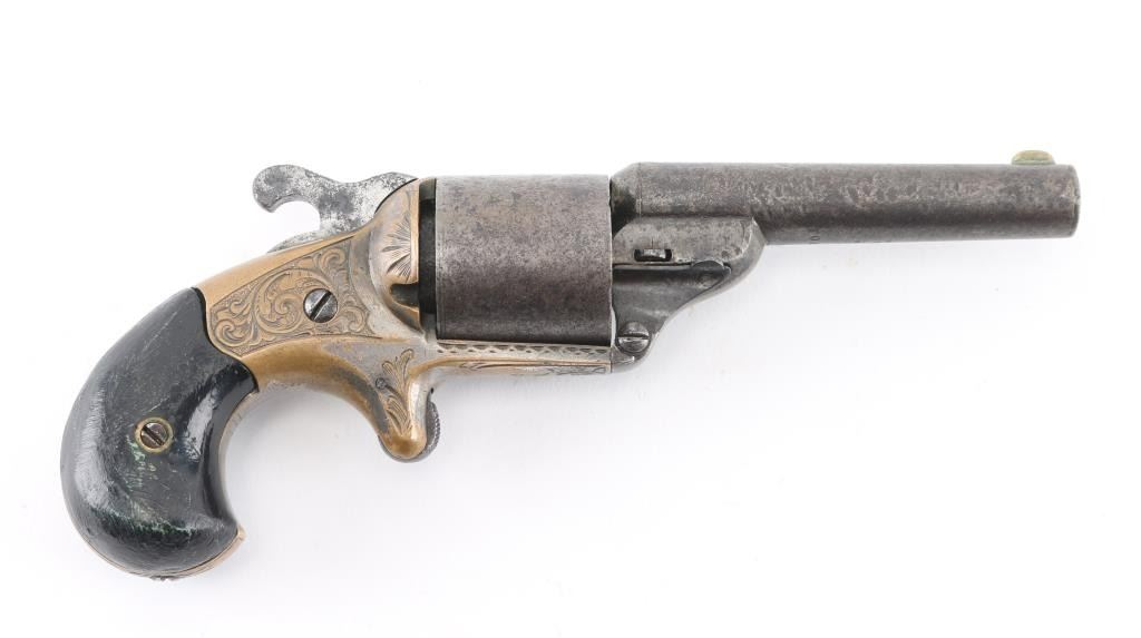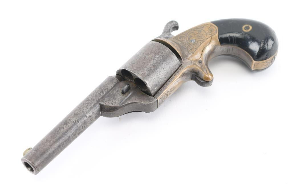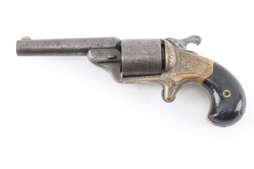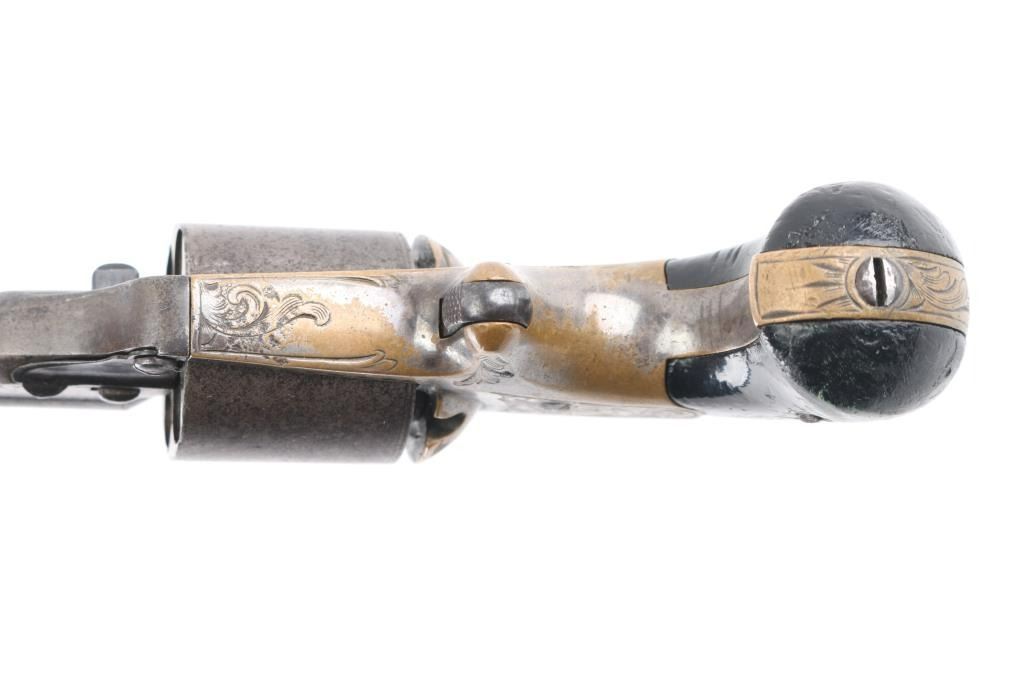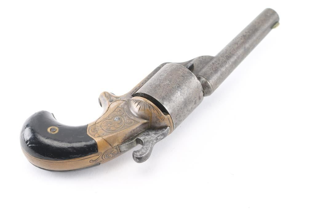 Front loading spur trigger single action pocket revolver using the teat fire ignition system to circumvent the S&W patent on a bored through cylinder. Patent date of 1864 so could be late Civil War pistol. Condition: Brass frame shows traces of blue, steel barrel and cylinder show no finish but serial number is clearly visible on the underside of barrel. Engraving on brass frame is of high quality and very likely original to the gun, hammer does not stay cocked. NRA Condition-Fair-Needs repair. Antique Firearm,