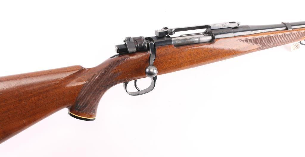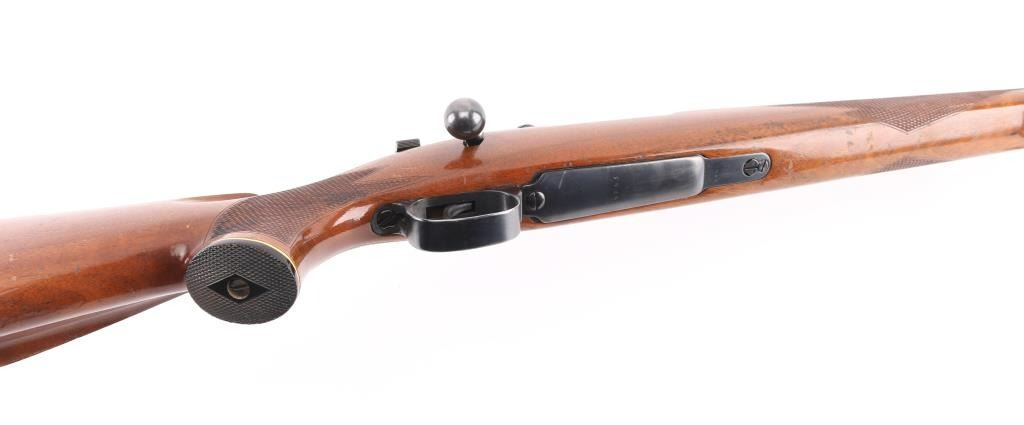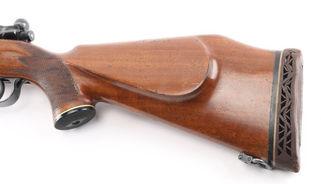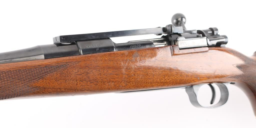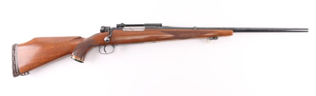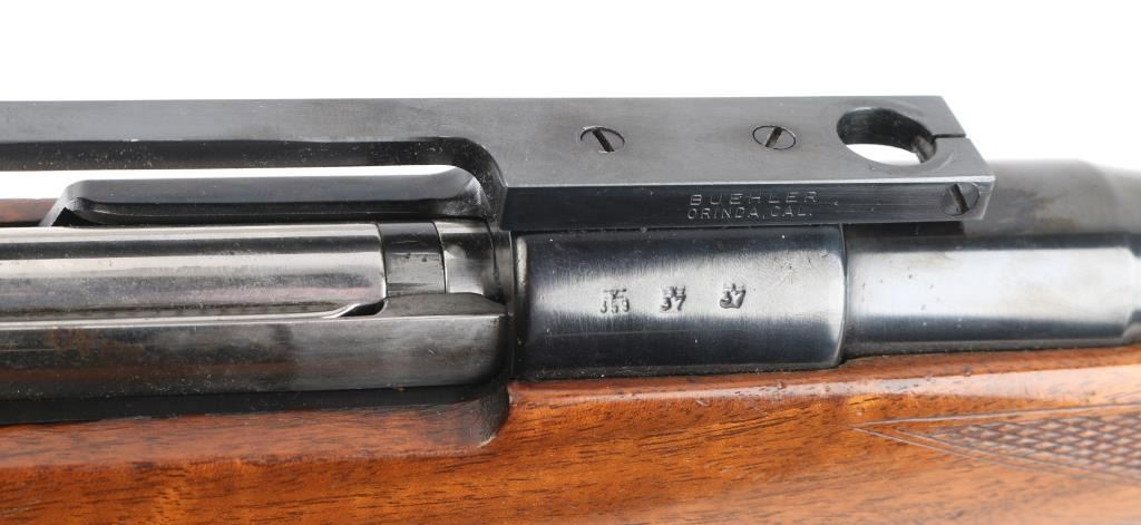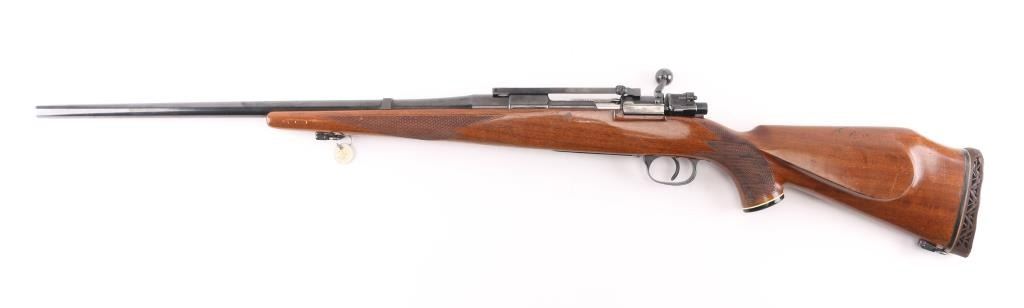 '147 1939' marked German military bolt action rifle, sporterized and customized into a sporting rifle. Features blued finish, 22.5" barrel without sights, large recoil lug on barrel, Buhler one piece scope base, swept bolt handle, two position low swing safety. Wood sporter stock has checkered panels at forend & sides of curved wrist, right hand cheekpiece, ventilated rubber recoil pad, sling studs with detachable swivels. Bore is very good condition. Retains 90% high polish reblue, showing handling wear, losses to sharpness of markings. Stock is very good overall, shows use, with poor condition recoil pad. Caliber not marked on barrel, needs to be verified by gunsmith. Condition is NRA Very Good (as modified) *** C&R Firearm ***