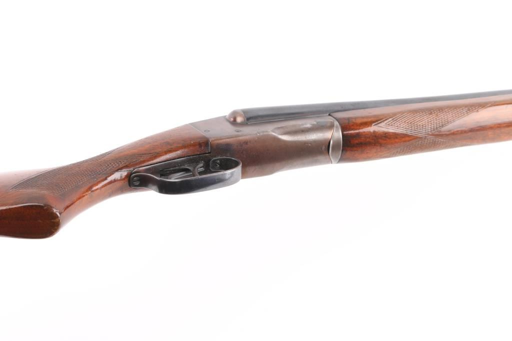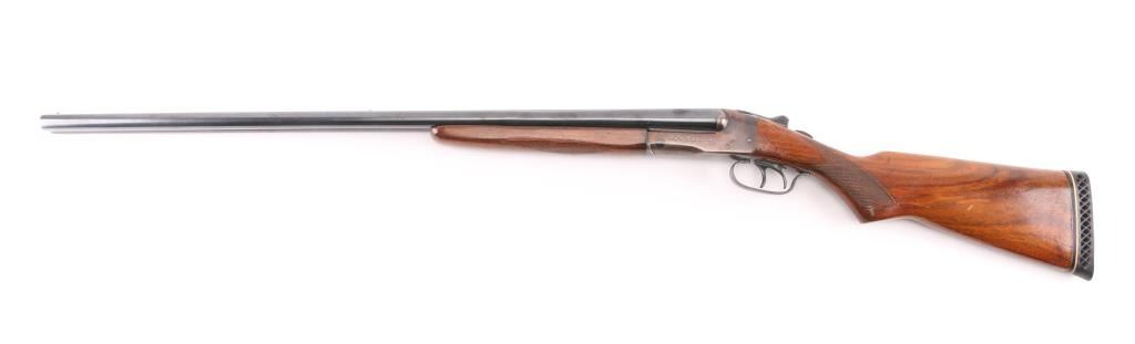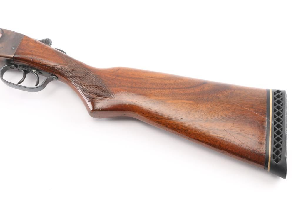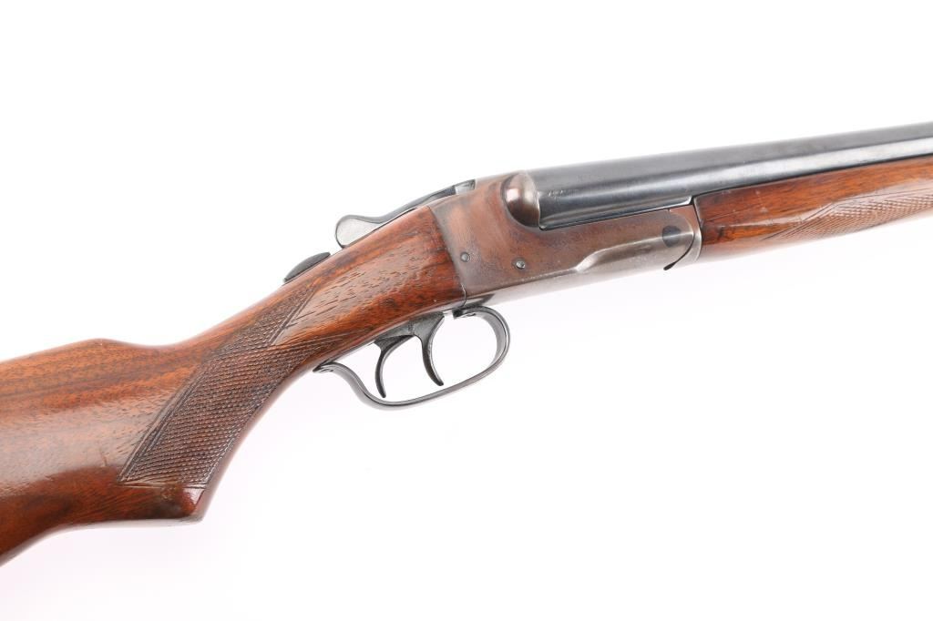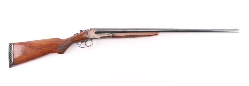 Early trade name internal hammer box lock shotgun probably made by Stevens for sale by Sears. No shell length marking. Features blued finish, checkered wood stocks, 28" barrels, Brass front &mid beads, low serrated rib, choked Cyl (L) & IC (R), double triggers, extractor, tang safety (resets to 'safe' when top lever moved), ventilated rubber recoil pad. Approx stock measurements: 14.25" LoP, 1.75" Drop at Comb, 2.5" Drop at Heel. Bores are dirty, very good condition. Retains 90% blue on barrels, appears polished & reblued, with visible solder along ribs. Receiver is a coppery or plum color. Wood is good or better condition, varnish added over previous scrapes and dings. Recoil pad is good condition, fair fit. Condition is NRA Very Good (refinished) *** Modern Firearm ***
