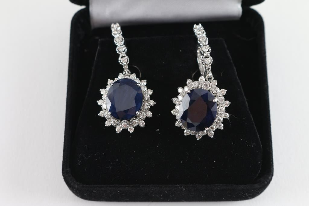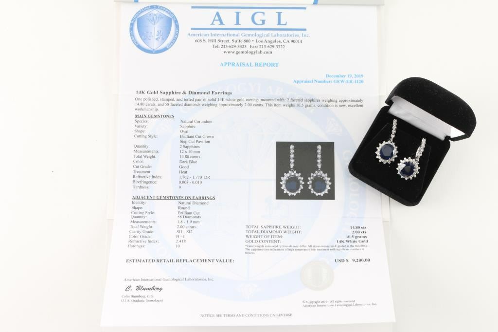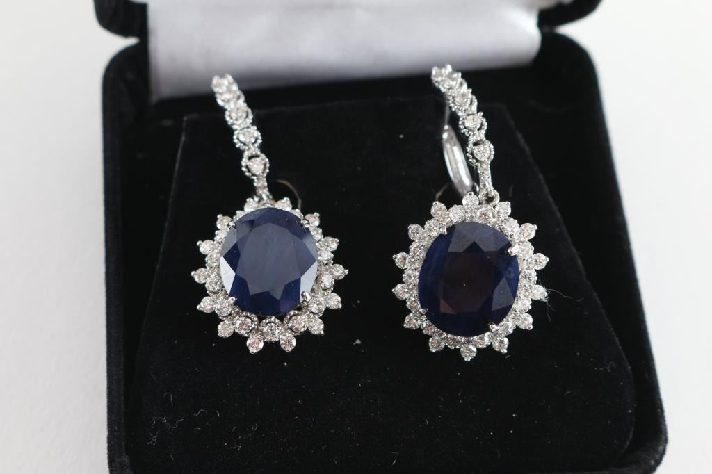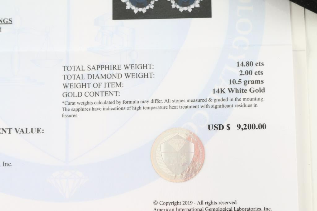 14.80cts dark blue Sapphires oval cut brilliant cut surrounded by 2.00cts of round cut brilliant diamonds H-I color, dangle style set in 14KT white gold. Includes an appraisal report from AIGL stating replacement value is 9200.00.