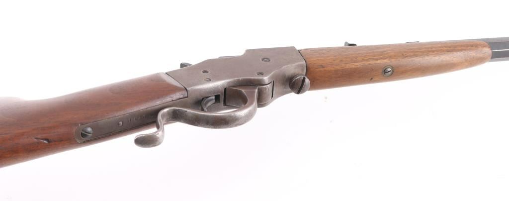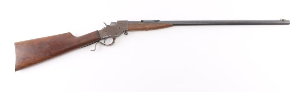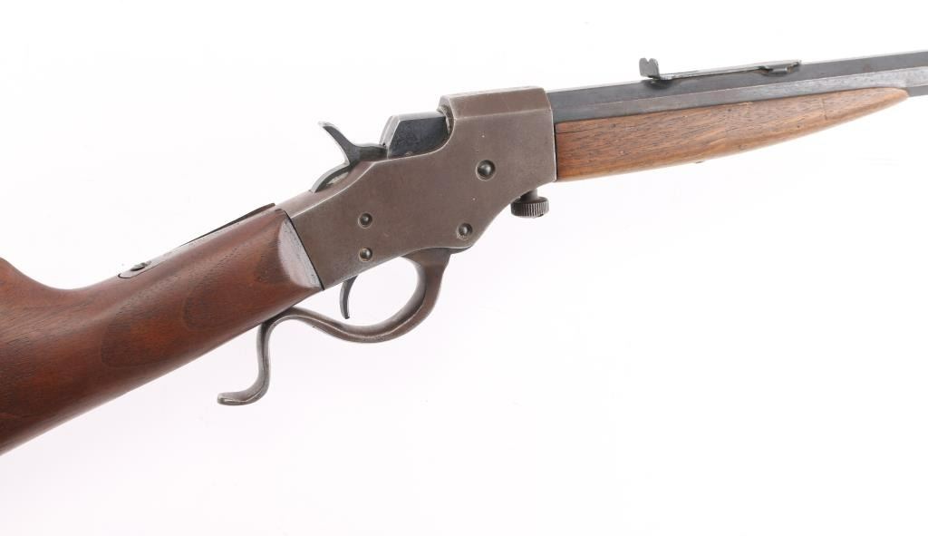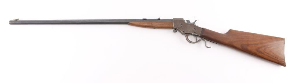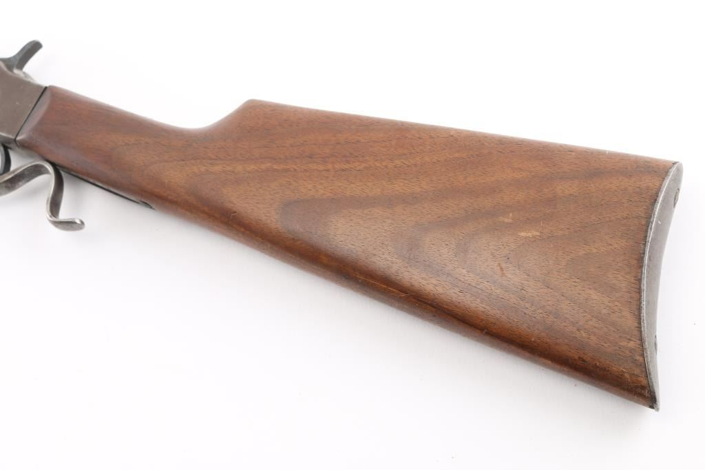 Vintage single shot rimfire rifle, manufactured circa 1915-1940. Lever operated falling block, exposed hammer must be manually cocked to fire. Features blued finish, 24" octagon barrel, dovetailed blade front sight, sporting rear sight dovetailed into barrel, takedown screw under front of receiver, steel butt plate, two piece smooth walnut forend & straight gripped shoulder stock. Bore appears very good, needs cleaning. Blued barrel has dulled with some small areas of pin-prick pitting Wood is very good overall with some minor scratches. Condition is NRA Good+ C&R Firearm.