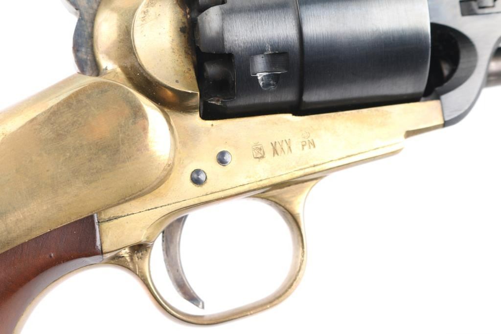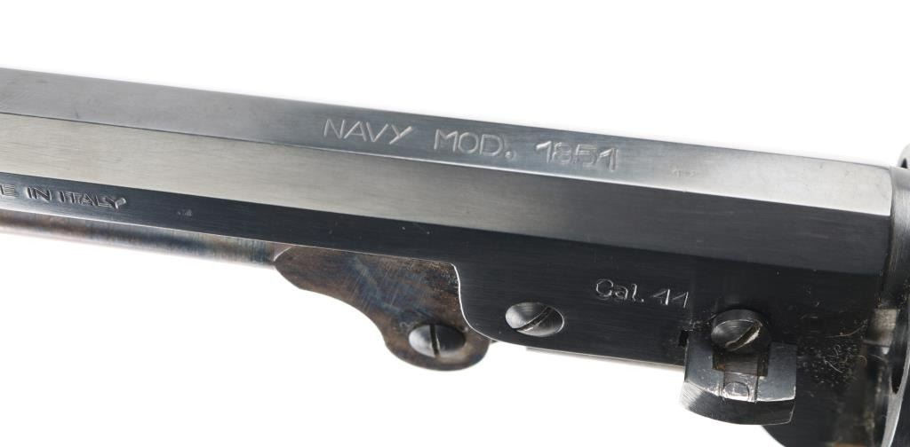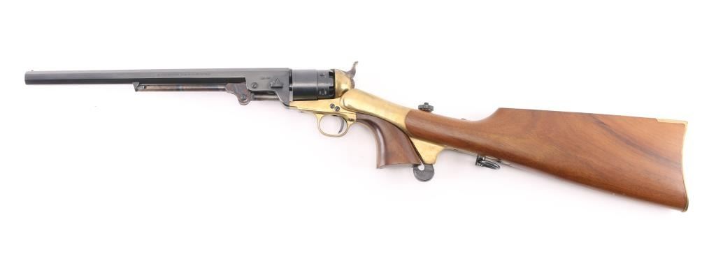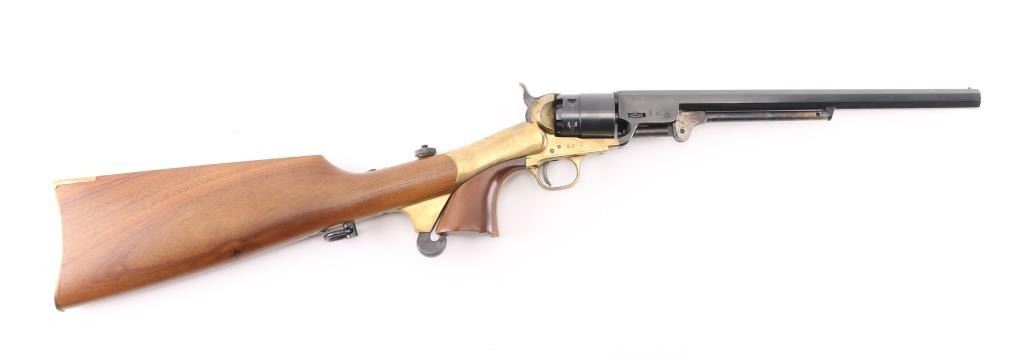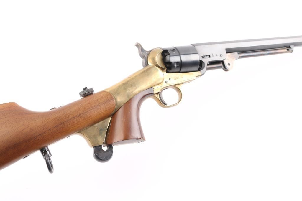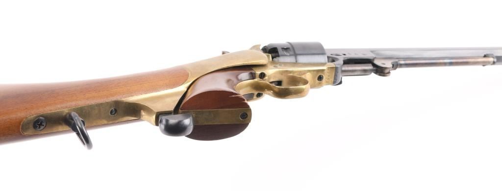 Italian made replica of the Colt 1851 navy revolver, altered to 44 caliber, with rebated cylinder and stepped frame. Features blued finish, brass frame, brass back strap & round triggerguard, 12" octagon barrel, brass post front sight, "V" notch rear sight on hammer nose, case colored loading lever, one piece smooth walnut grip, smooth walnut shoulder stock, saddle ring under stock wrist. Appears unfired. Very good bright bore. Retains 95% finish, with edge losses and handling marks. Brass shows mellow color with slight patina throughout. Wood is very good with dents and scratches. Action is stiff, with tight lock up. Condition is NRA Very Good++ *** 'Antique' Firearm ***