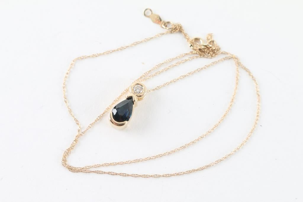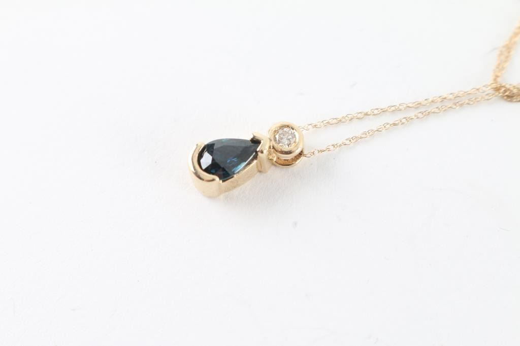 set in 14kt yellow gold on 14kt gold chain. Tear drop shape sapphire with single small diamond above it.