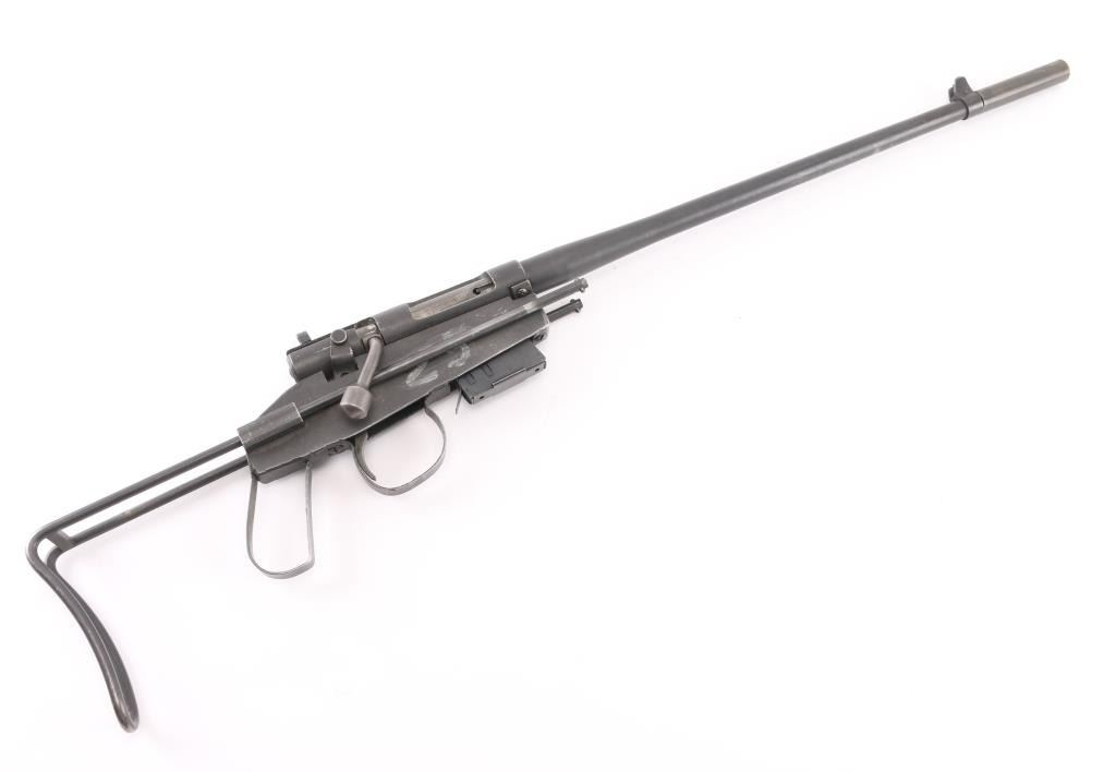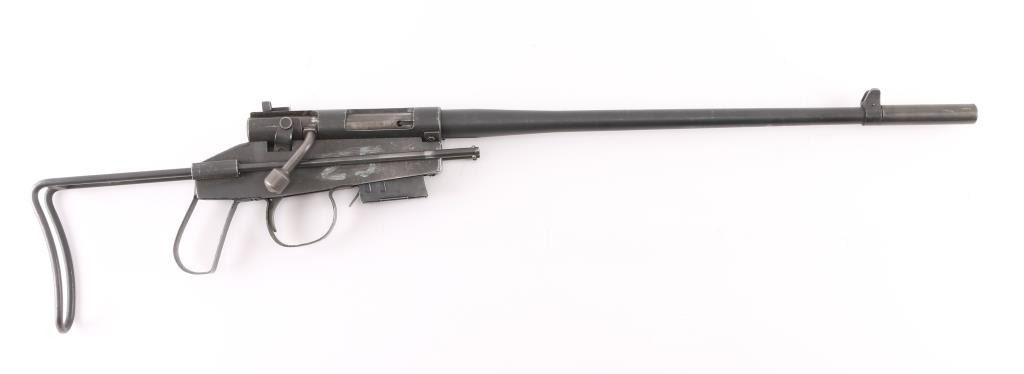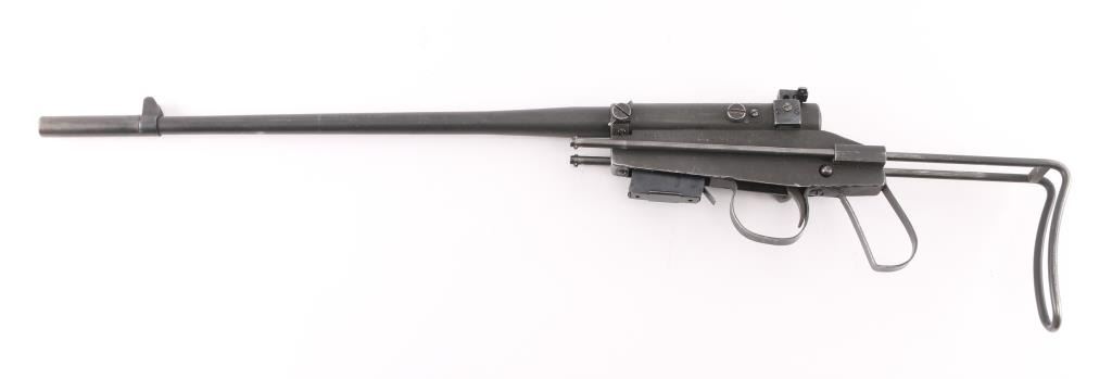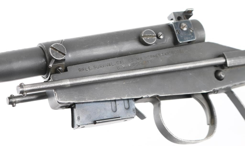 SN: 28514 USAF issued take down survival rifle, circa 1950's. All steel construction, with collapsing wire stock, 17" barrel (including welded tube at muzzle, to increase length ), detachable 5 round magazine, protected blade front sight, Lyman peep rear sight, manual safety. Bore is very good. Retains 85% gray matte finish with edge losses, rubbing wear on moving parts. Marked "US PROPERTY" on receiver. "25" in white paint on right side of receiver. Barrel numbered to receiver. Action does not cock, trigger stays to rear, needs repairs. Visible rust on internal trigger parts. Condition is NRA Good++ (mechanical issue) *** C&R Firearm ***
