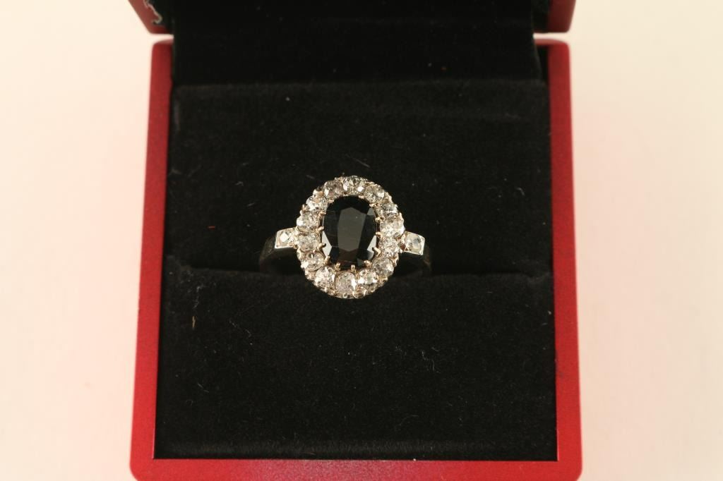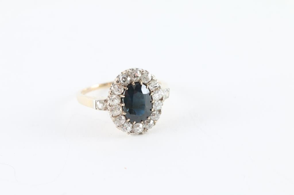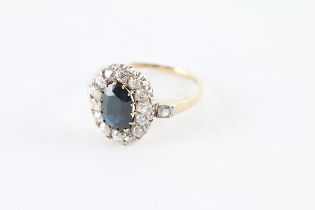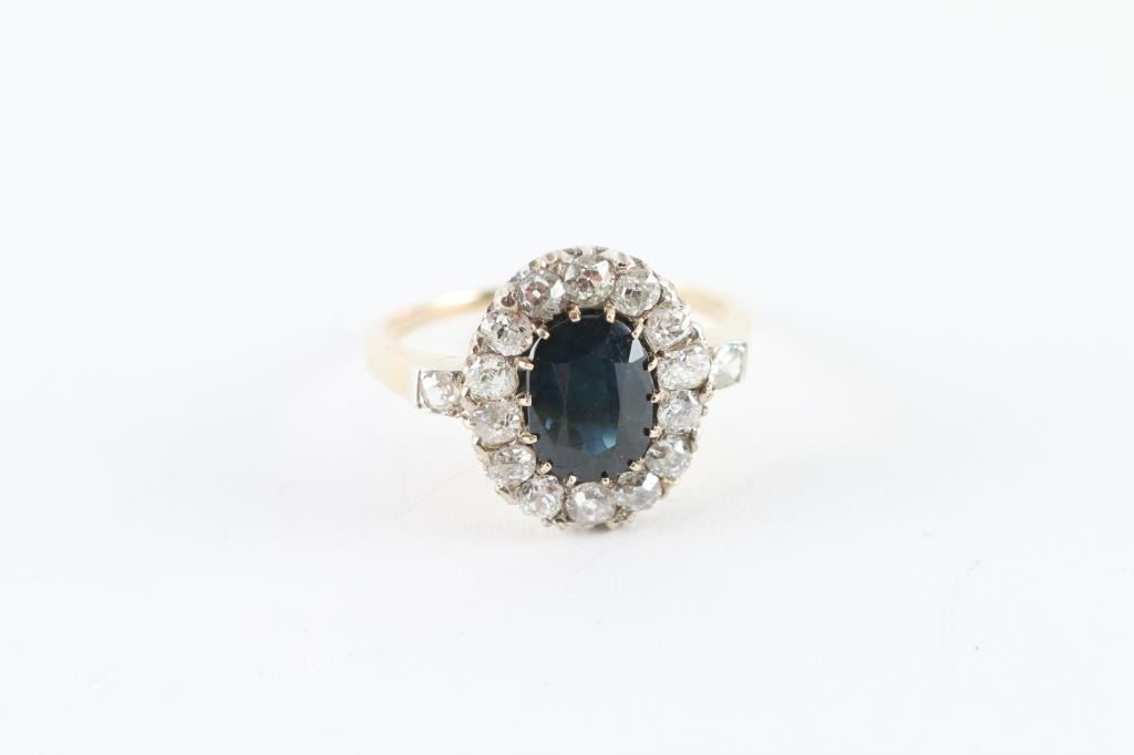 and Diamond Ring featuring an old cushion cut Blue Sapphire weighing 2.55 carats accented by 16 Old Mine Cut Diamonds weighing approx. 1.00 carats set in a two-tone gold original antique setting.